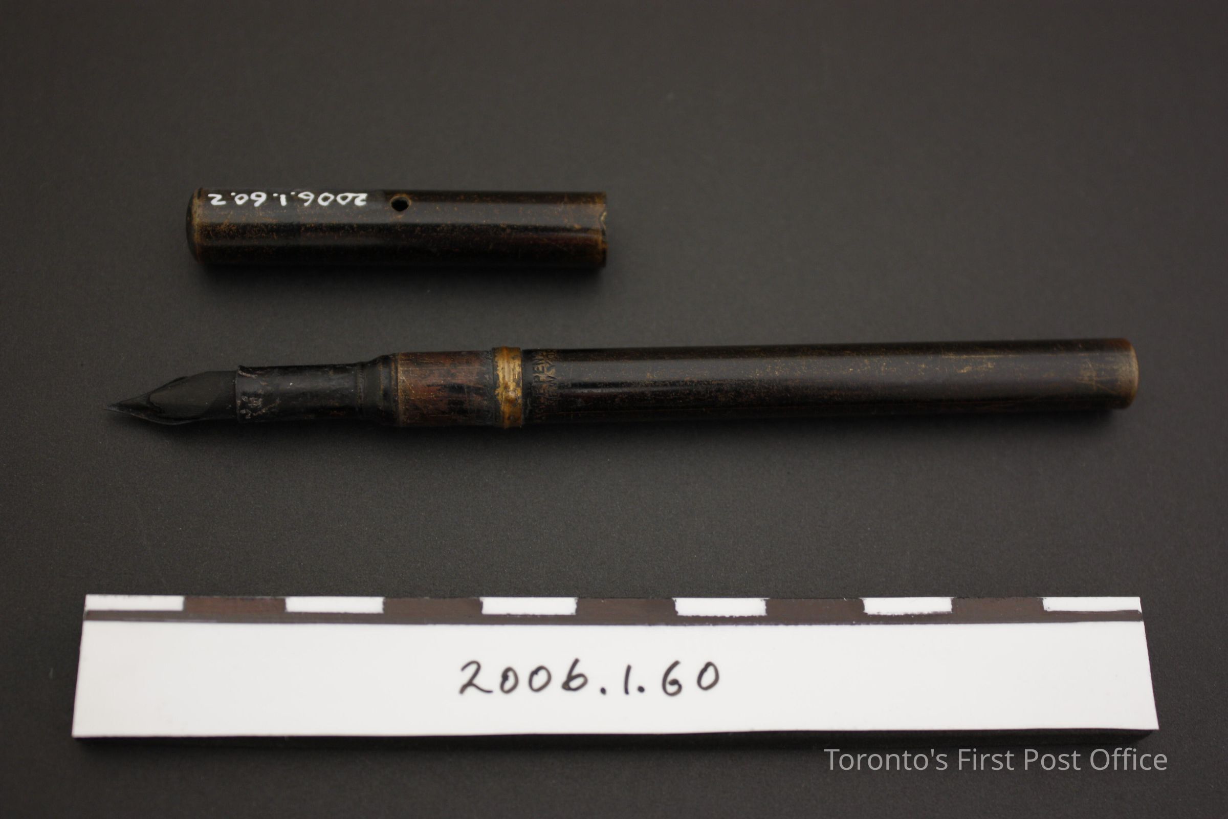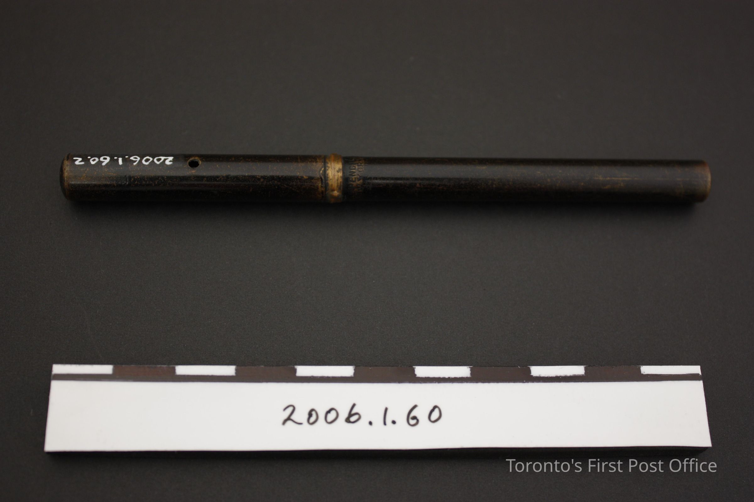 Pen with lid; all black metal (possibly coated brass) with gold-plated steel nib; stamped "EAGLE PENCIL CO NEW YORK"; small hole (0.2 cm Ø) midway along lid; wooden insert within nib.Update Date