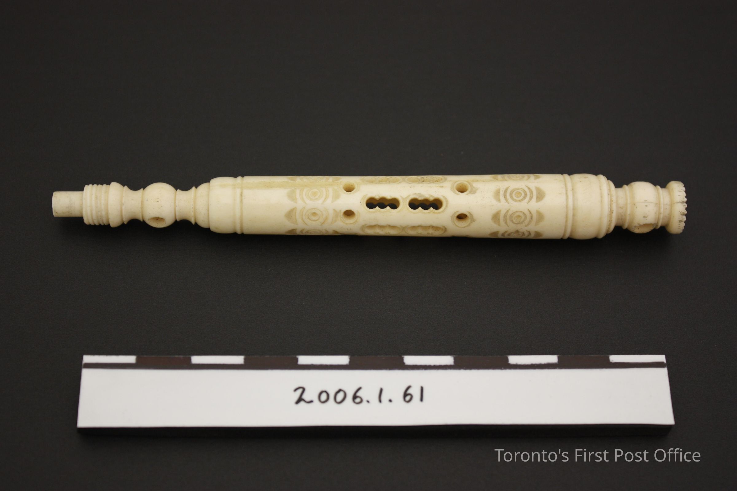 Pen with bone shaft; turned and hand-carved in circle and half-moon design; threading for missing piece at base; cross-hatch seal at top, threaded to screw off; no nib.Dimensions