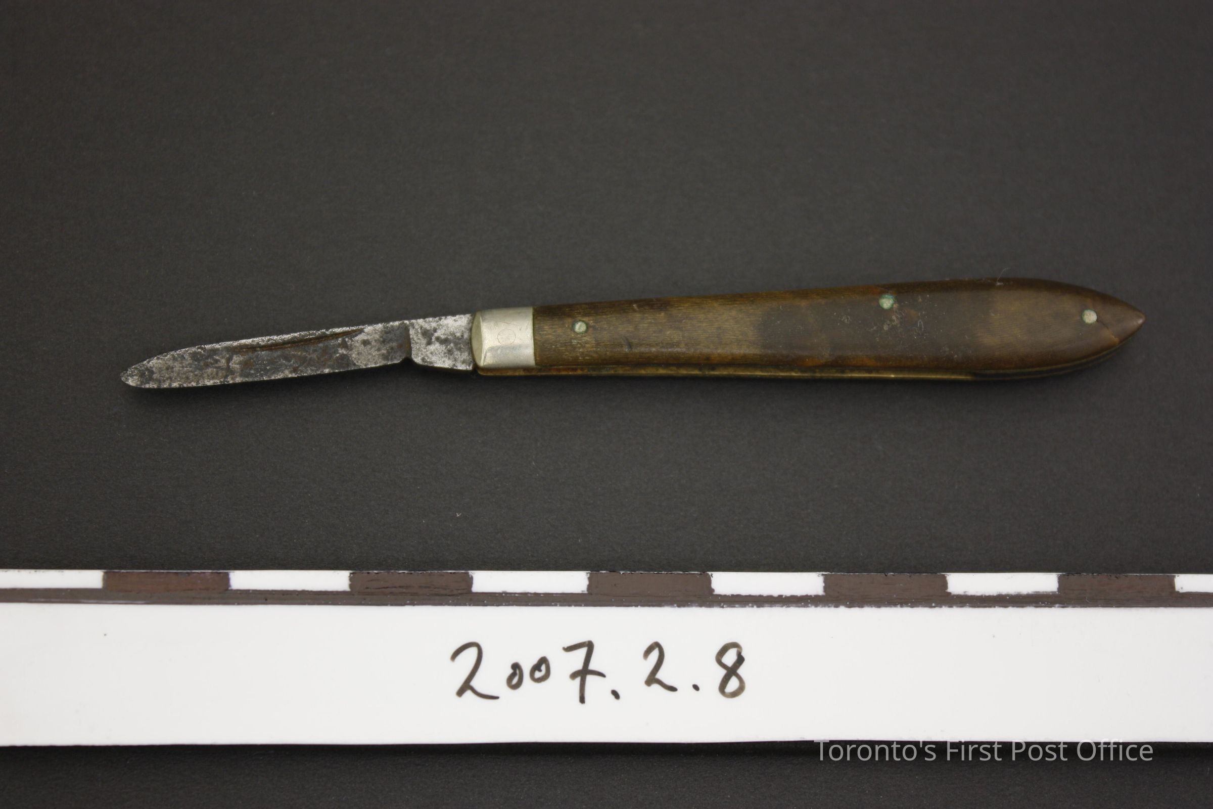 Pen knife with horn sides; brass lines; nickel-silver cap; three pins in each side; teardrop shape sides; one blade; no markings; c. 1840-50.Dimensions
