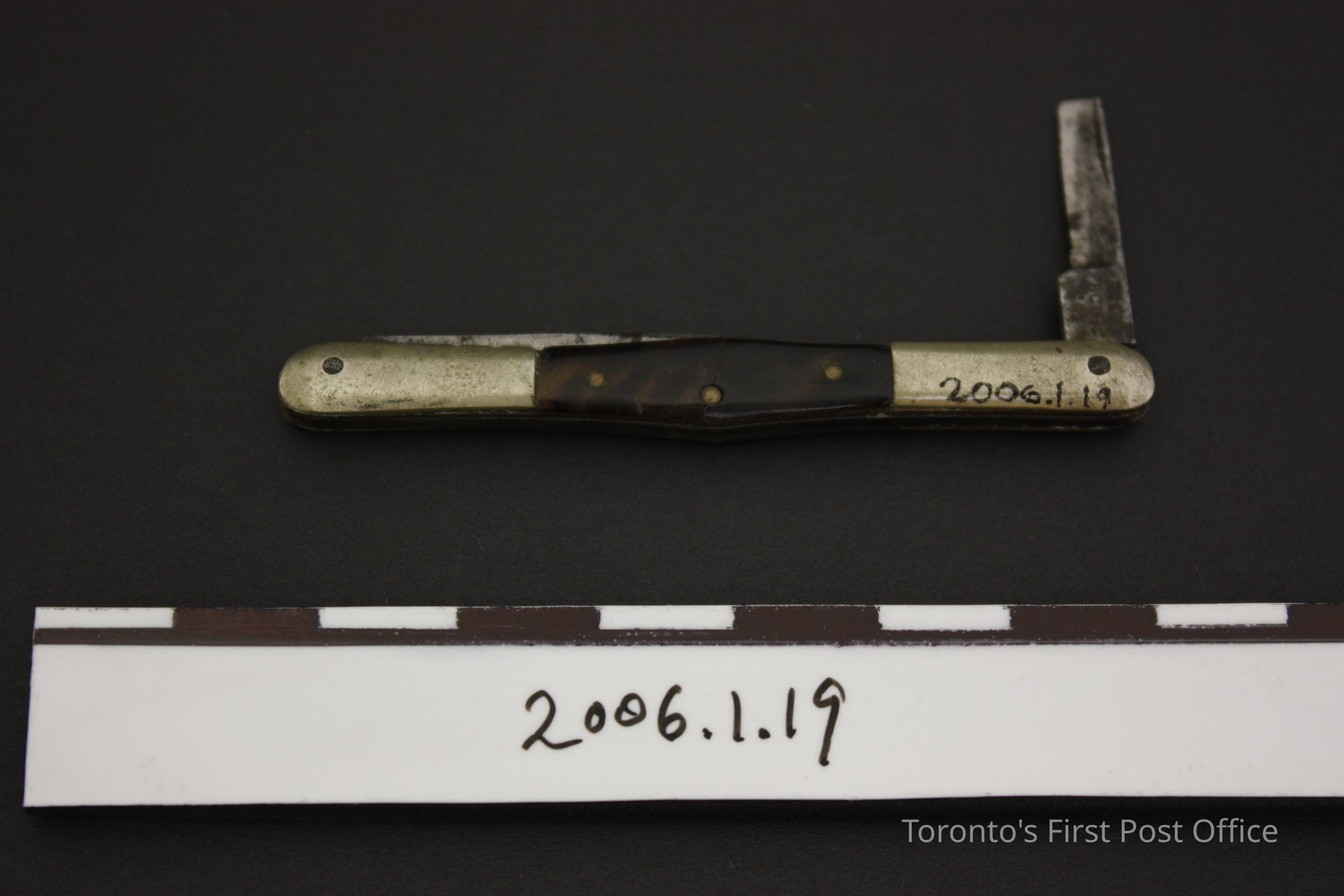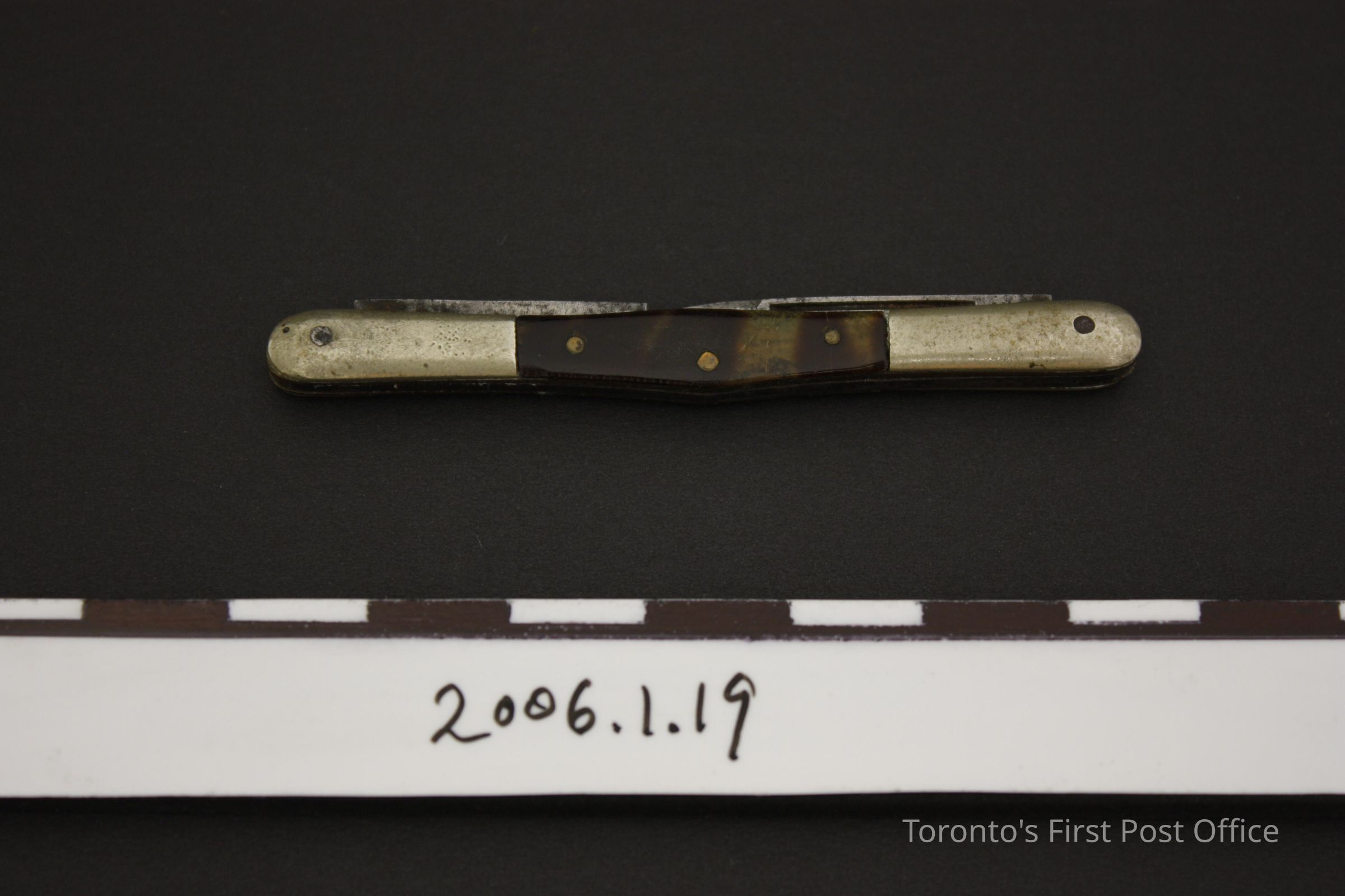 Pen knife with tortoise shell and yellow metal sides; two steel blades; five pins in each side; marked "ANGLO PACIFIC & CO." on both blades; circa 1880-1890.Update Date