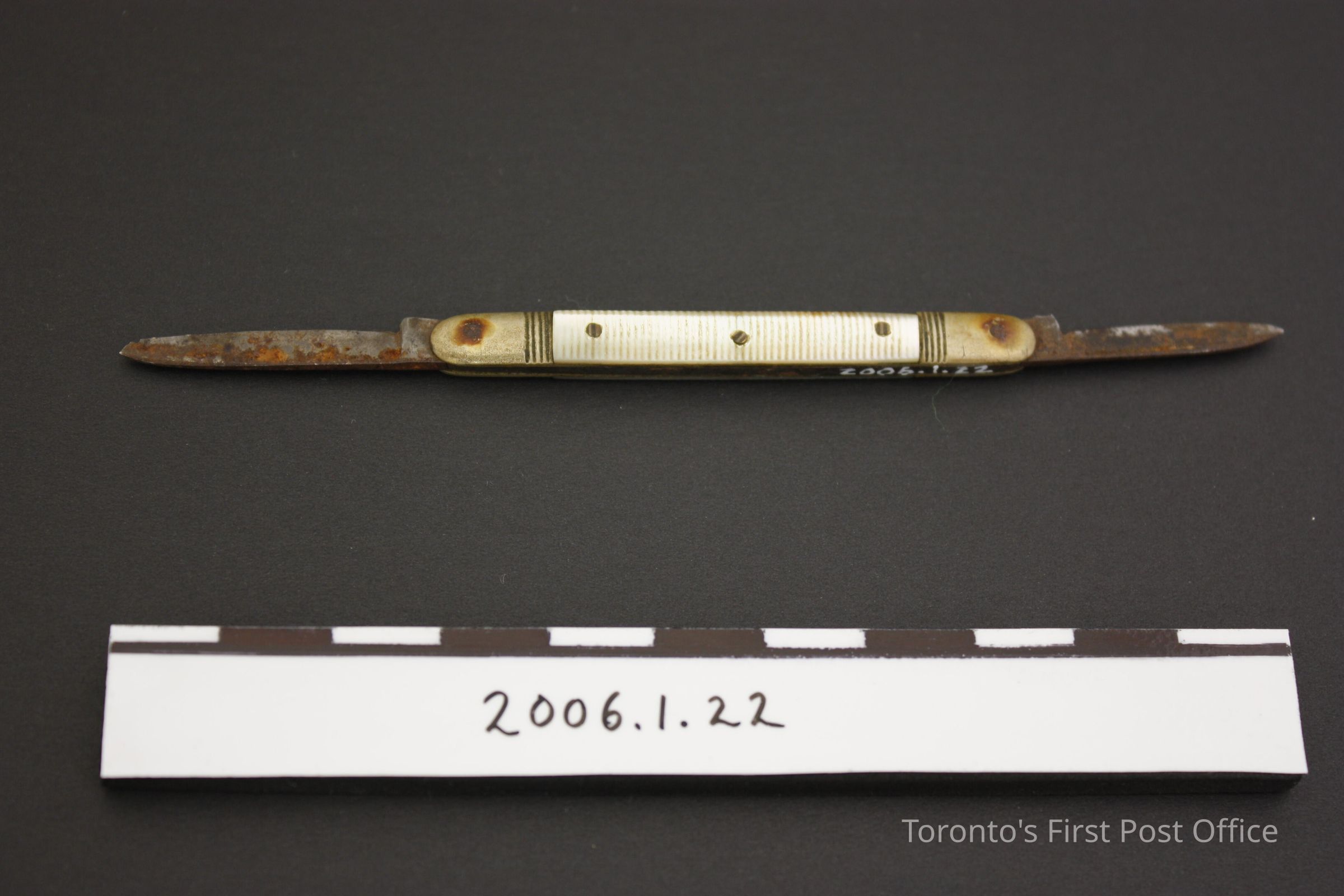 Pen knife with mother-of-pearl and yellow metal sides; two steel blades; mother-of-pearl is ribbed; marked "UNITED CUTLERY CO GERMANY" on both blades; five pins on each side; circa 1896-1900.Dimensions