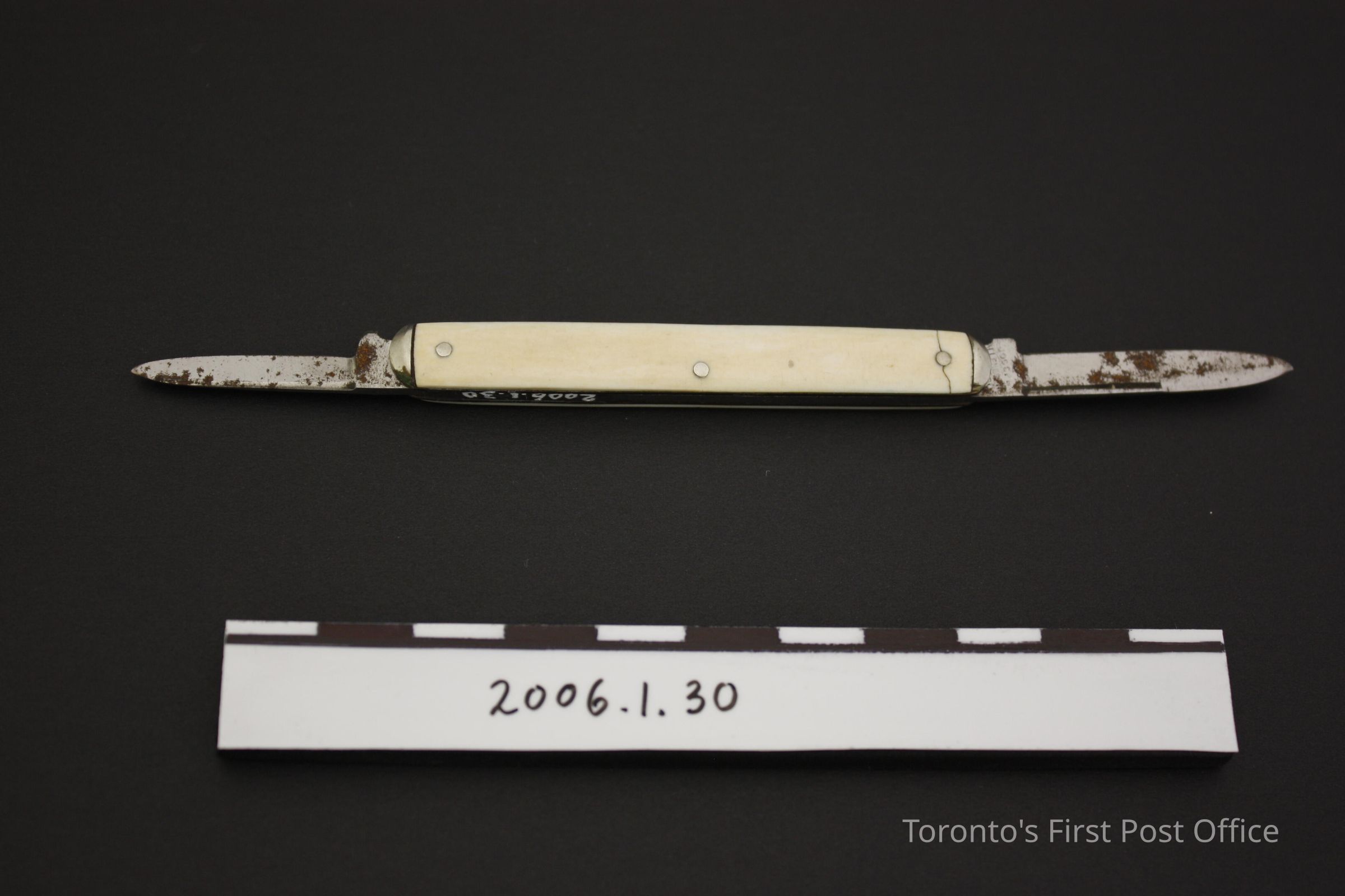 Pen knife with bone and metal sides; two steel blades; three pins on each side; marked "JOSEPH ALLEN & SONS SHEFFIELD ENGLAND" on one blade, "SHEFFIELD ENGLAND" on other.Dimensions