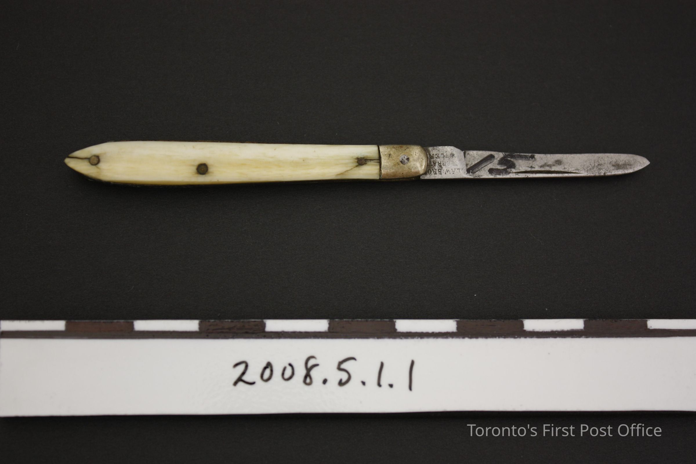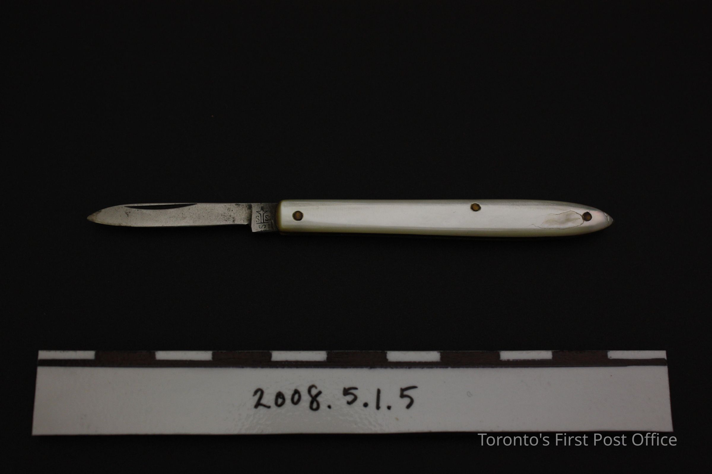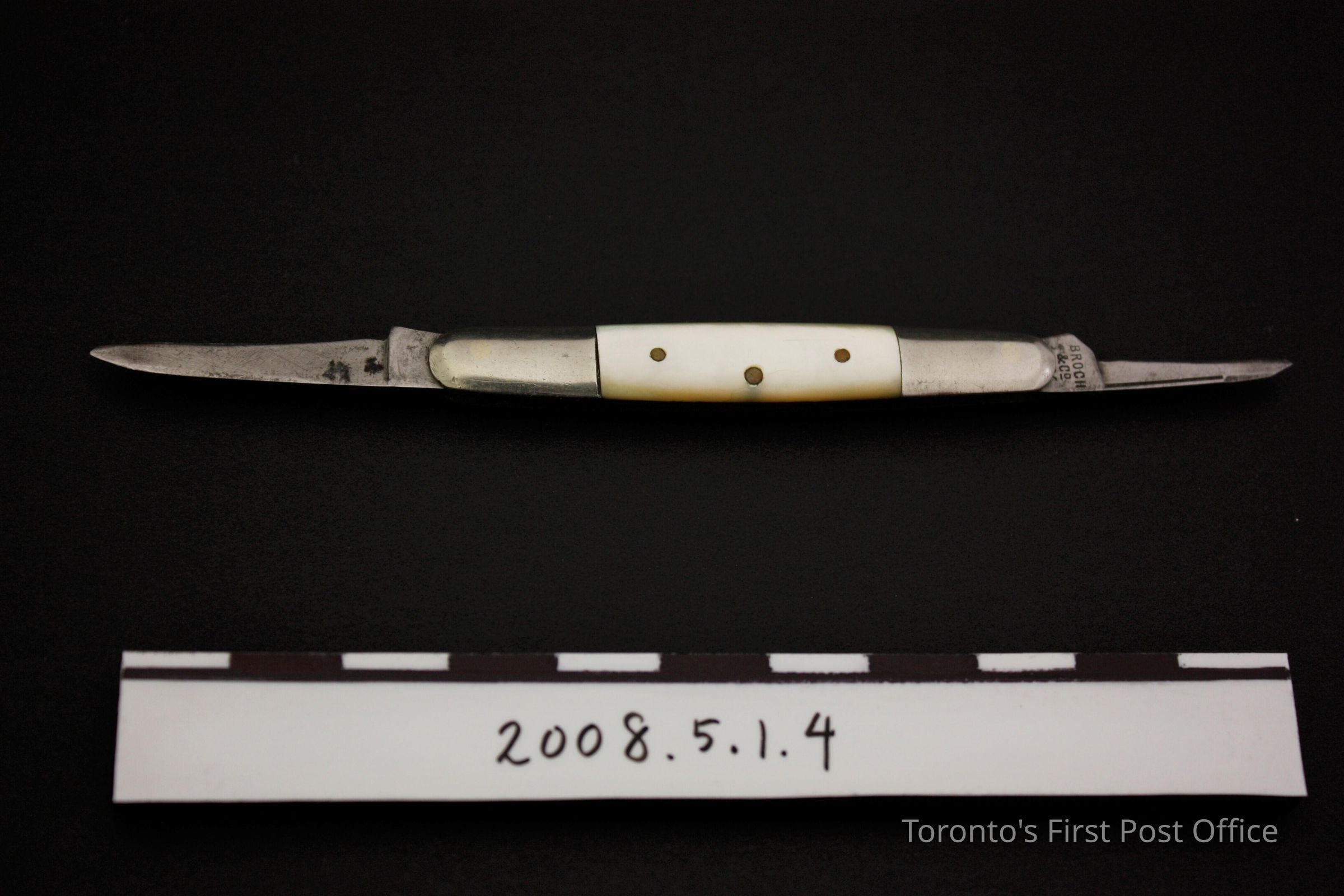 Five pen knives, as follows: .1: single blade, blade marked "LAW BROS CELEBRATED CUTLERY", ivory sides with 1 brass cap each side, 4 pins each side; marker on blade: "15", c. 1870-80; .2: double bladed, blades marked "ARGYLE CUTLERY CO GERMANY" (some letters obscured), cut mother-of-pearl sides with two long brass caps on each side, 5 pins each side, c. 1910; .3: double-bladed, blades marked "UNITED CUTLERY CO GERMANY" (some letters obscured), pearl sides and two long brass caps on each side, 5 pins each side, c. 1910; .4: double-bladed, blades marked "BROCH & CO. N.Y.", pearl sides, 2 long metal caps on each side, 5 pins each side (2 well hidden), c. 1930-40; .5: single blade, symbol on blade involves 3 "5"s, pearl sides, no caps, 3 pins on each sides, paper label on one side marked "18-" in marker, c. 1940-50.Dimensions