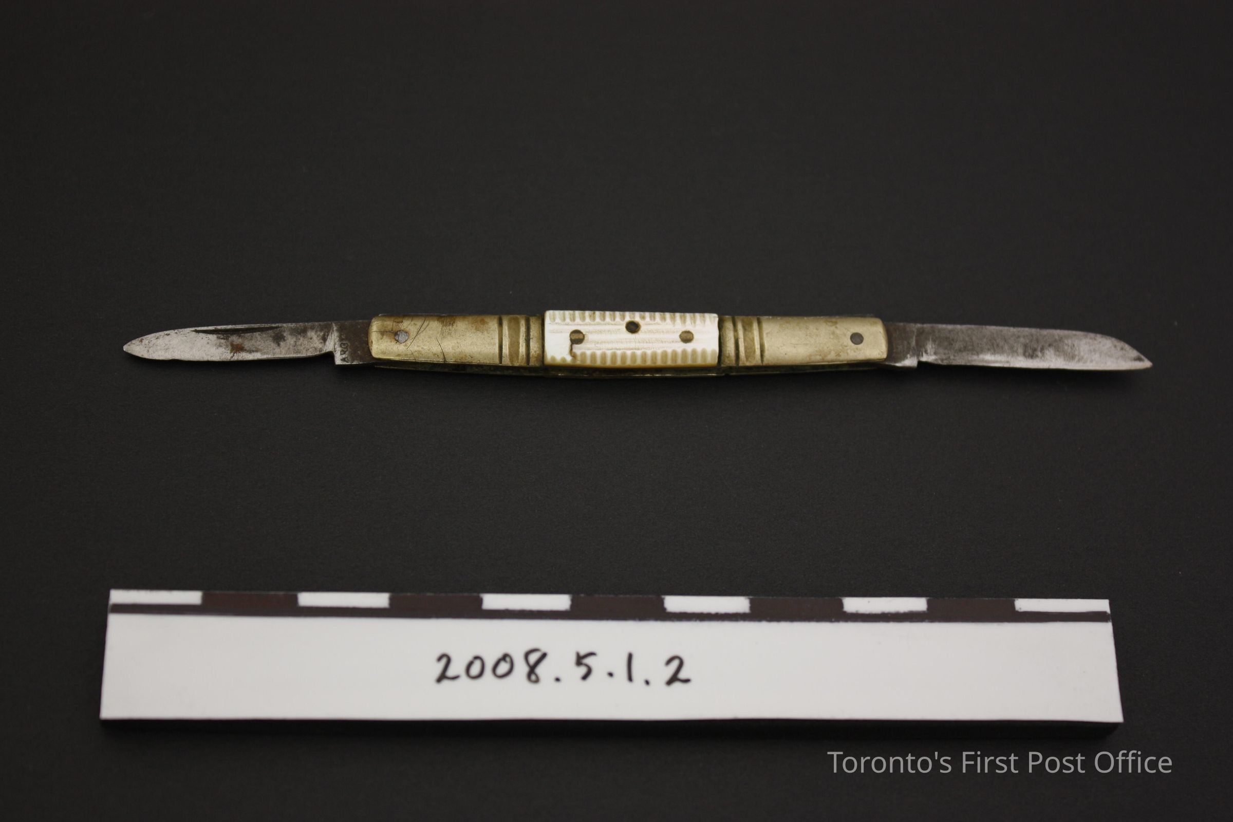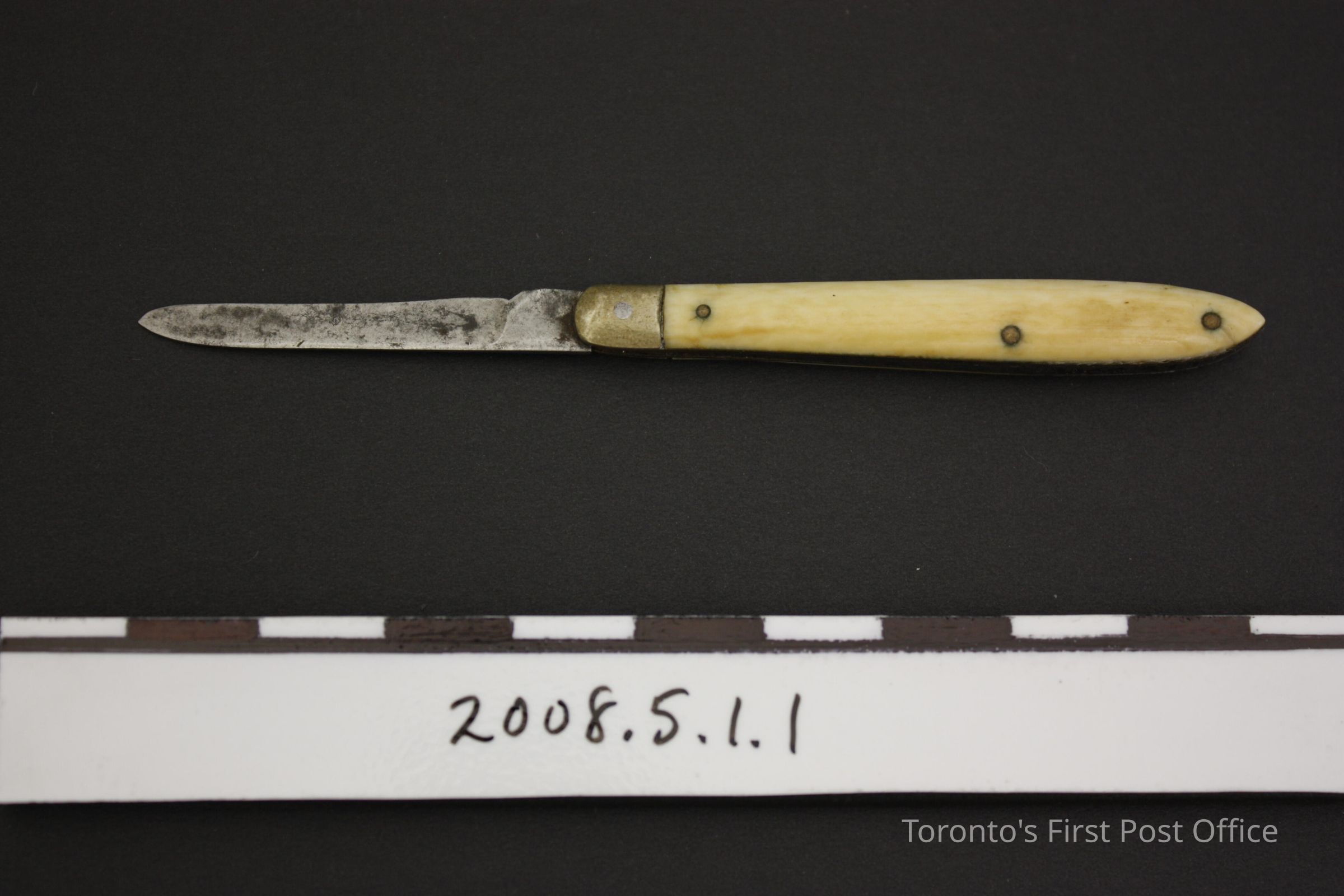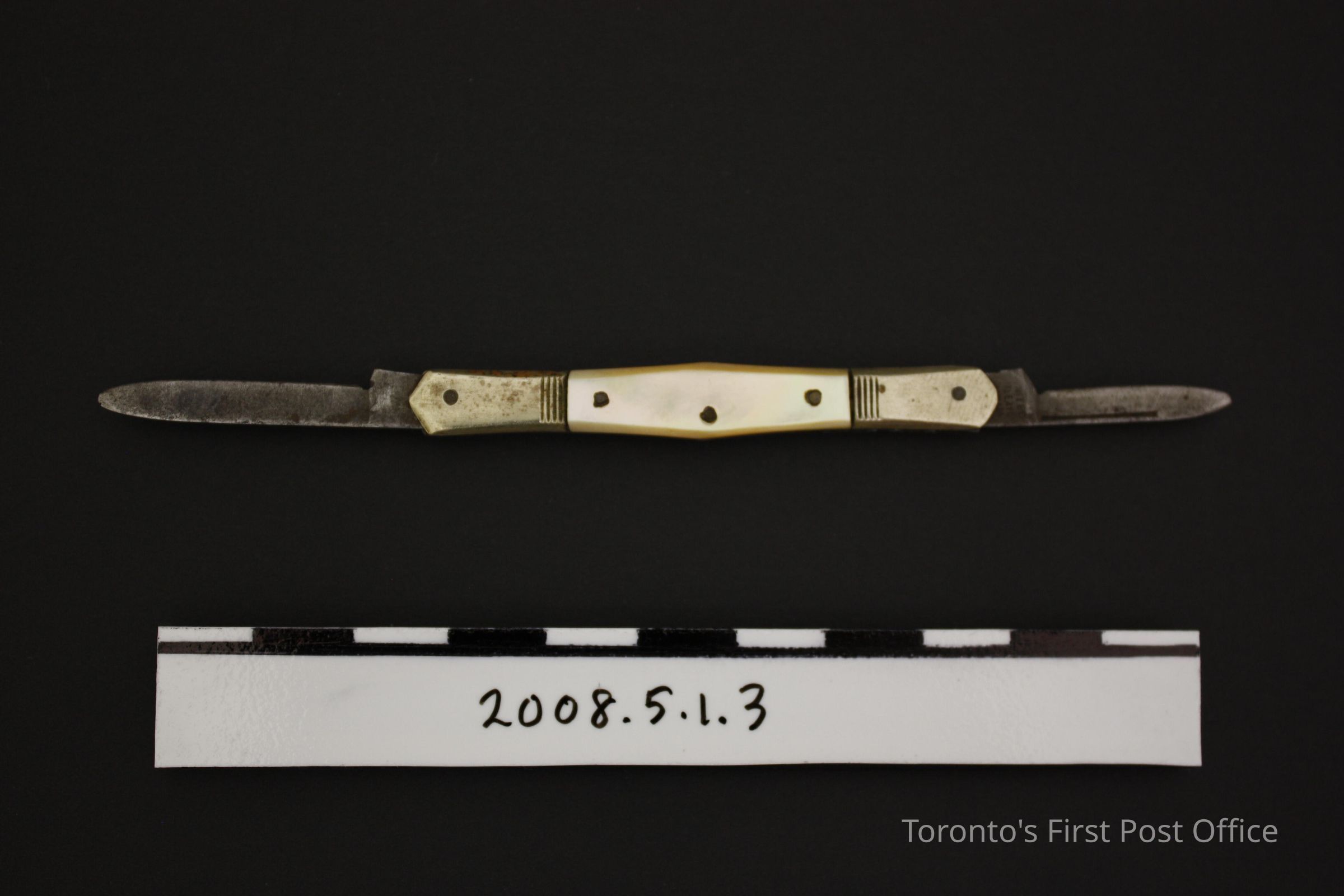 Five pen knives, as follows: .1: single blade, blade marked "LAW BROS CELEBRATED CUTLERY", ivory sides with 1 brass cap each side, 4 pins each side; marker on blade: "15", c. 1870-80; .2: double bladed, blades marked "ARGYLE CUTLERY CO GERMANY" (some letters obscured), cut mother-of-pearl sides with two long brass caps on each side, 5 pins each side, c. 1910; .3: double-bladed, blades marked "UNITED CUTLERY CO GERMANY" (some letters obscured), pearl sides and two long brass caps on each side, 5 pins each side, c. 1910; .4: double-bladed, blades marked "BROCH & CO. N.Y.", pearl sides, 2 long metal caps on each side, 5 pins each side (2 well hidden), c. 1930-40; .5: single blade, symbol on blade involves 3 "5"s, pearl sides, no caps, 3 pins on each sides, paper label on one side marked "18-" in marker, c. 1940-50.Dimensions