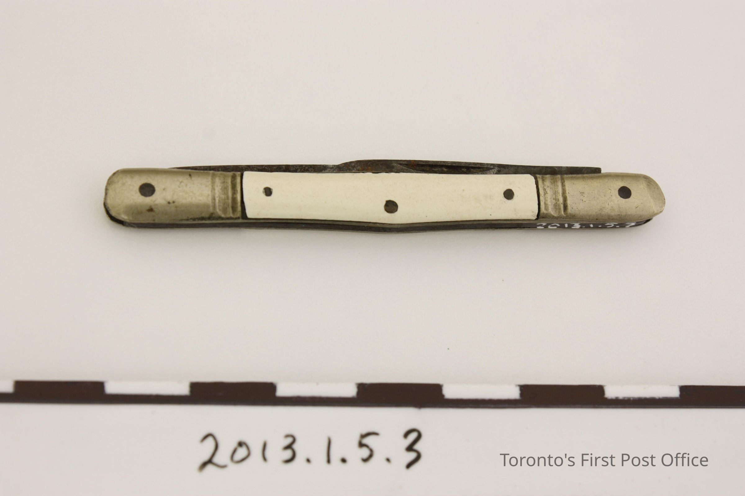 Pen knife. Two-blade, collapsible knife. Steel blades held within a light yellow alloy outer case with white enamel inlaid sides. Enamel inlays are attached with three (3) metal pins. Blades are marked 'Argyle Cutlery Germany'. Circa 1880-1890.Made/Created