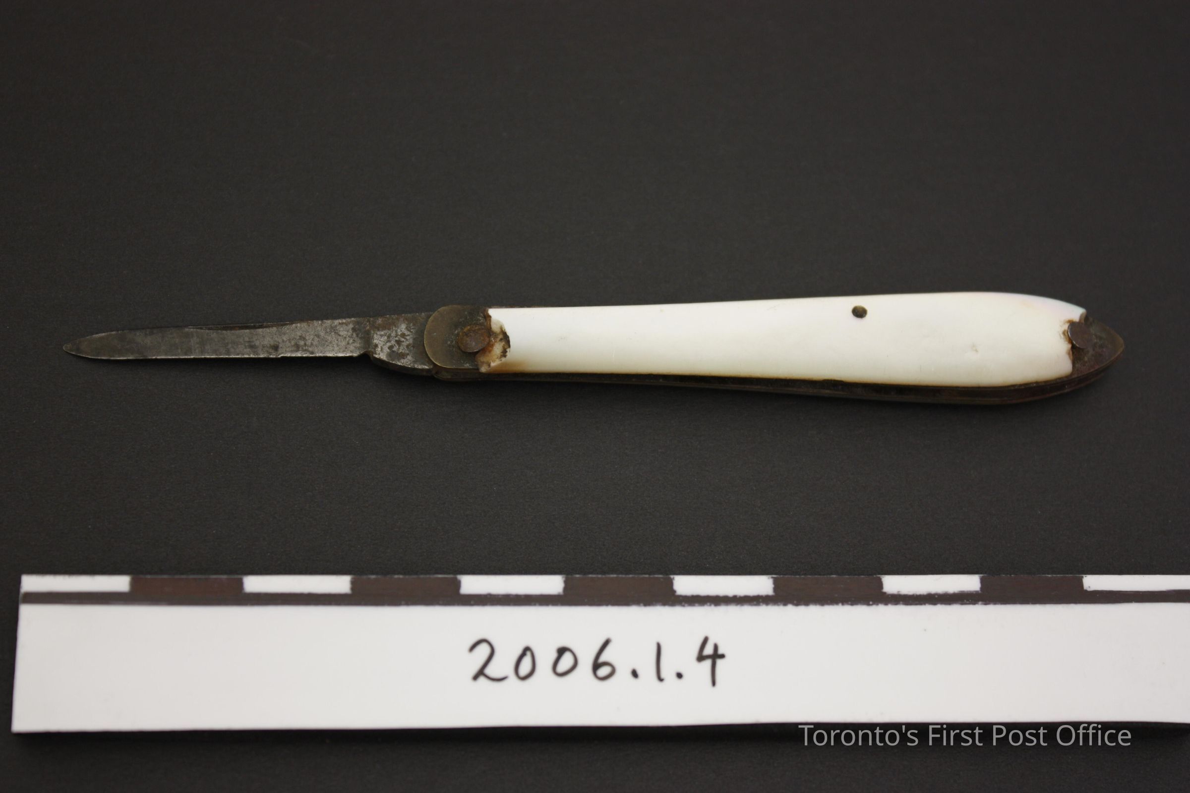 Pen knife with mother-of-pearl sides; one steel blade; elongated teardrop shape; three pins along sides; two pins on one side larger than others; marked "PARRIN & GOMIR" at base of blade; circa 1830.Dimensions