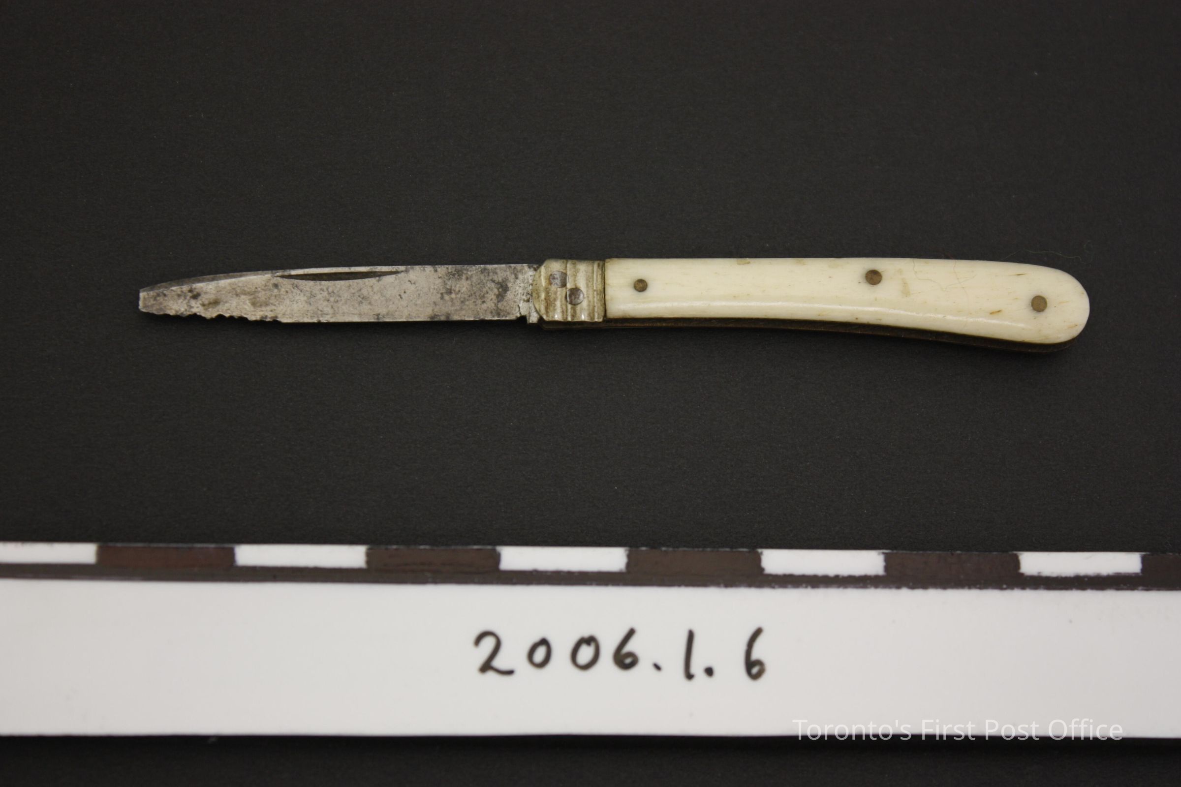Pen knife with bone sides; steel tip and blade; five pins on each side; circa 1830.Dimensions