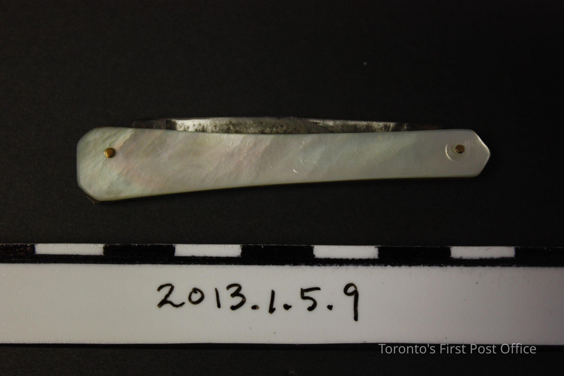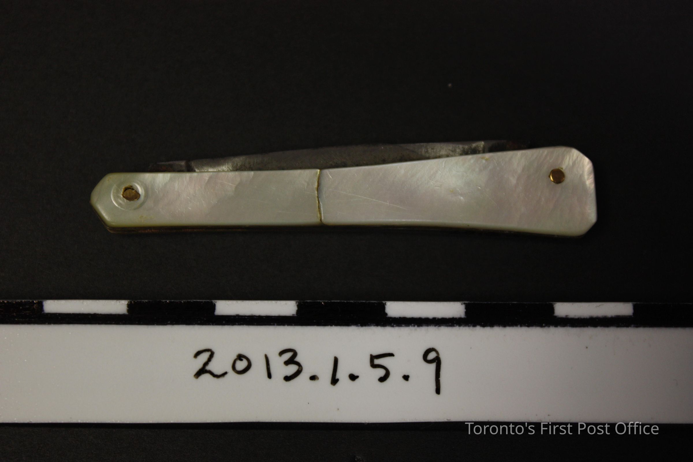 Pen knife. Two-blade, collapsible knife. Steel blades in brass outer case with mother of pearl panels on either sides. Mother of pearl panels are attached with two (2) pins. Knife shape tapers, measures 1.2 cm width at one end and 0.7cm width at the opposite end. Circa 1910-1920.Made/Created