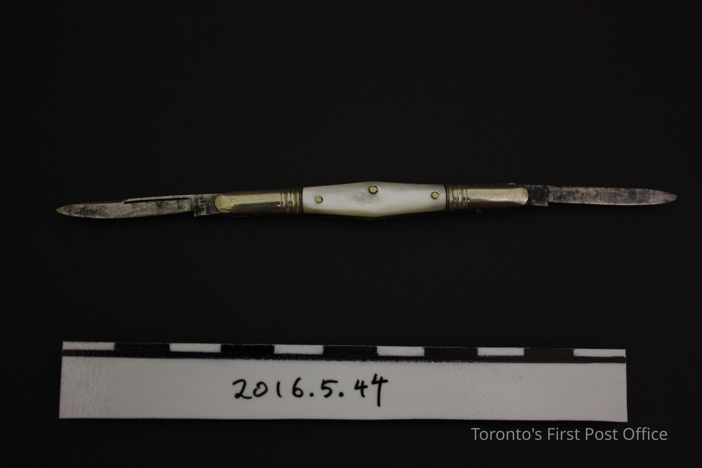 Pen knife. Two steel blade, collapsible knife in silver or nickel (?) outer case with mother of pearl inlaid sides. Inlays are attched with three (3) pins. Blades are marked 'J Dunbar & Co.'Update Date