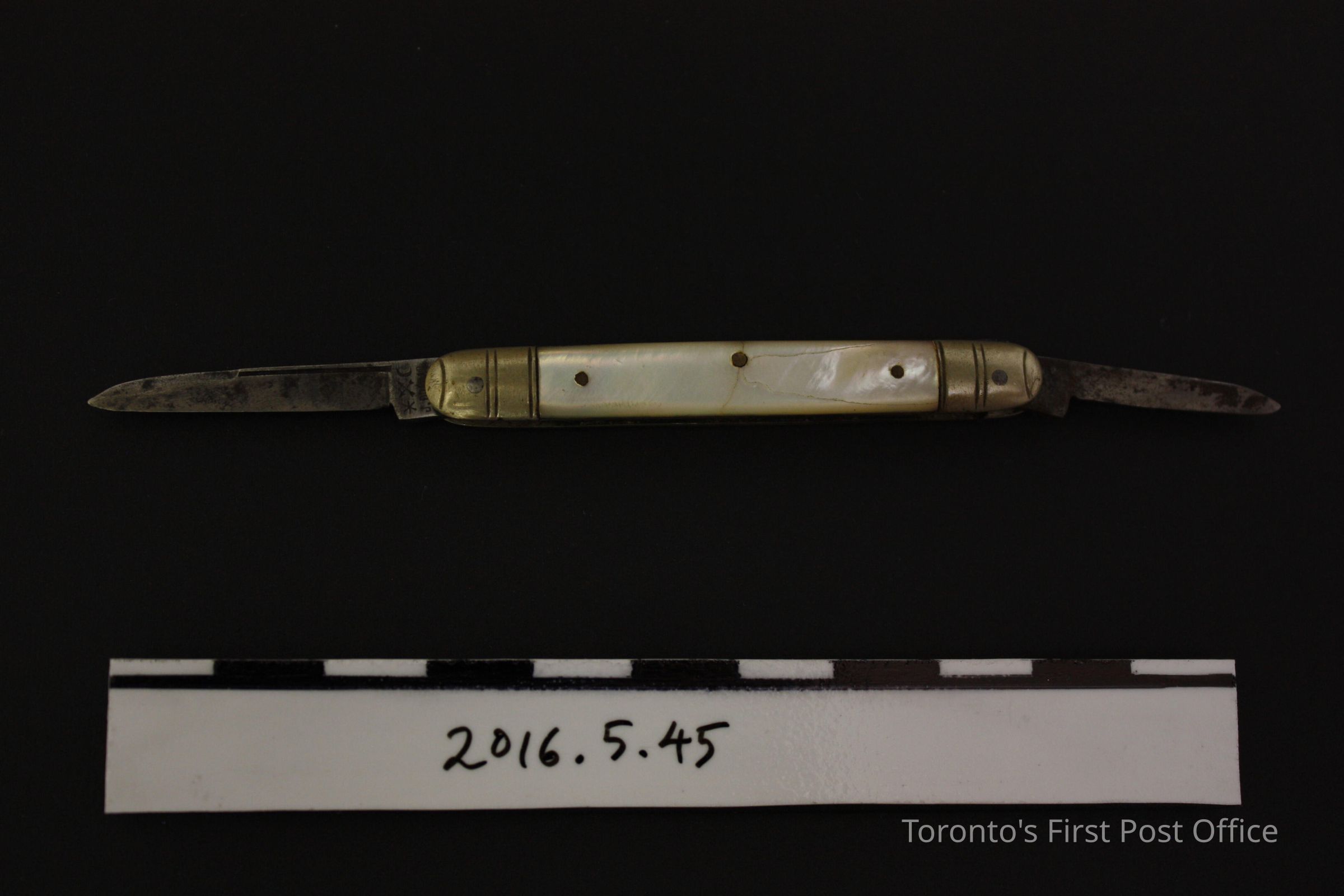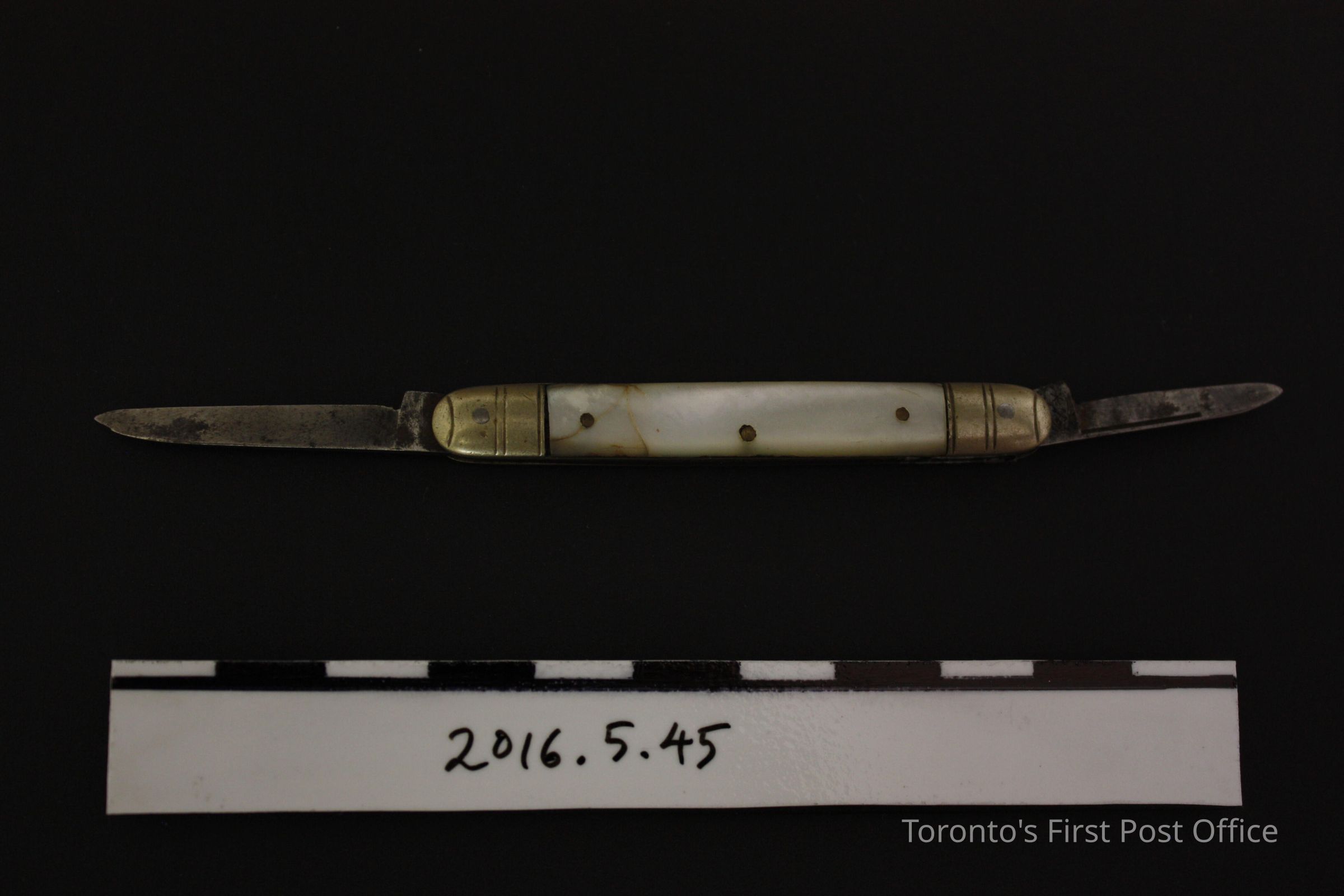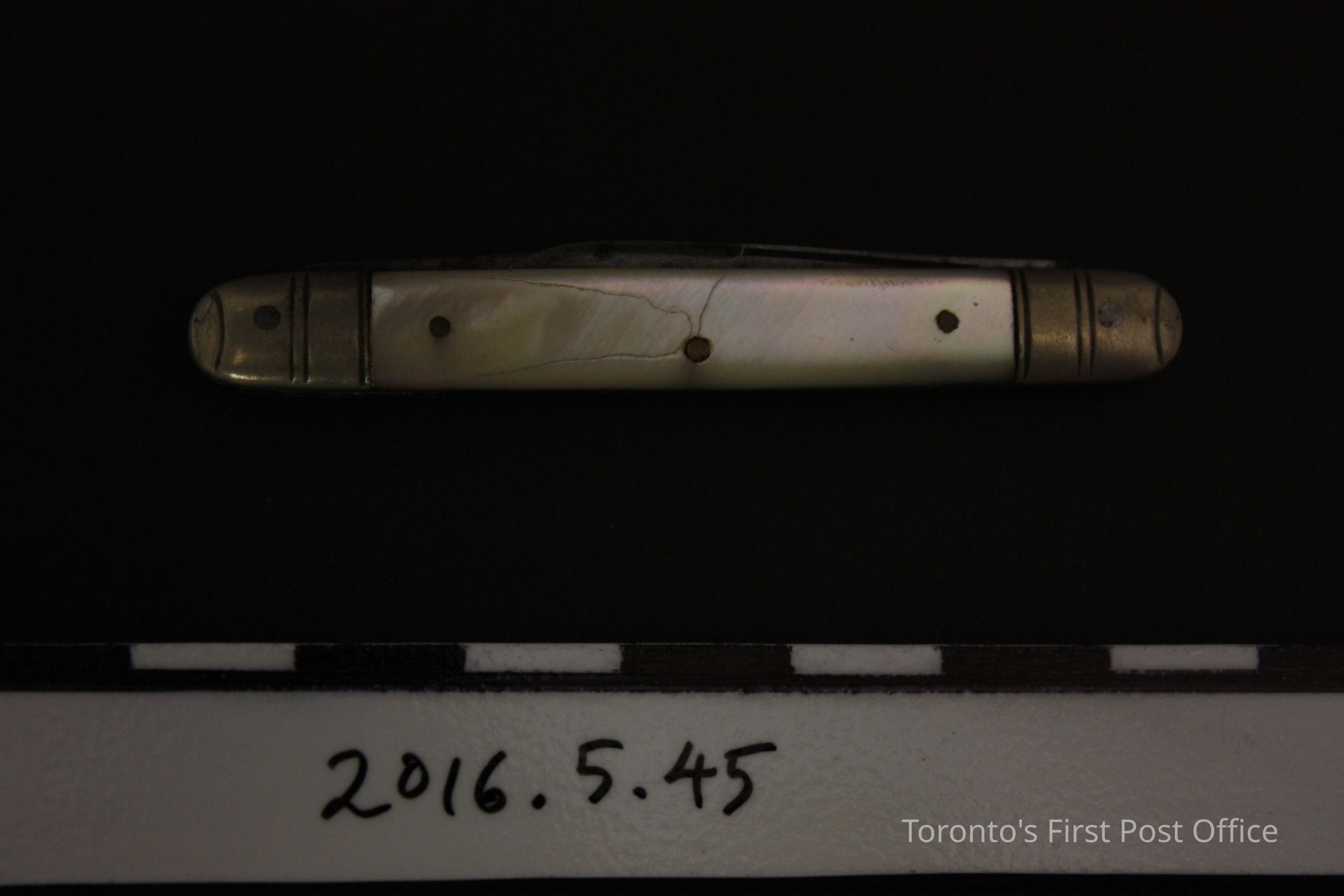 Pen knife. Two steel blade, collapsible knife in silver or nickel (?) outer case with mother of pearl inlaid sides. Inlays are attched with three (3) pins. Blades are marked 'James Boden Sheffield'Update Date