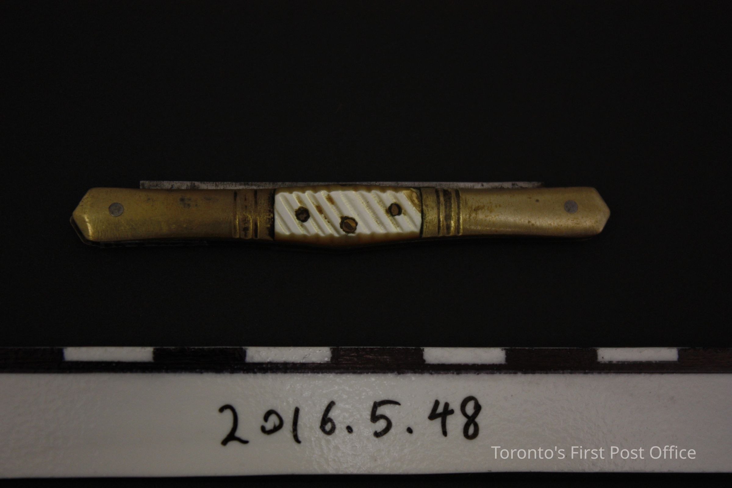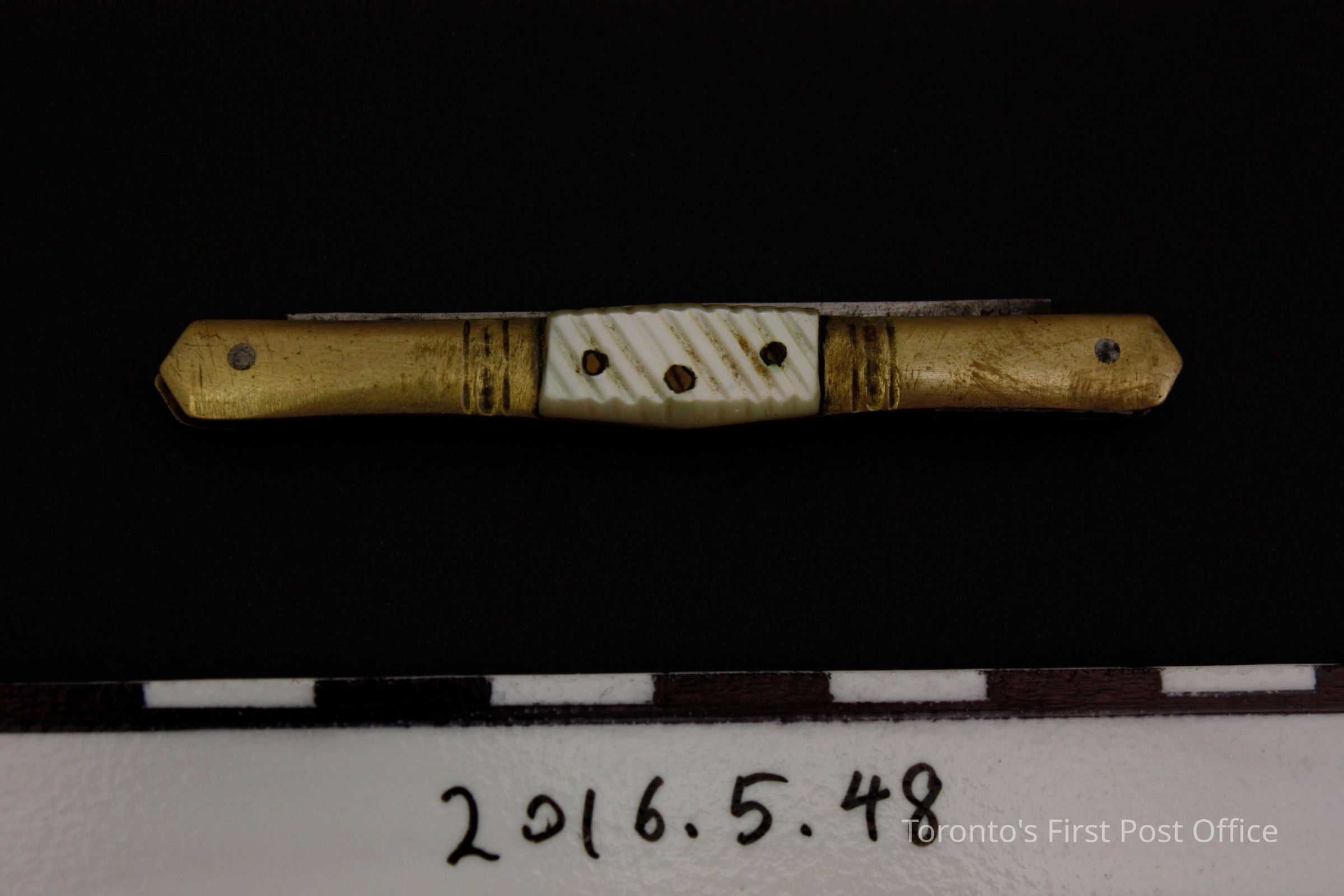 Pen knife. Two steel blade, collapsible knife in light yellow alloy outer case with mother of pearl inlaid sides. Inlays are attached to case with three (3) pins. Blades are marked 'Webster Cutlery Co. Germany'Update Date