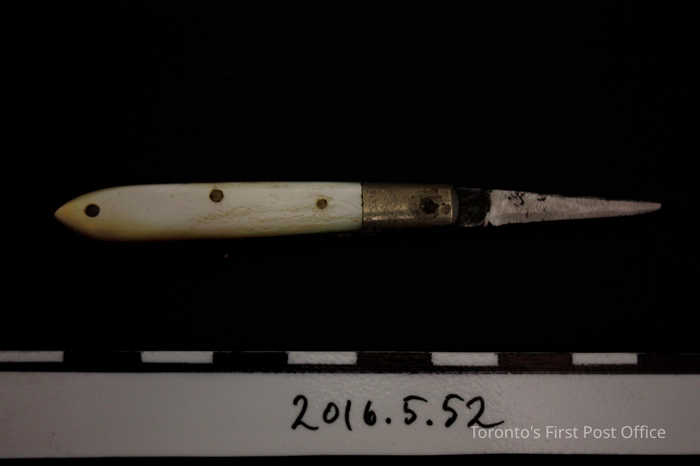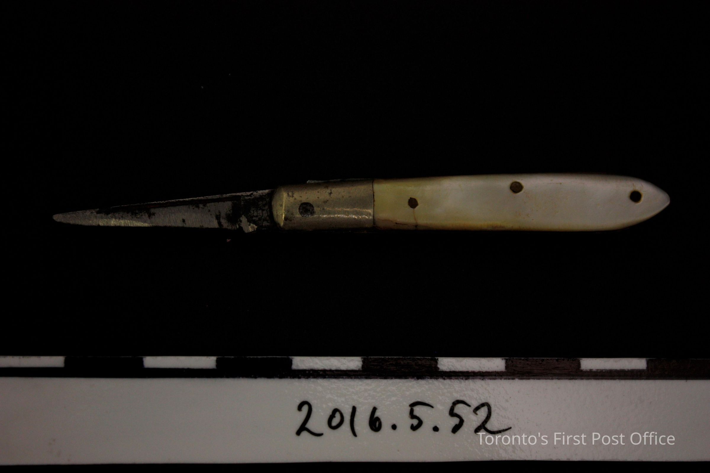 Pen knife. Single steel blade, collapsible knife in light yellow alloy outer case with mother of pearl inlaid sides. The inlays are attached with three (3) pins, the inlays come to a point at one end of the knife.Update Date
