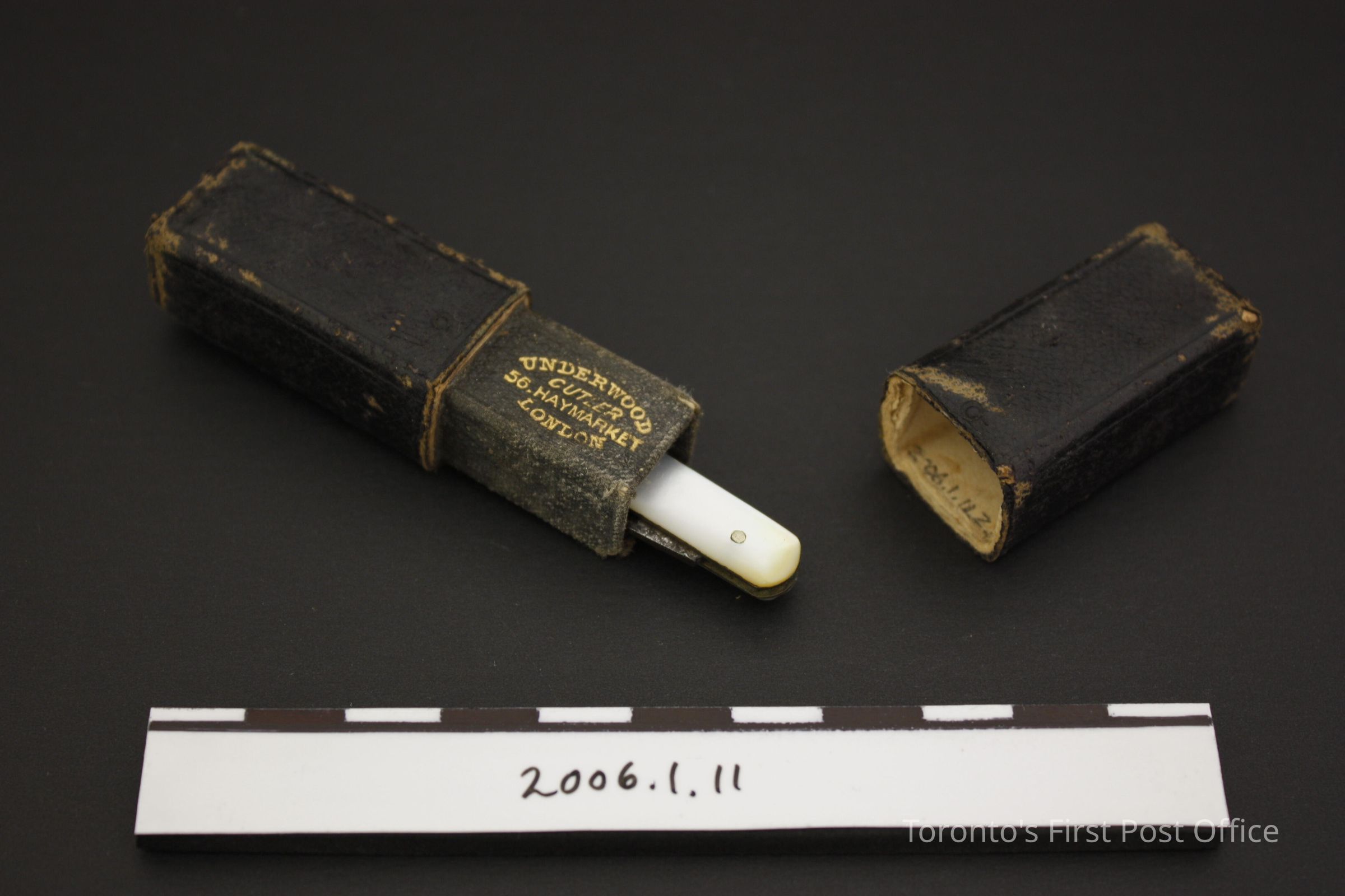 Pen knife with mother-of-pearl sides; steel blade; two pins on each side; illegible stamp at base of blade; in case with separate lid; cardboard covered with chesnut brown-black leather; "UNDERWOOD CUTLER 56, HAYMARKET LONDON" stamped in gold on base under lid; circa 1856-1860.Dimensions