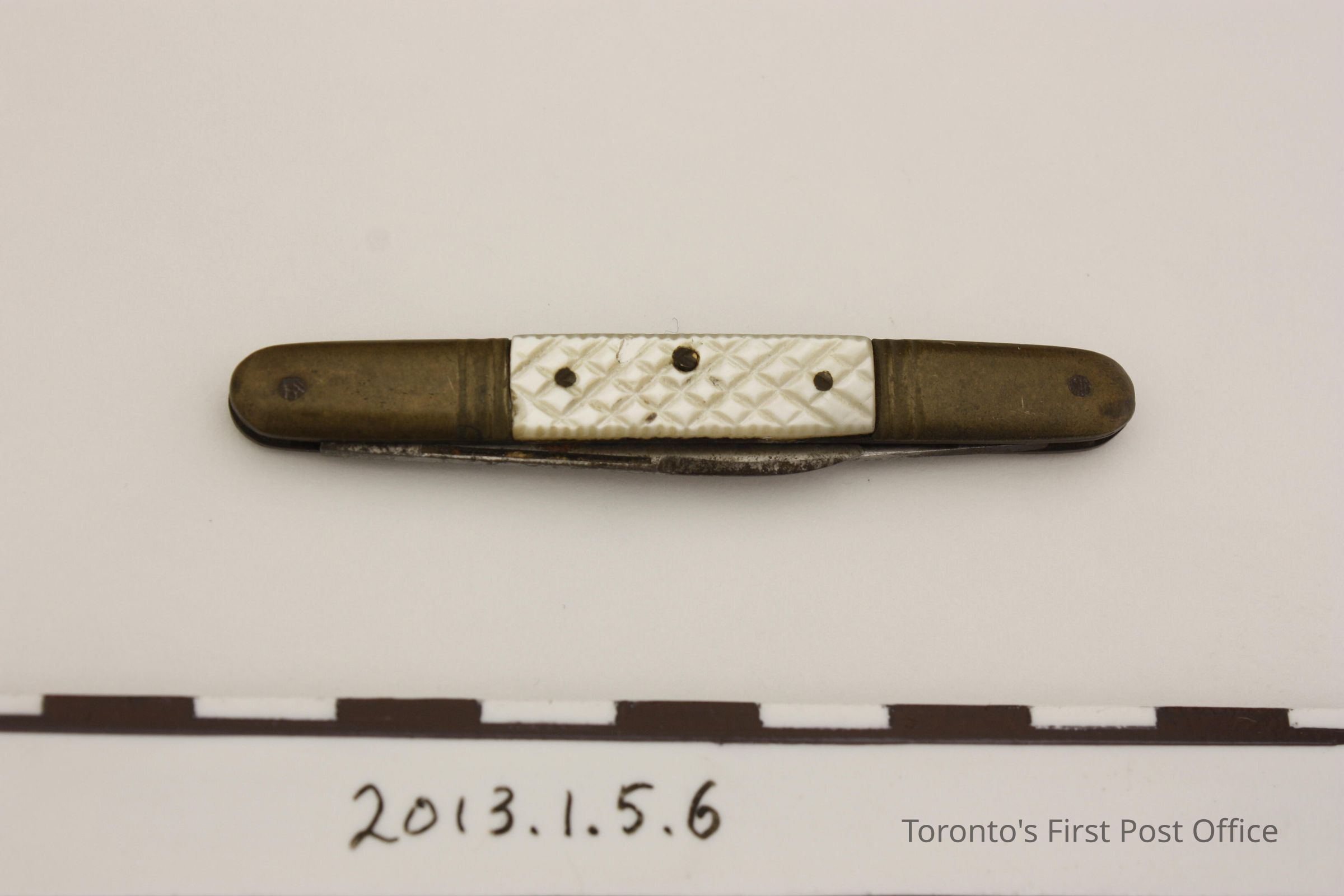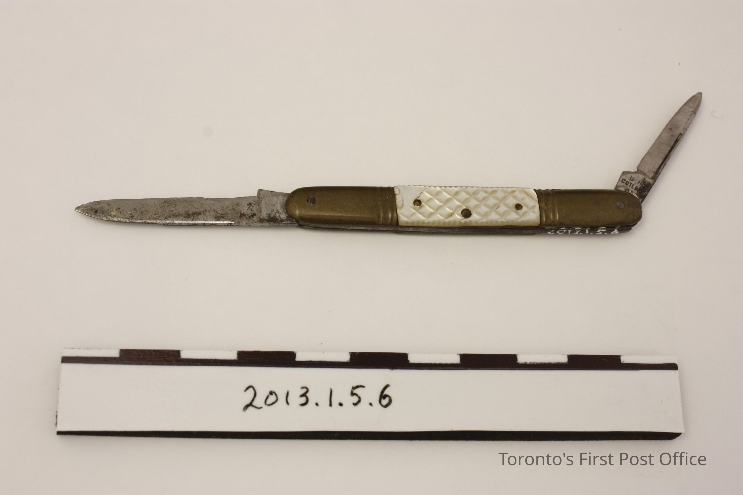 Pen knife. Two-blade, collapsible knife. Steel blades in brass outer case with cross-hatched mother of pearl inlaid sides. Inlays are attached with three (3) pins. Blades are marked 'B.B. Cutlery Co'. Circa 1890-1900Made/Created