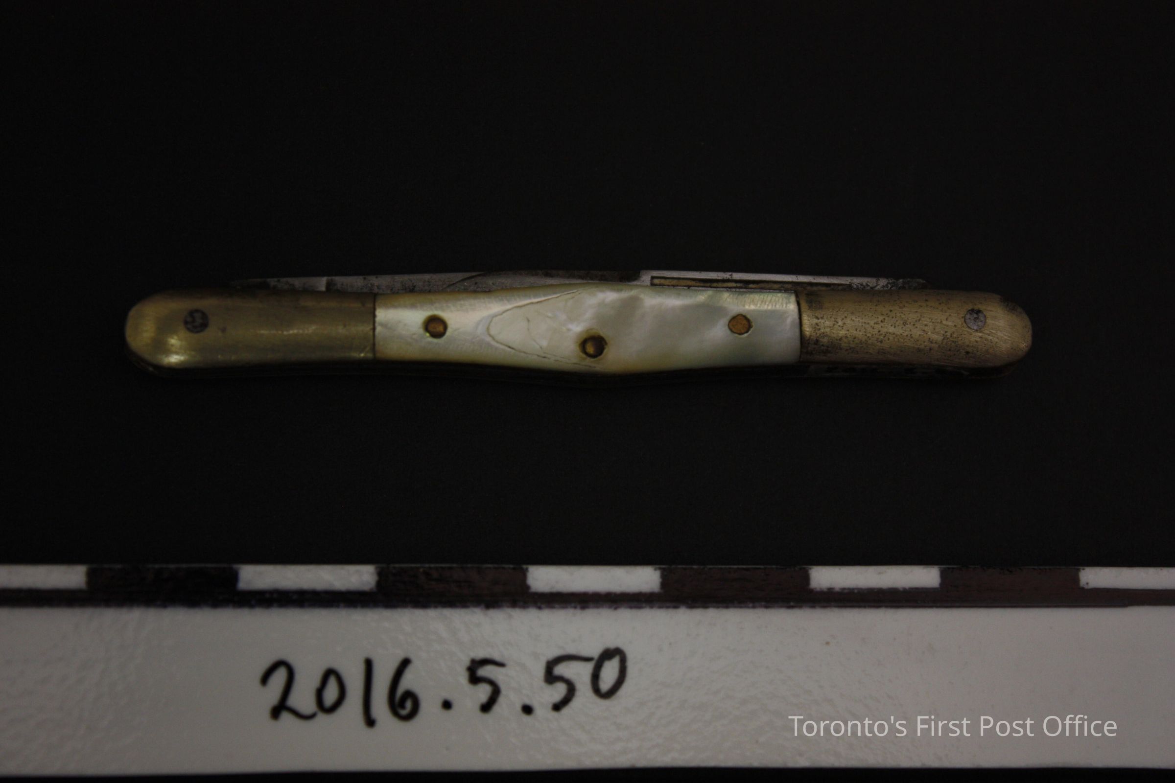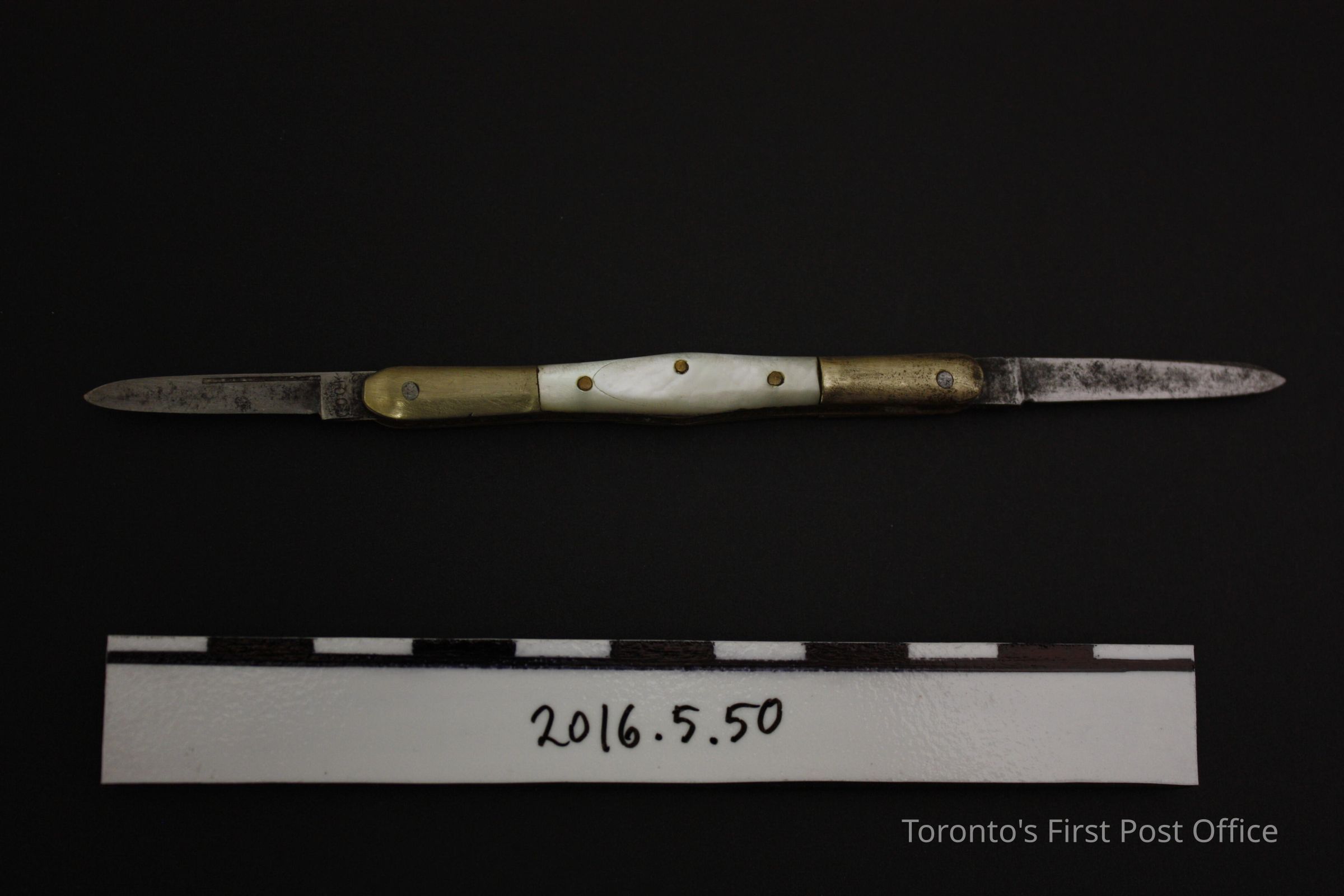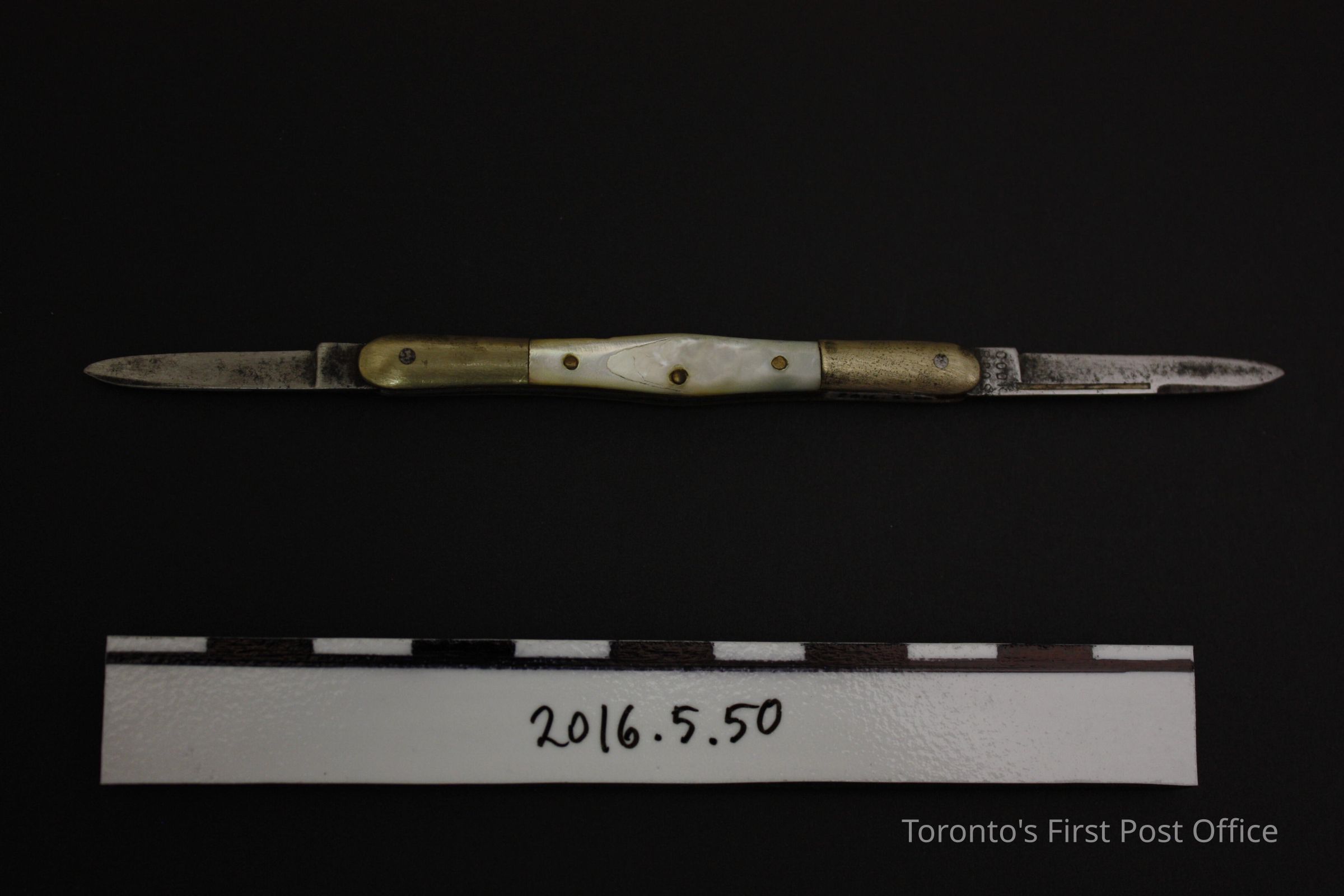Pen knife. Two steel blade, collapsible knife in light yellow alloy outer case with mother of pearl inlaid sides. Inlays are attached to case with three (3) pins. Blades are marked 'Cook Bros'Update Date