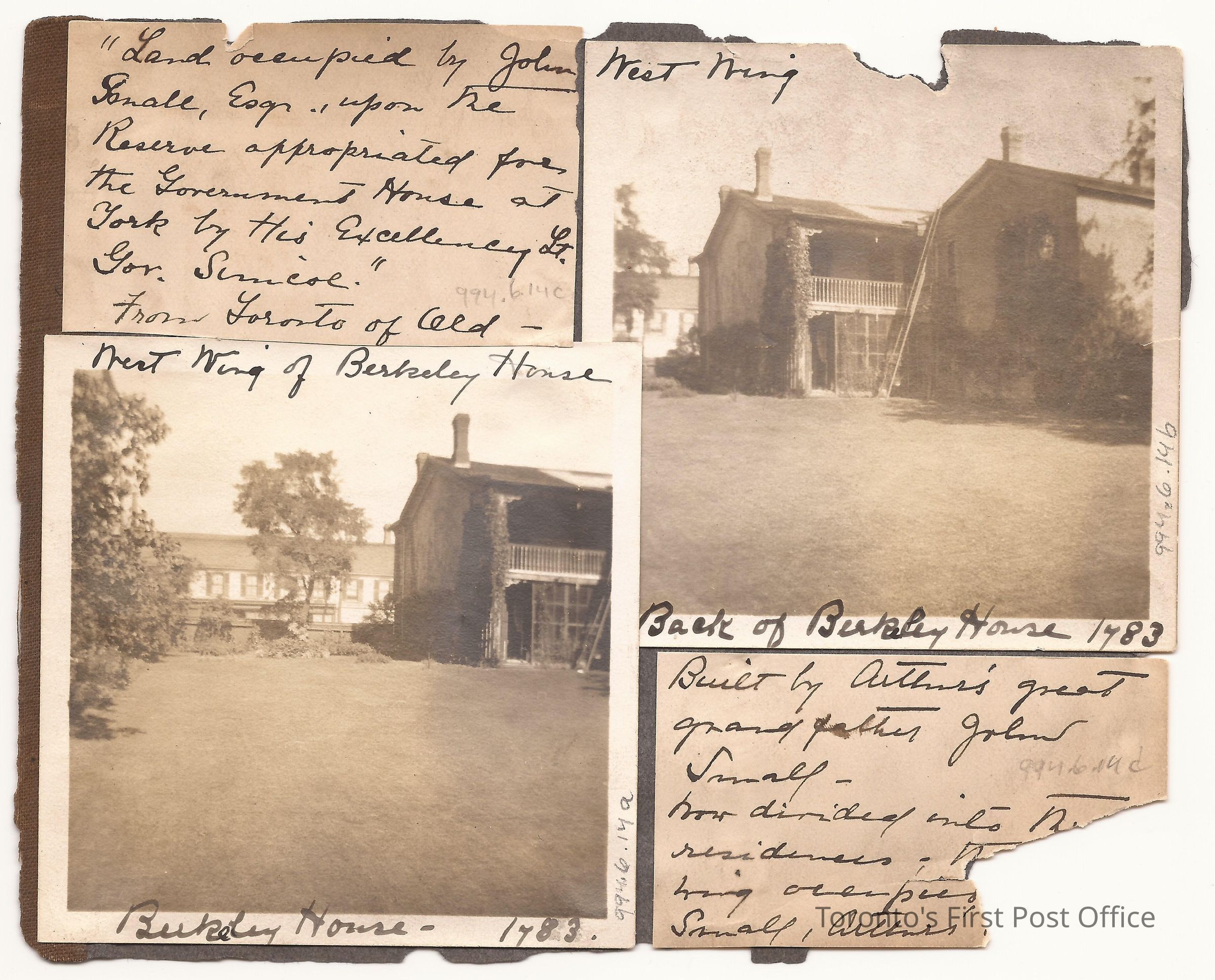Two black and white photographs with white borders and captions, mounted on dark grey construction paper; first photo is labeled "West Wing of Berkeley House-1783" and "Land occupied by John Small, Esqr. upon the reserve appropriated from the Government House at York, by His Excellency Lt. Gov.. Simcoe from Toronto of old"; second is "Back of Berkeley House 1783" and "Built by Arthur's great grandfather John Small now divided into three residences - the west wind occupied by John Small, Arthur's cousin".Dimensions