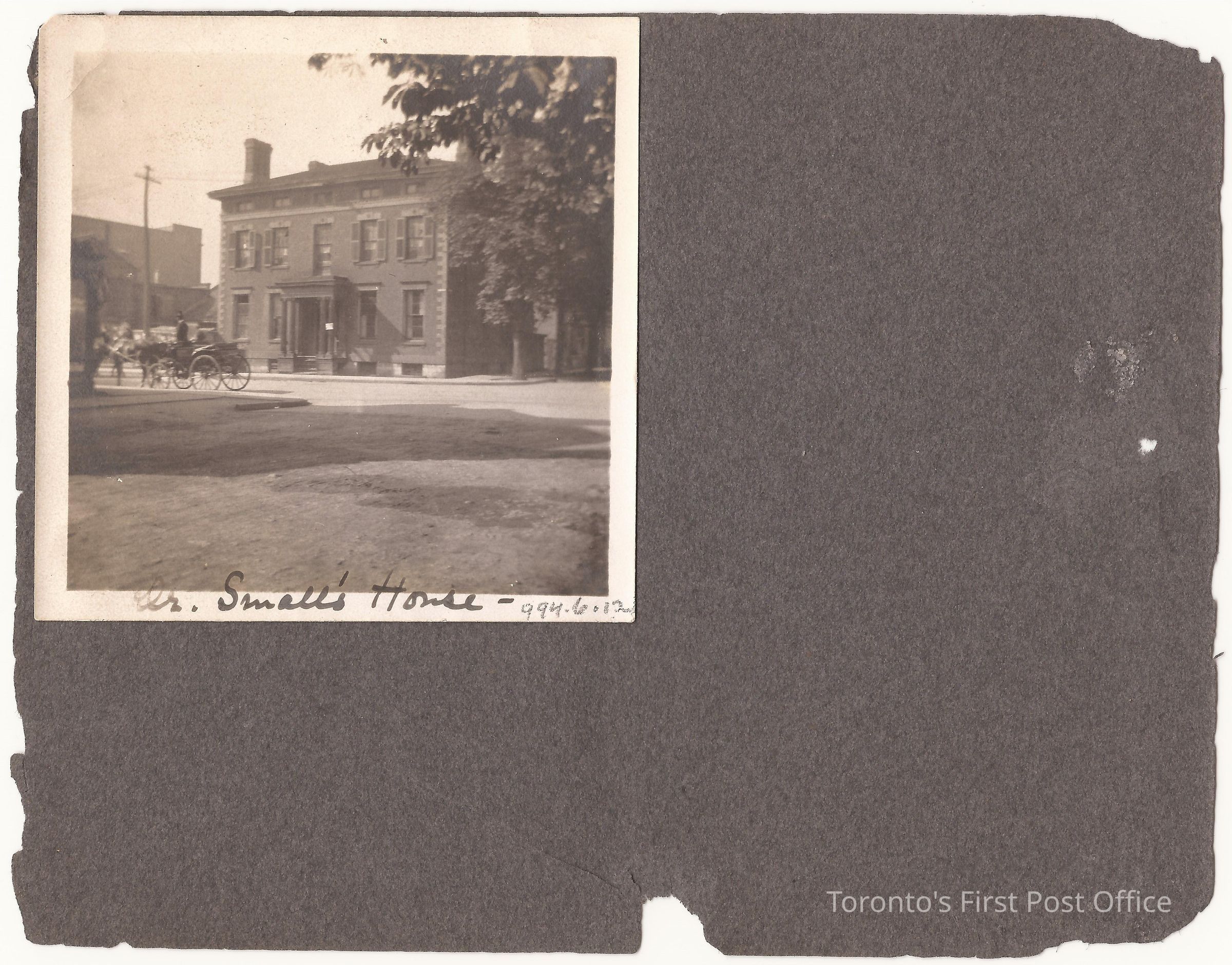 Photograph, mounted on dark grey construction paper; photo is black and white with white border; of a two-storey brick house with horse and carriage passing by, tree in leaf beside house; printed in black ink under photo: "Dr. Small's House".Dimensions