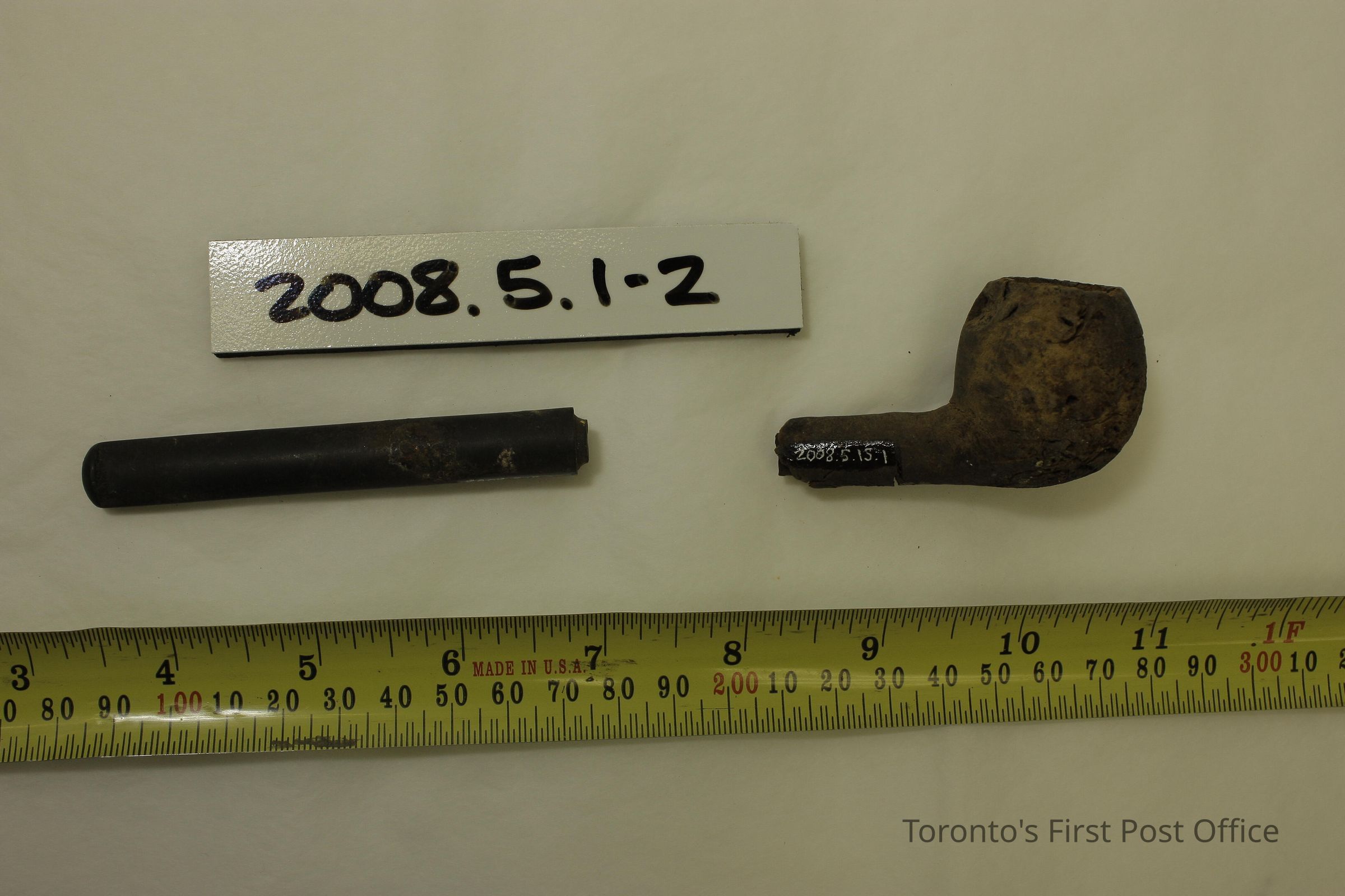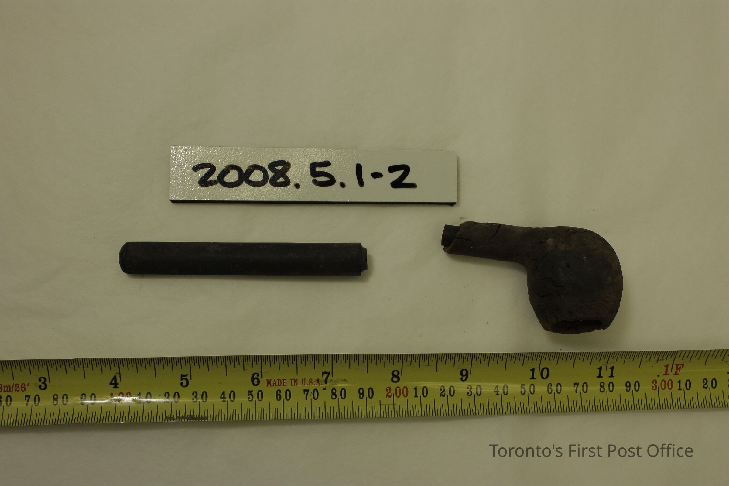 Pipe bowl; wood over ceramic neck; seperated neck and mouthpiece is unknown material over ceramic.Dimensions