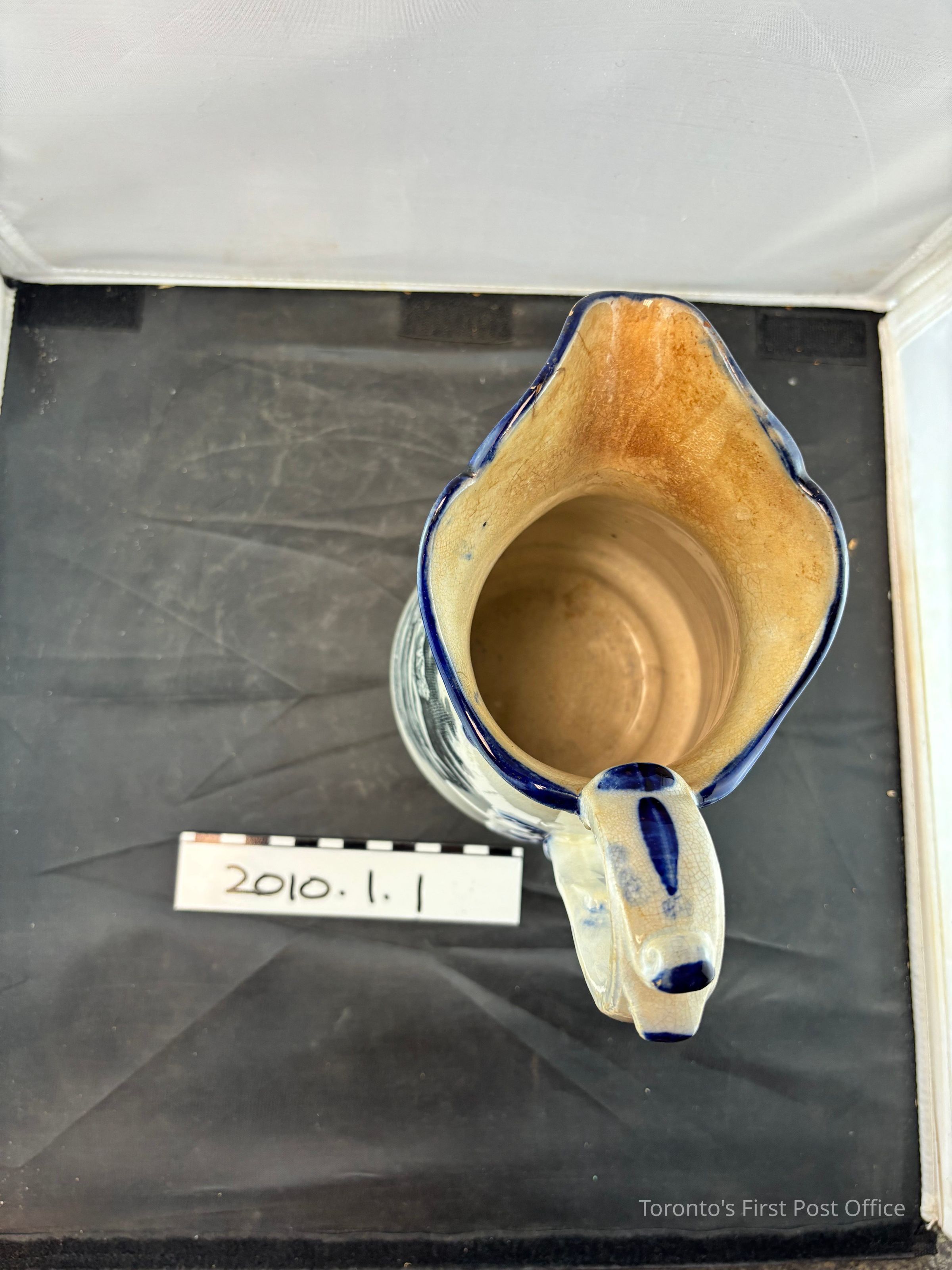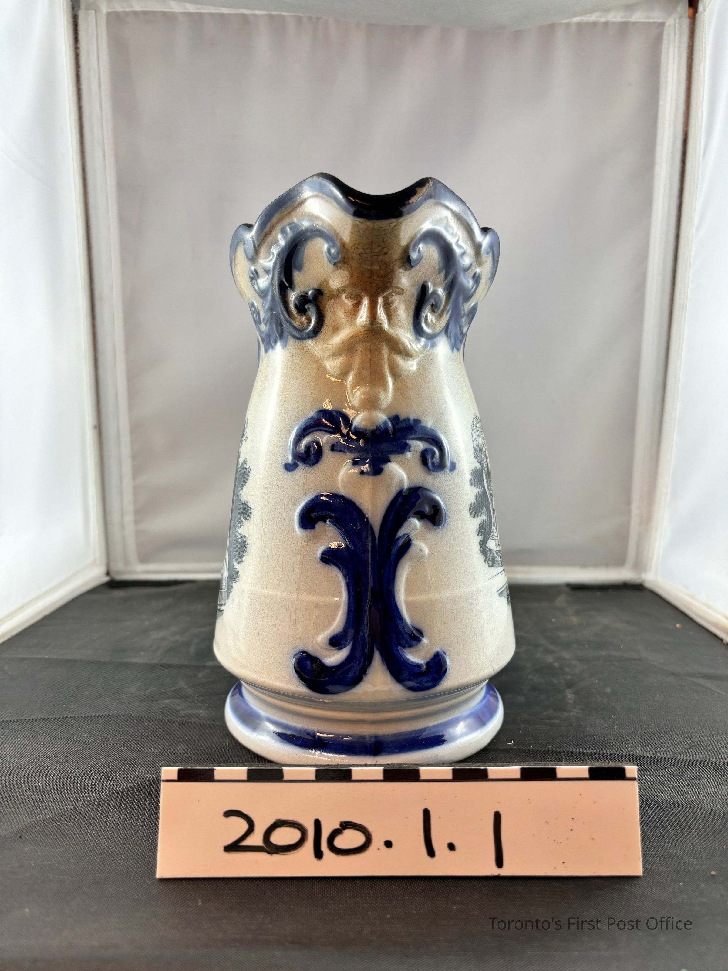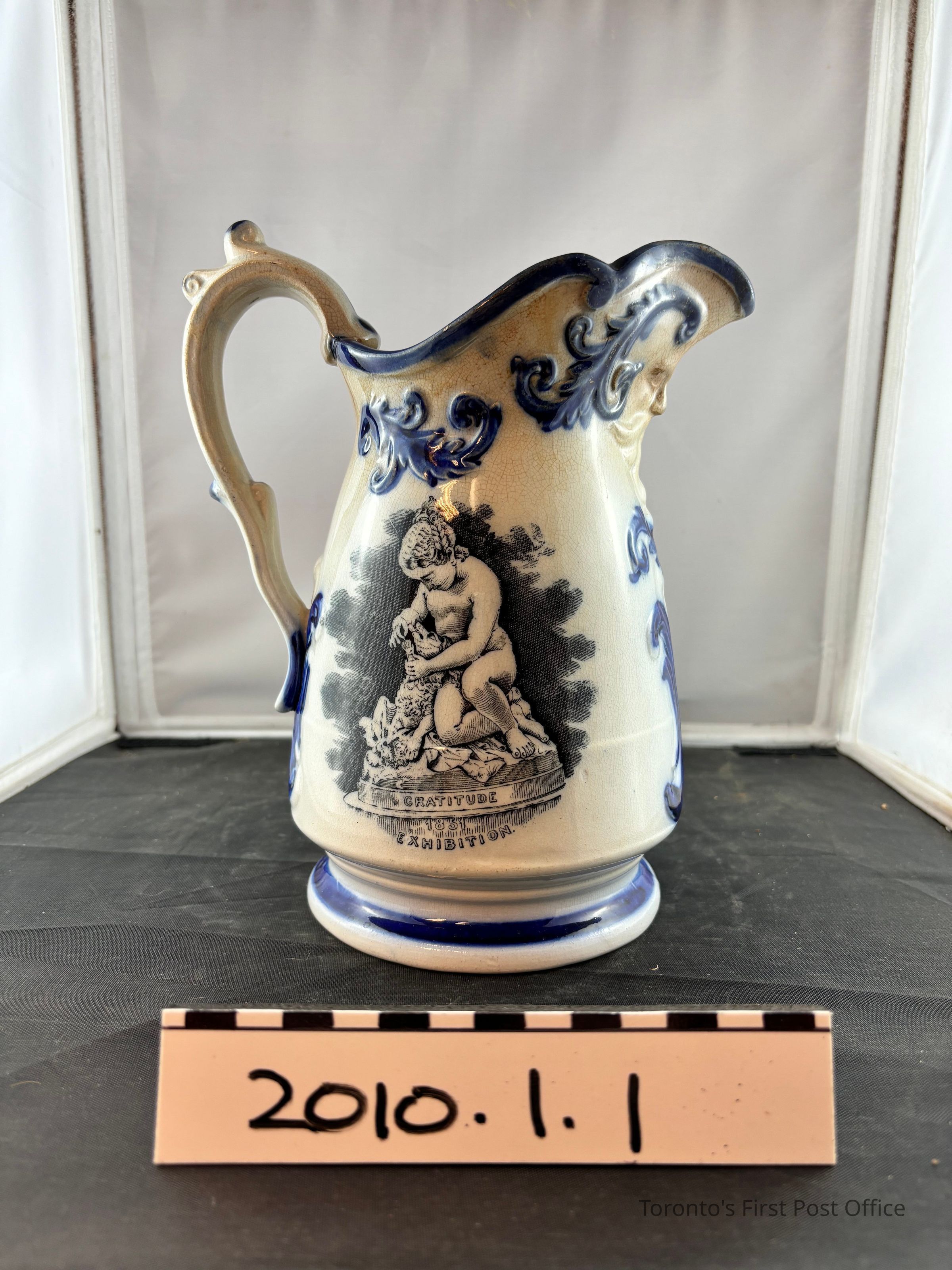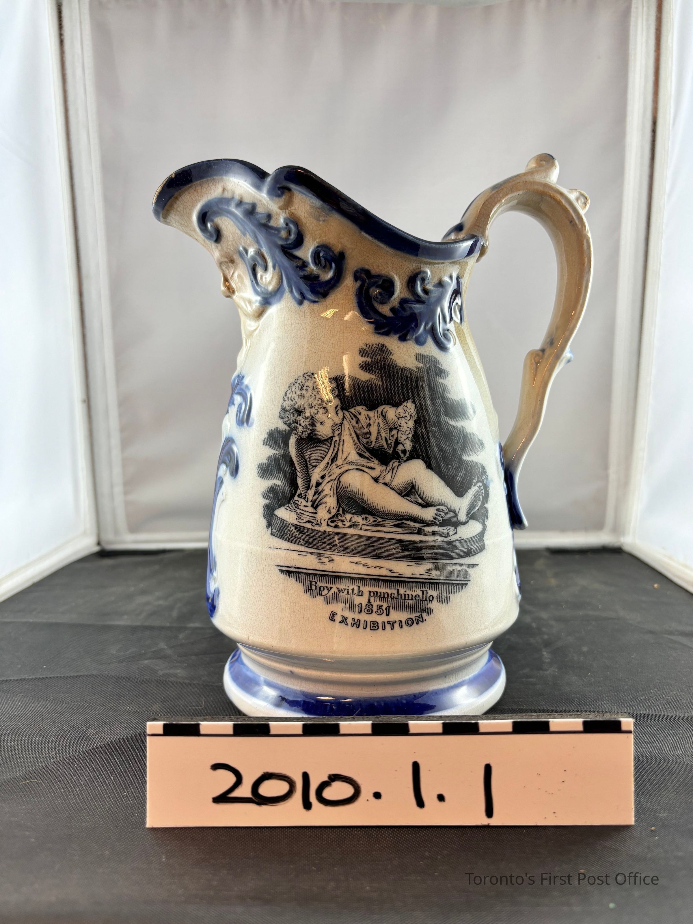 Pitcher. English, ceramic souvenir from The Great Exhibition of 1851 in London, England. Base white glaze with blue accent glaze on lip and foot, relief accantus leaves, and handle scroll decoration. Black transfer print on either side of the body, depicts 'Boy with punchinello' and 'Gratitude', images of sculptures. Relief face on underside of spout.Dimensions