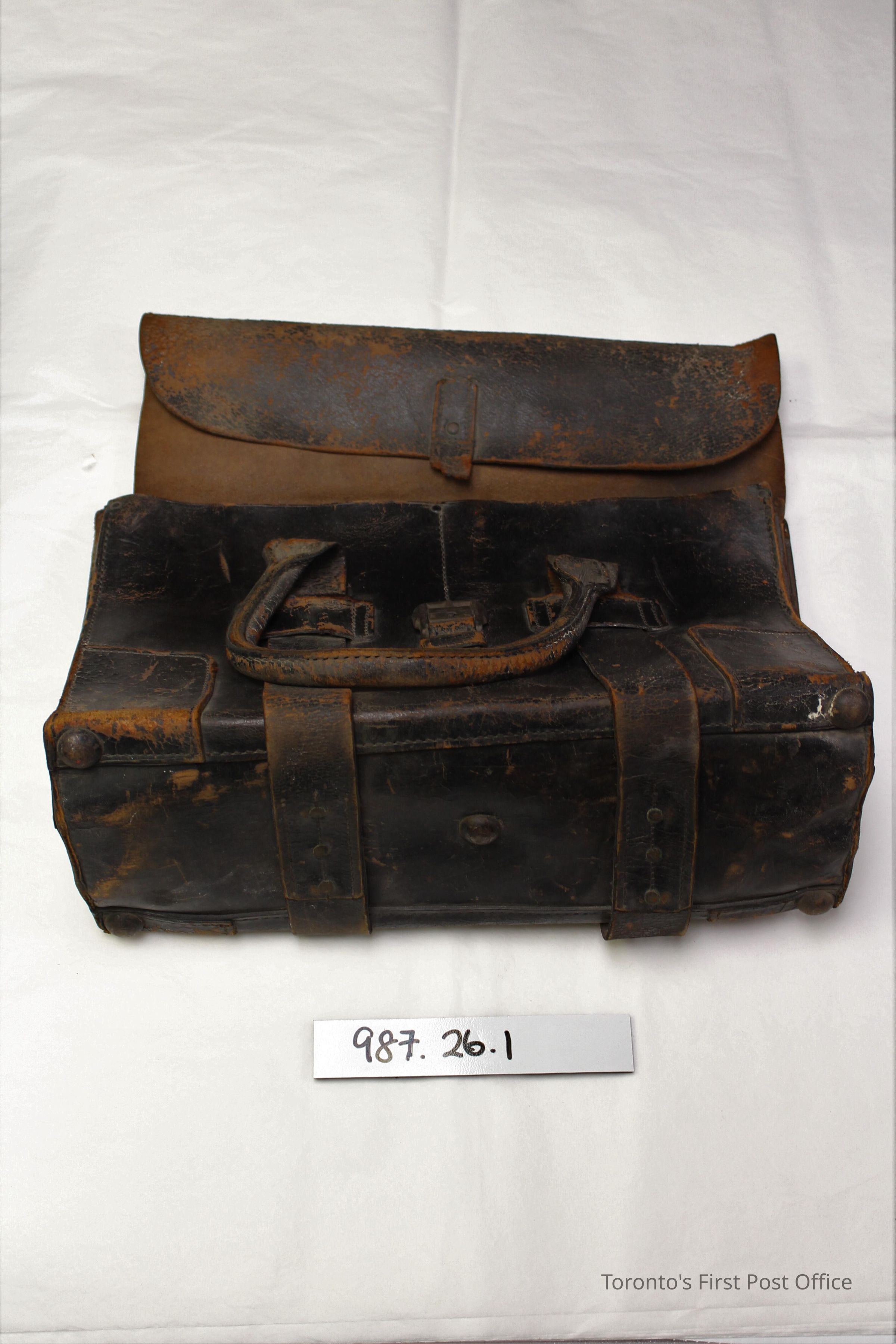 Portmanteau; black leather with leather appliques on each corner; two handles extending around the bottom of case; key-hole at front; interior divided into four sections.Update Date