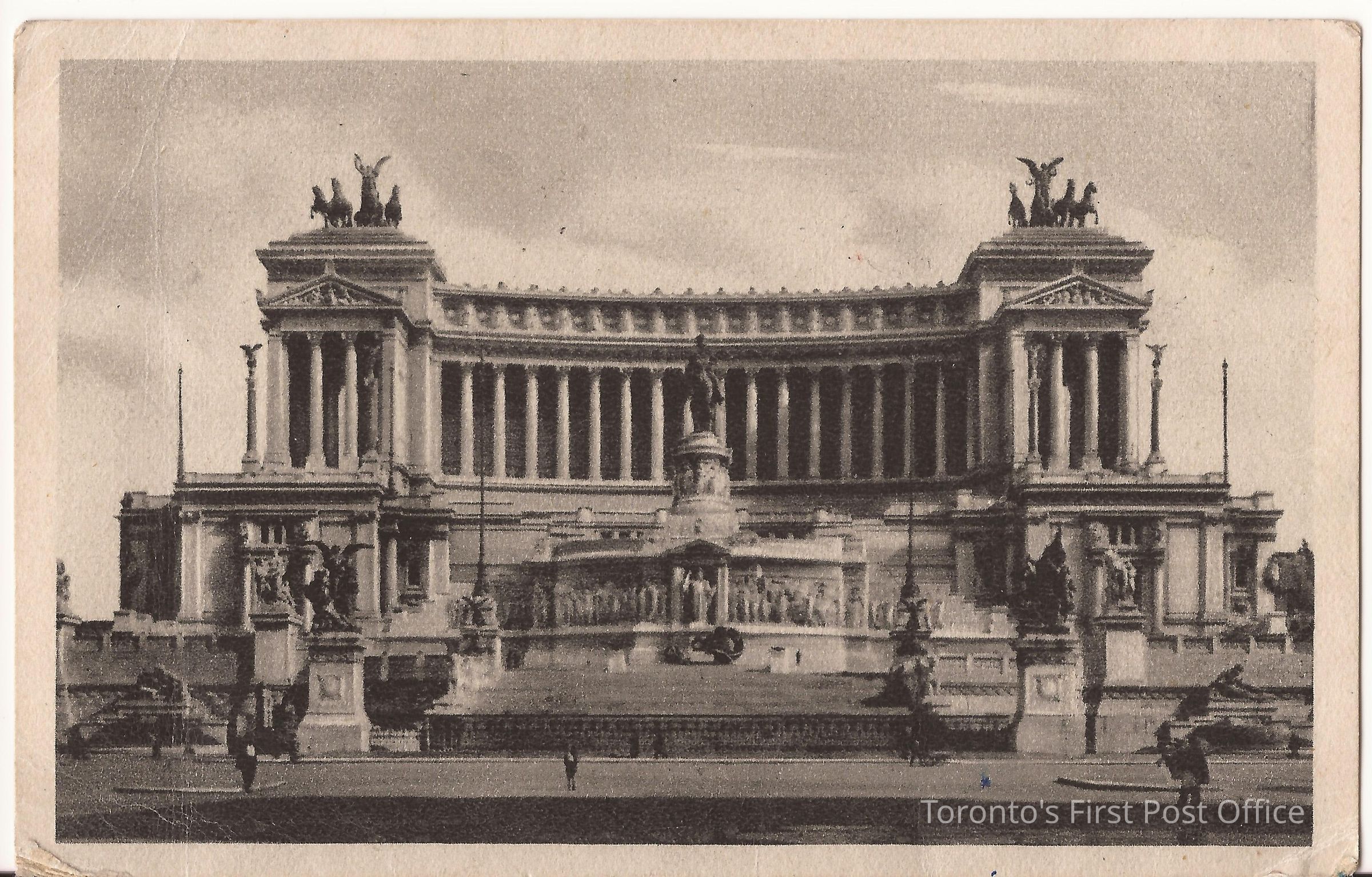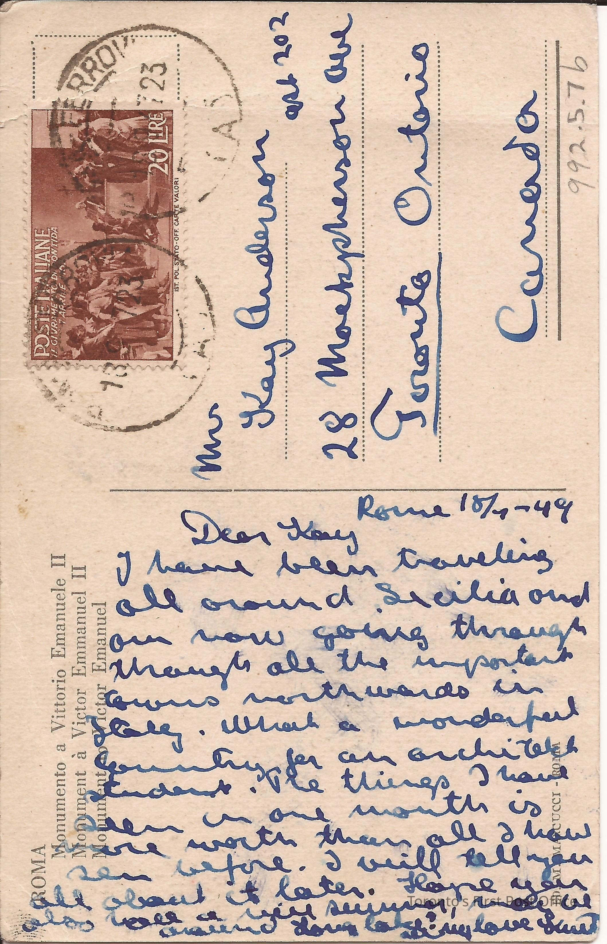 Post card picturing black and white photo of monument of Victor Emanuel in Roma; addressed to Mrs. Kay Anderson, 28 Macpherson Ave. Apt. 202, Toronto, Ontario; from Susie; blue ink.Update Date