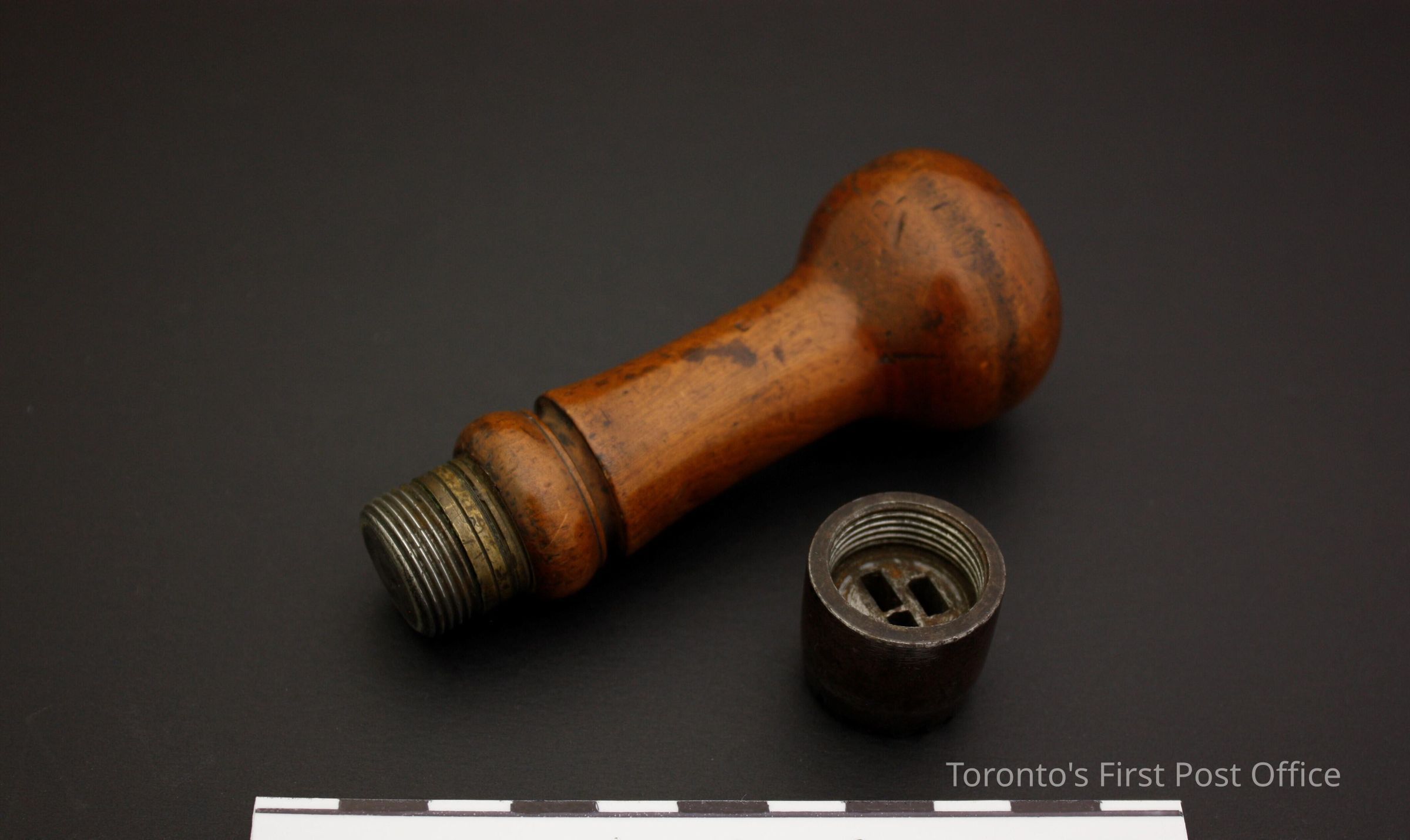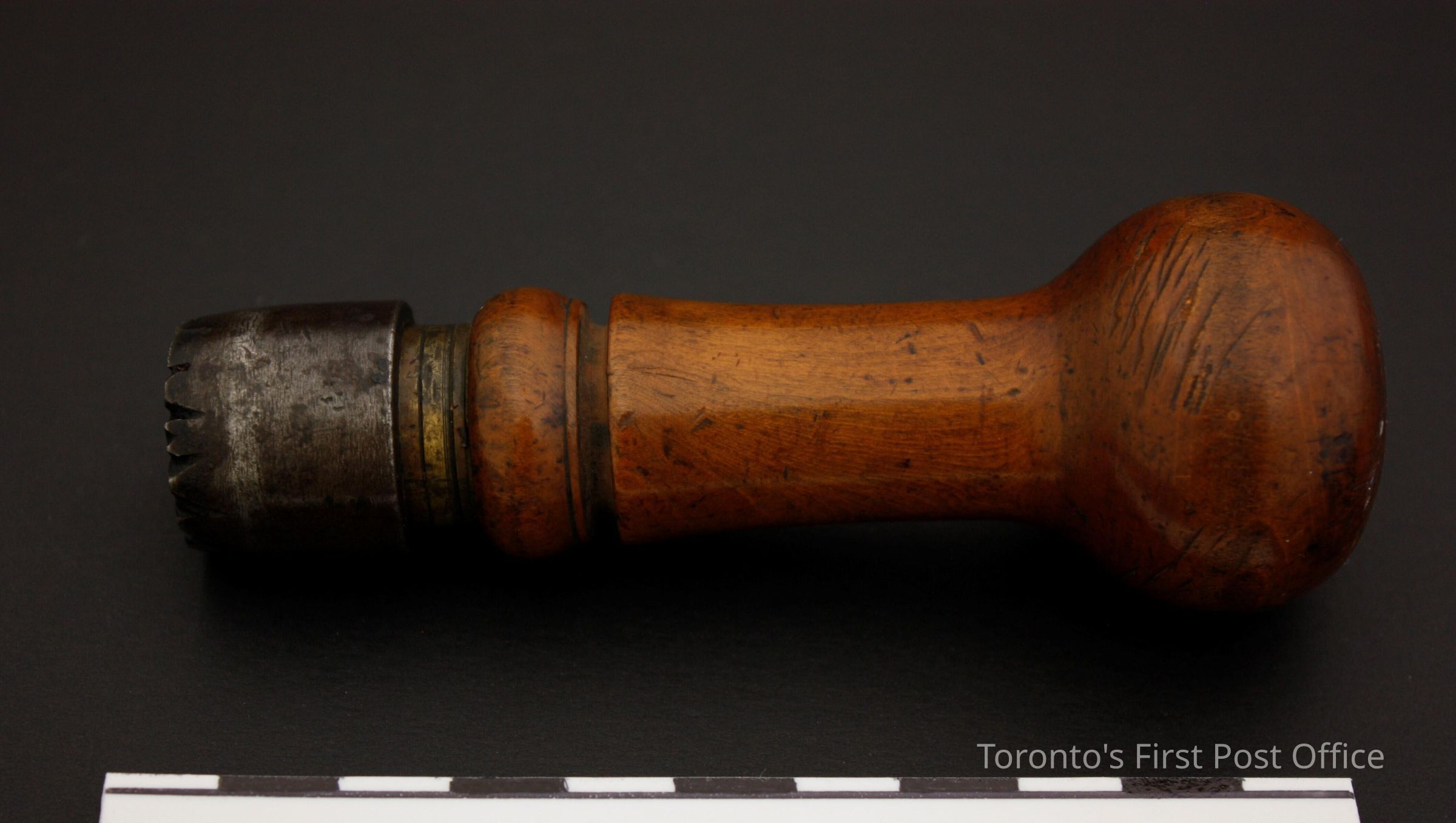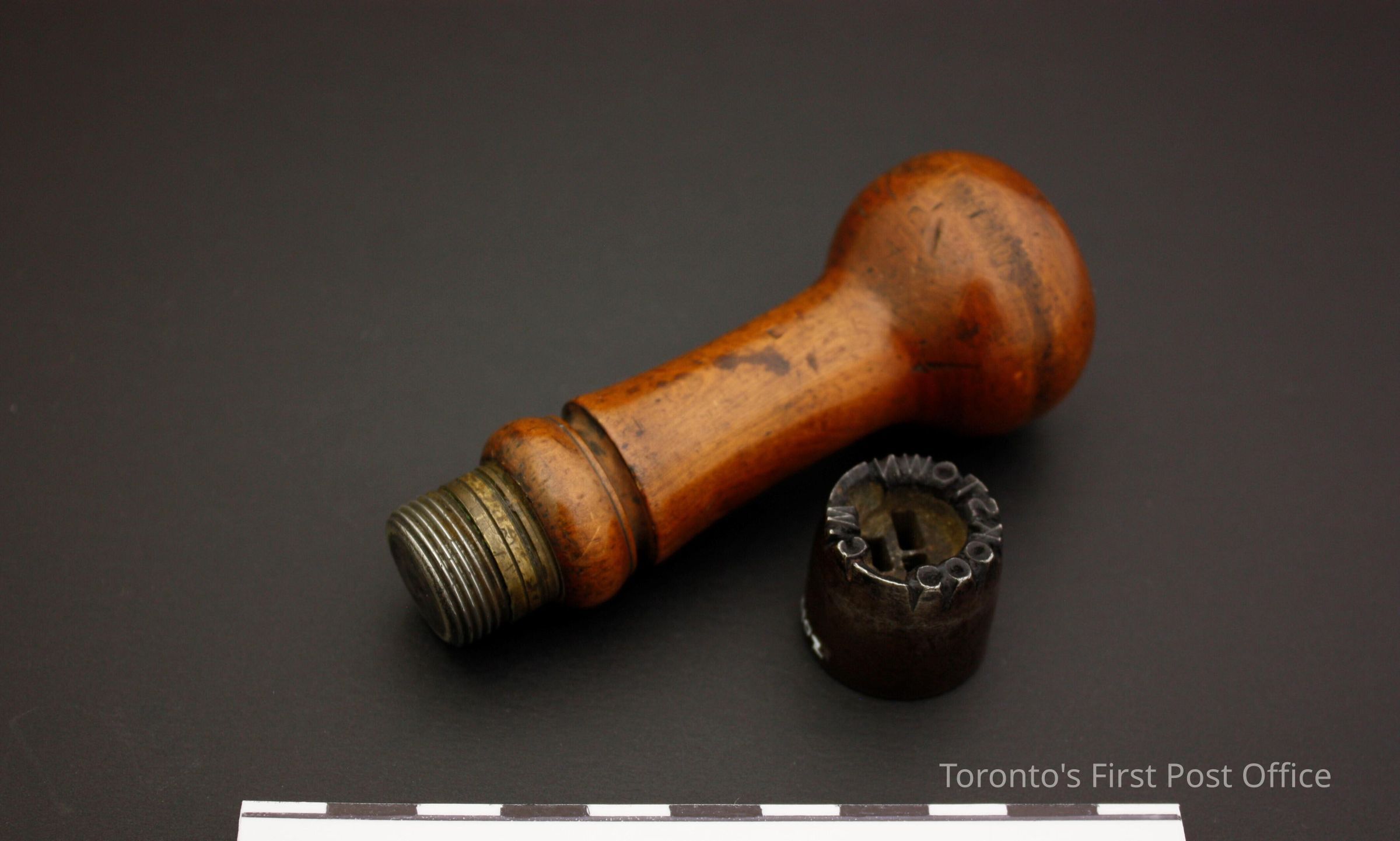 Postal hammer or cancelling device for letters. Hammer is made up of steel stamp head, brass collar and wooden handle. On the metal stamp, has inscription "Cookstown C.W." that can signify it was used at Cookstown Postal Office.Made/Created