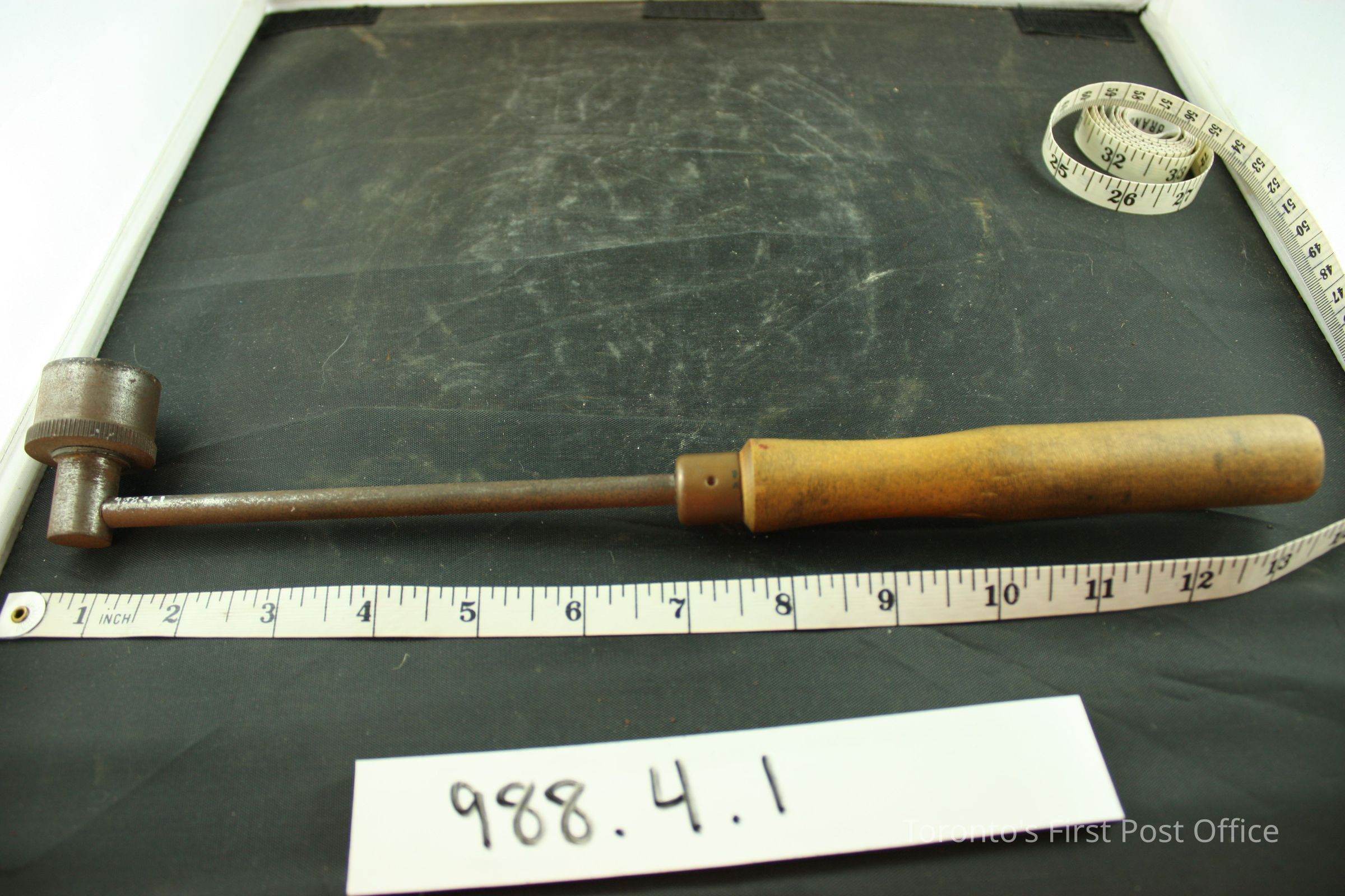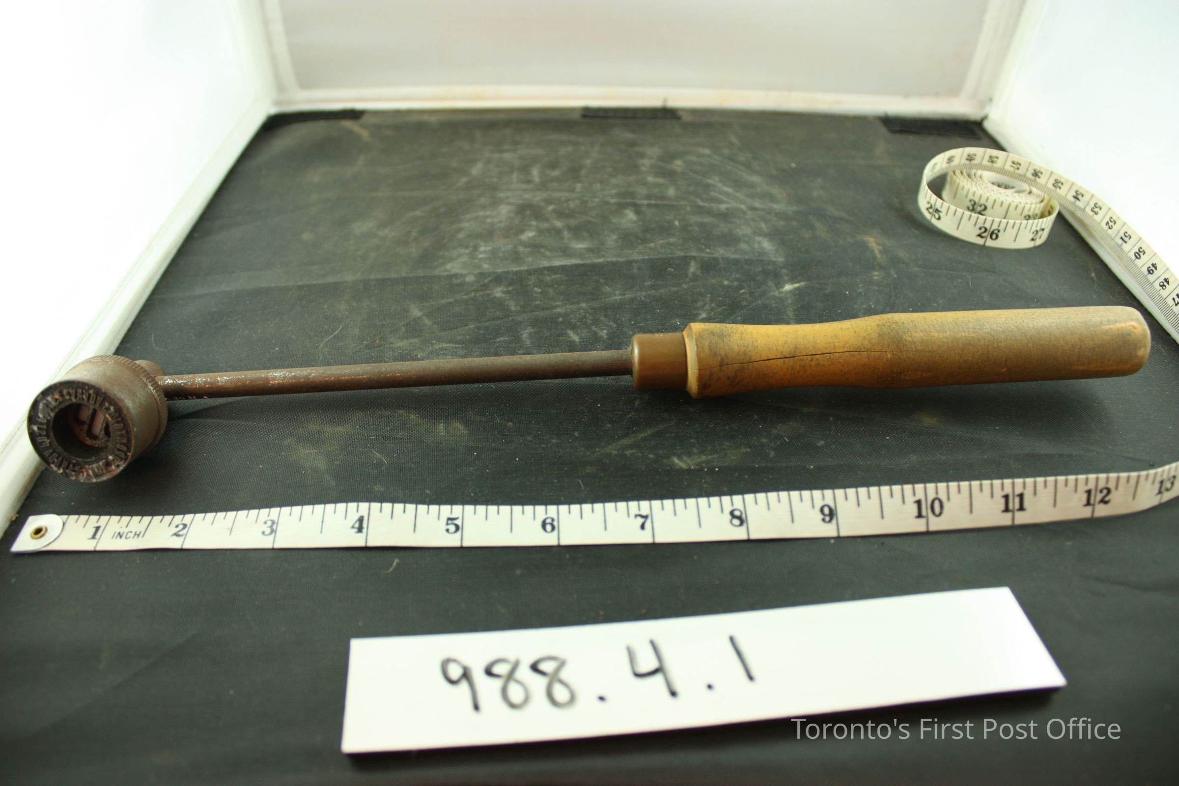 Postal cancellation hammer; wooden handle was turned on lathe; brass collar; metal shaft; round head with "Canada Post Postes Canada York Toronto 1833".Dimensions