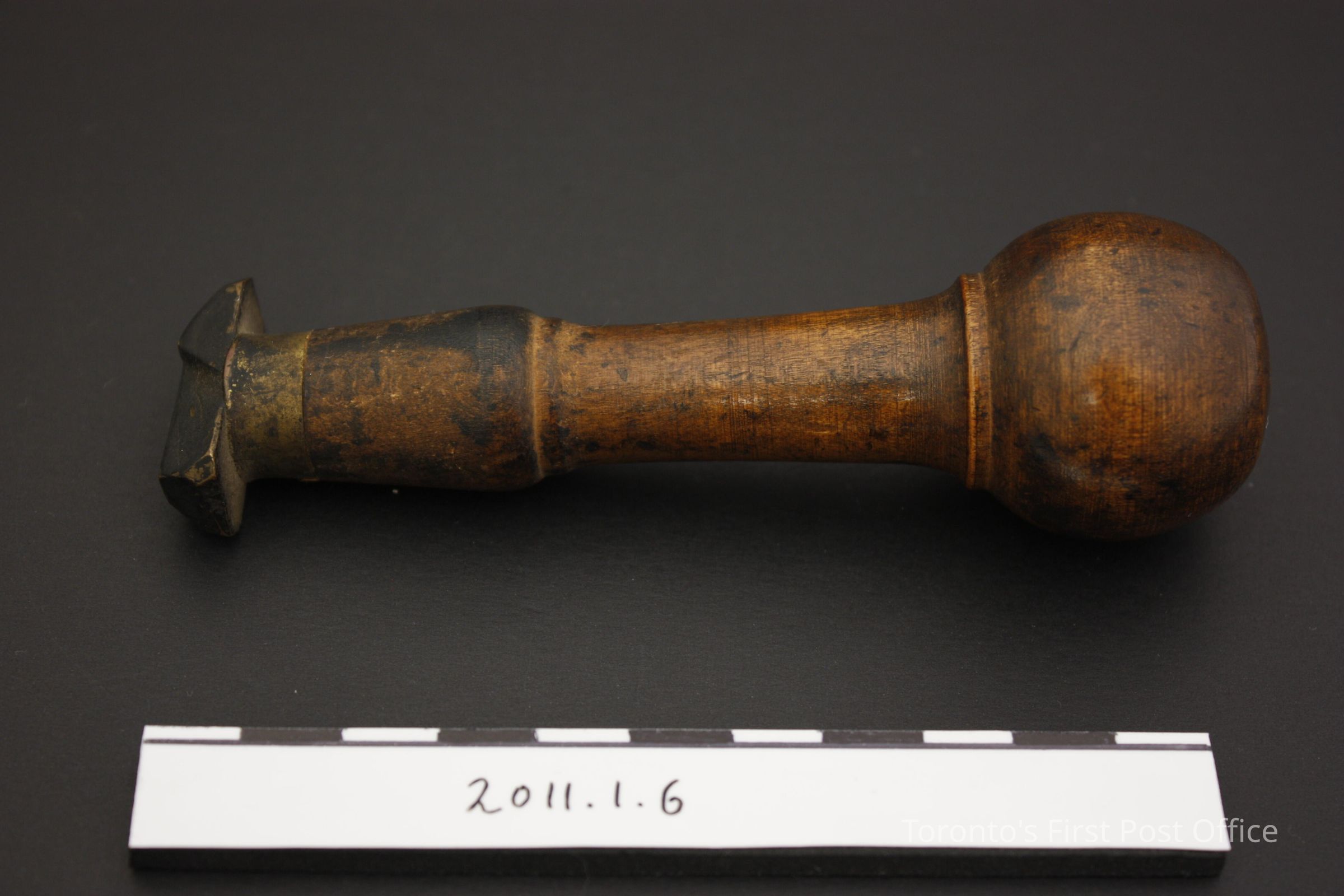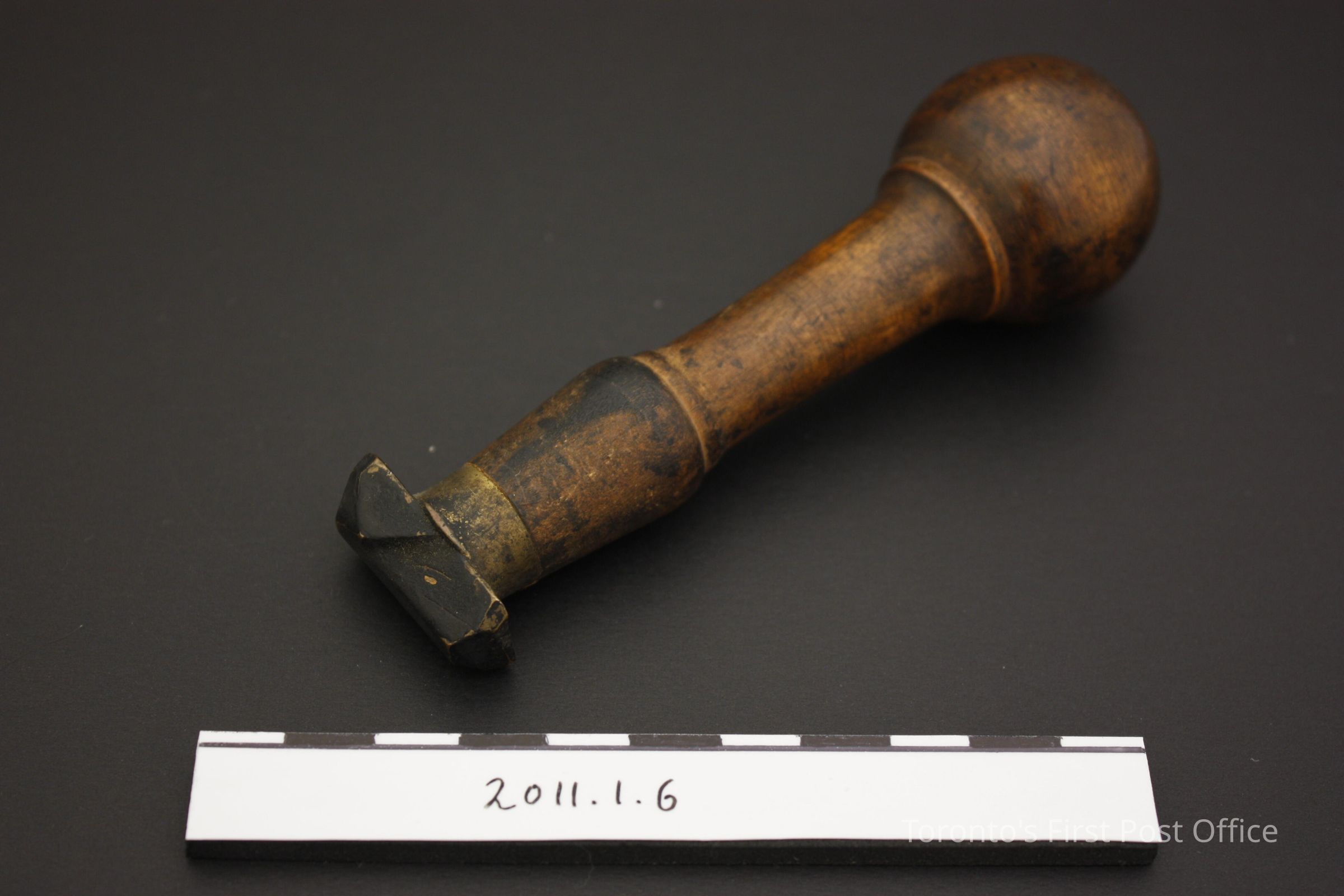 Postal hand stamp. Composite object, wooden handle with bulbous grip and yellow metal stamp in the shape of the number '1'. The wood is a dark brown with a shiny coating.Update Date