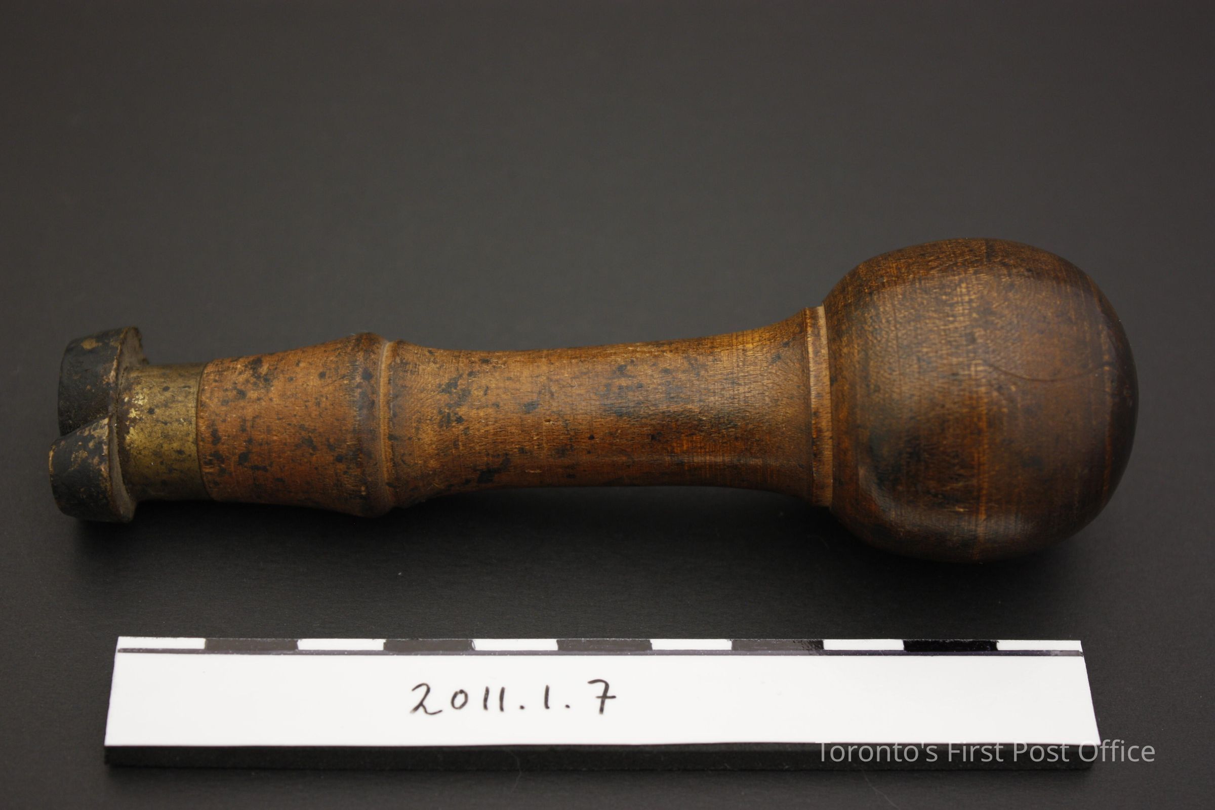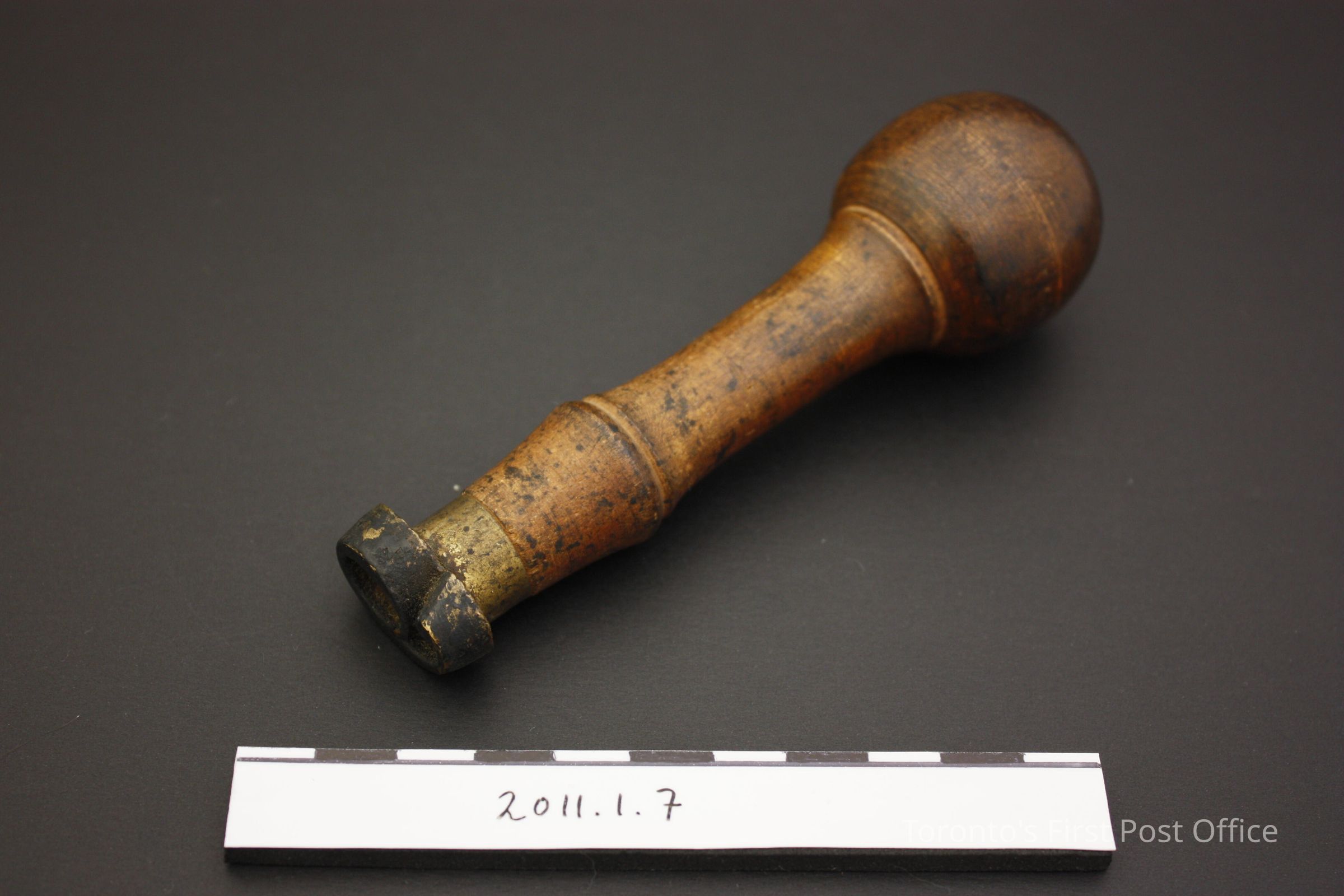 Postal hand stamp. Composite object, wooden handle with bulbous grip and yellow metal stamp in the shape of the number '6' or '9'. The wood is a dark brown with a shiny coating.Update Date