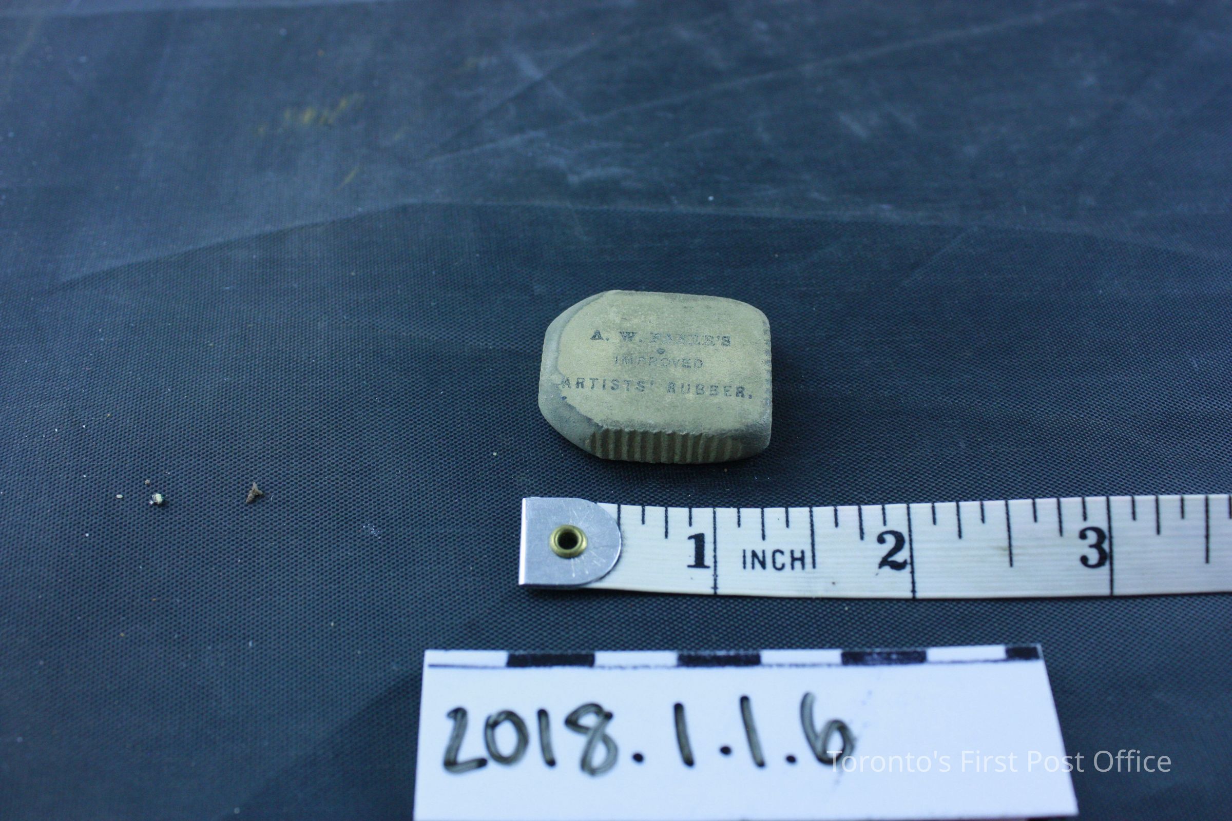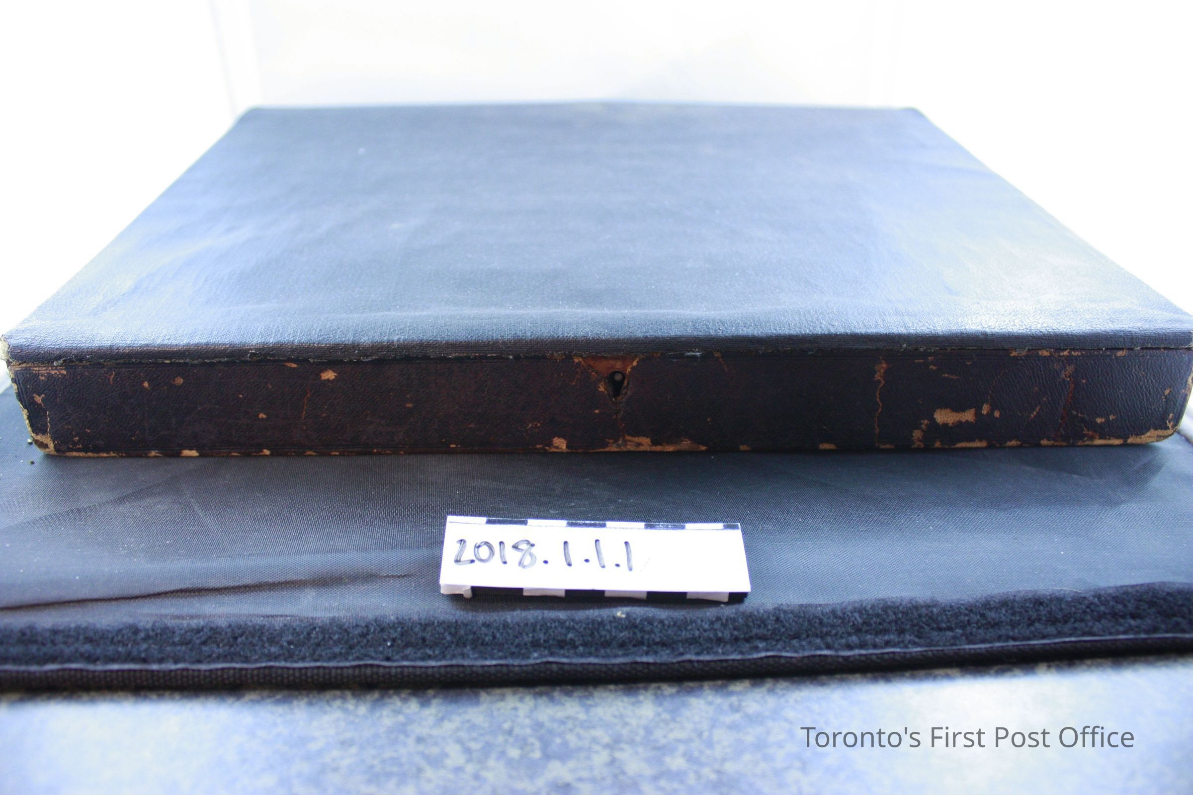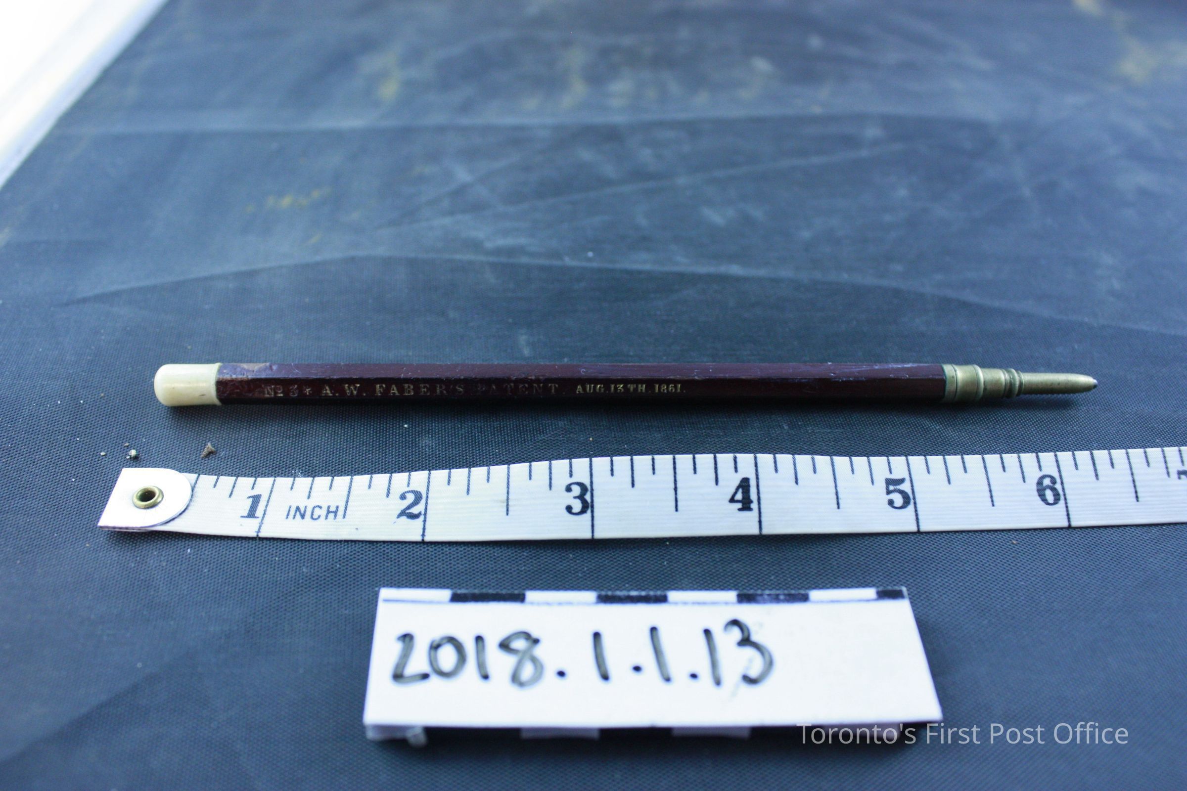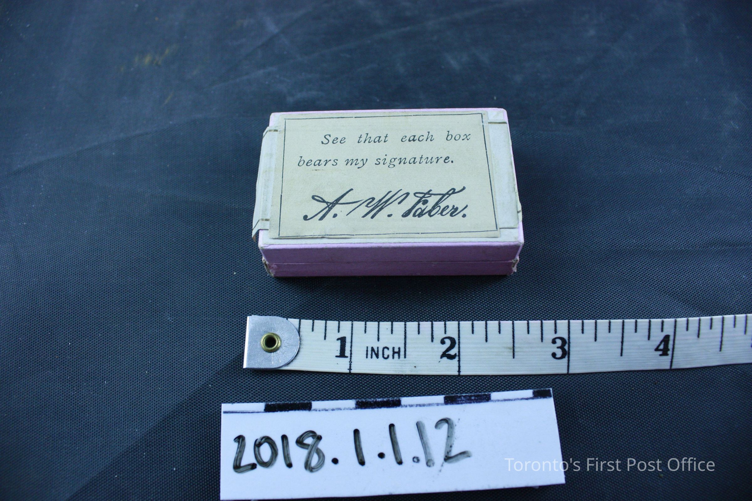 Wood and leather postal lap desk with key that opens the box. Inside the box has 4 compartments, with 2 compartments at the right side labelled "Postage Stamps" and "Pens". Contents in the box include: Used red sealing wax partially stamped "Sutton", two pieces of black sealing wax, bag of assorted clips and caps, used eraser printed "A.W Faber's Improved Artists' Rubber" on one side, stamp head with "C.G.H" stamped on front plate, two travelling inkwells, black vulcanized India rubber ruler with one side stamped "Goodyear's Patent 1849-1851 Poppenhusen & Konig", metal pen nib case that contains 6 pen nibs, box of pen nibs titled "100 Pens, A.W Faber" that contains 10 pen nibs, dark red pencil with ivory cap and brass tip with label "No. 3 * A.W Faber's Patent Aug. 13th 1861", and wooden straight pen with brass nib case stamped "Faber N.Y".Dimensions