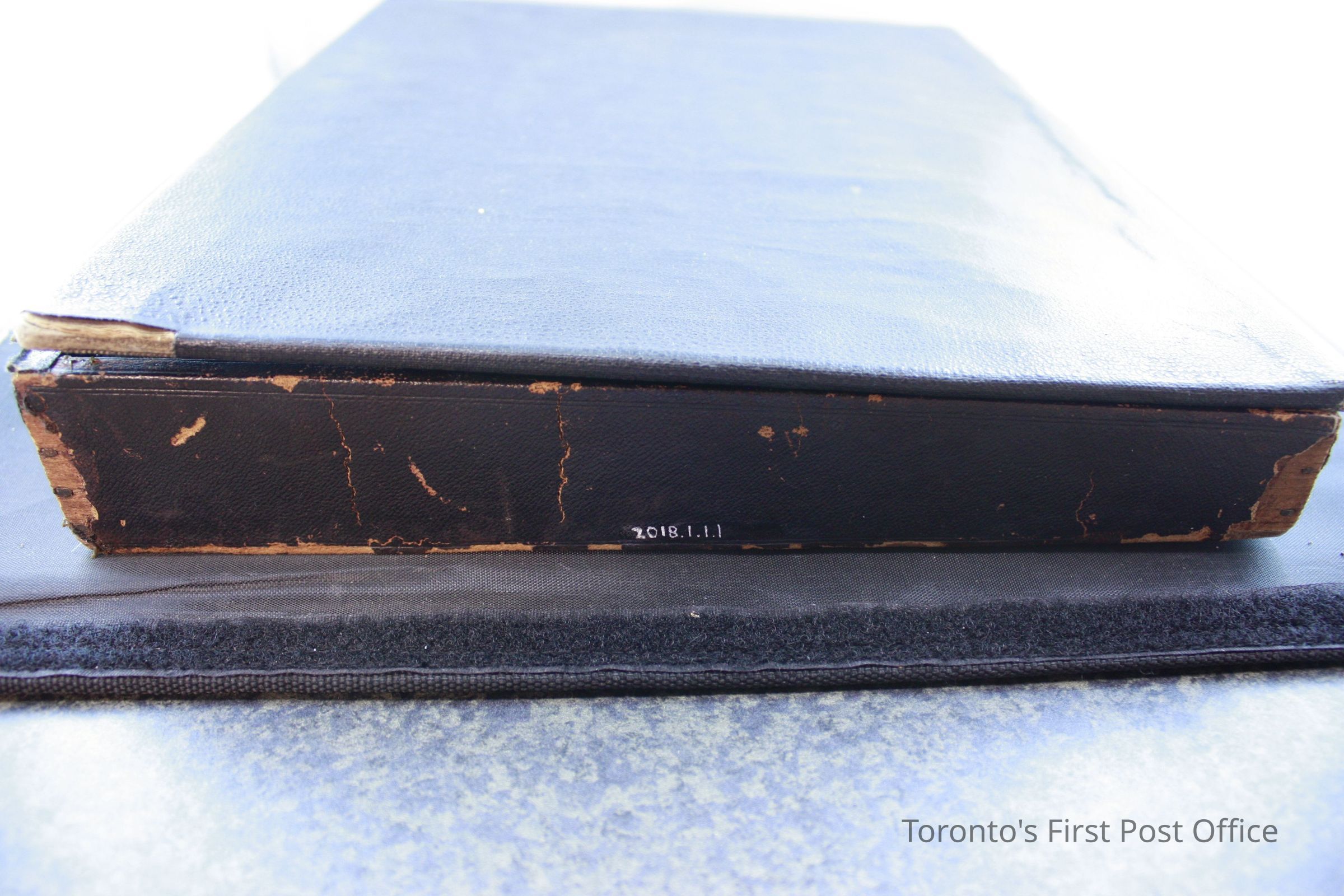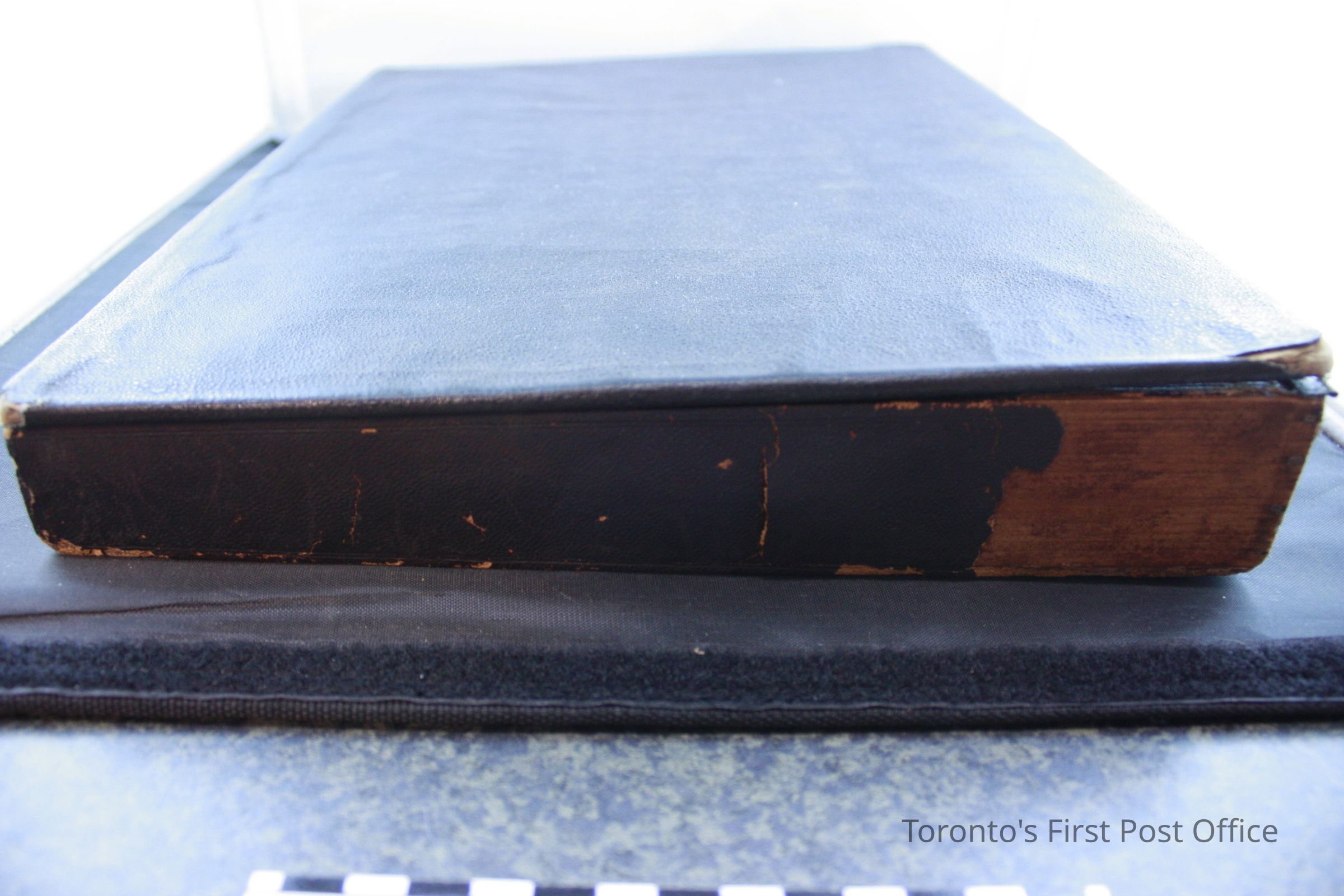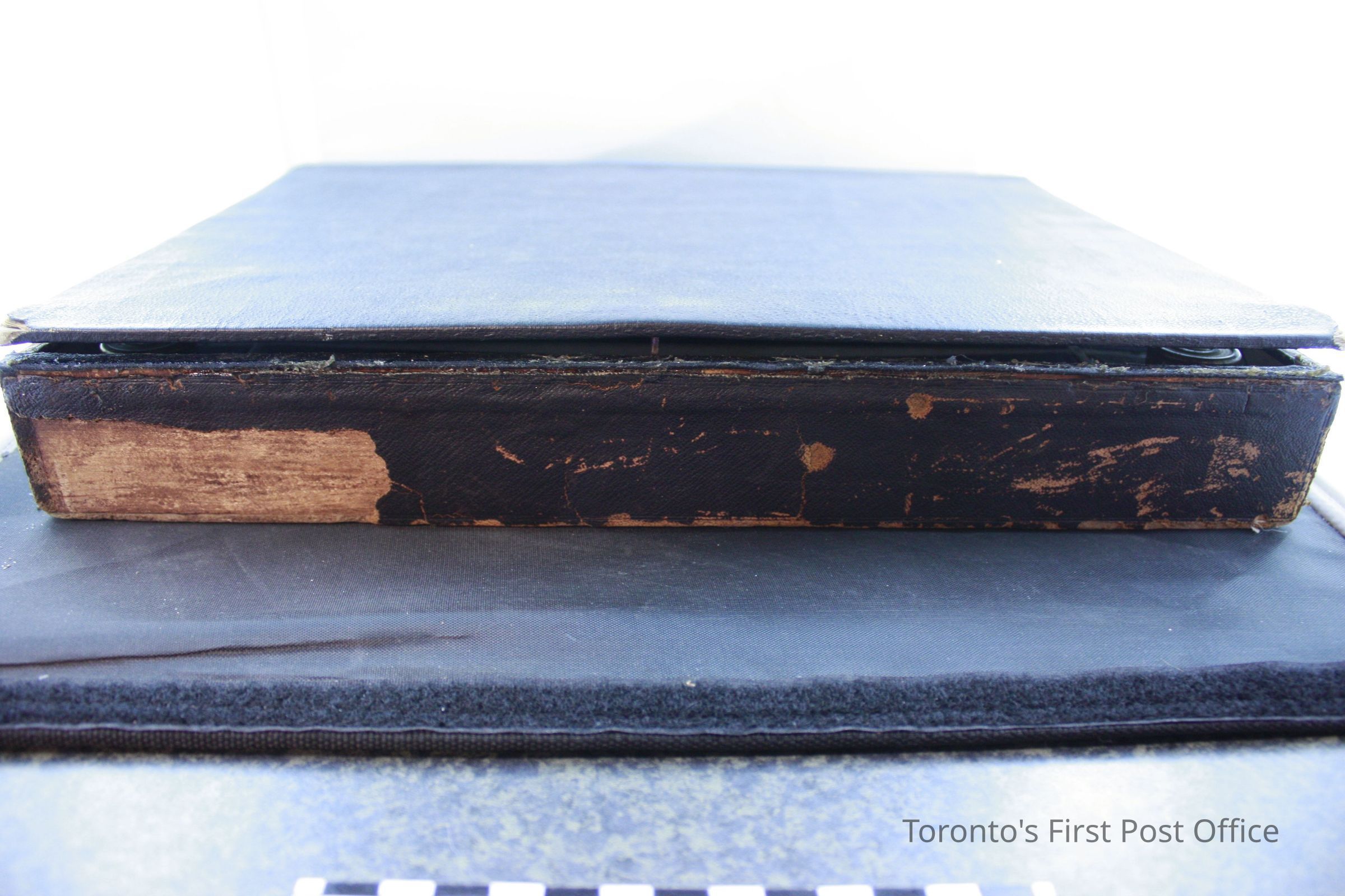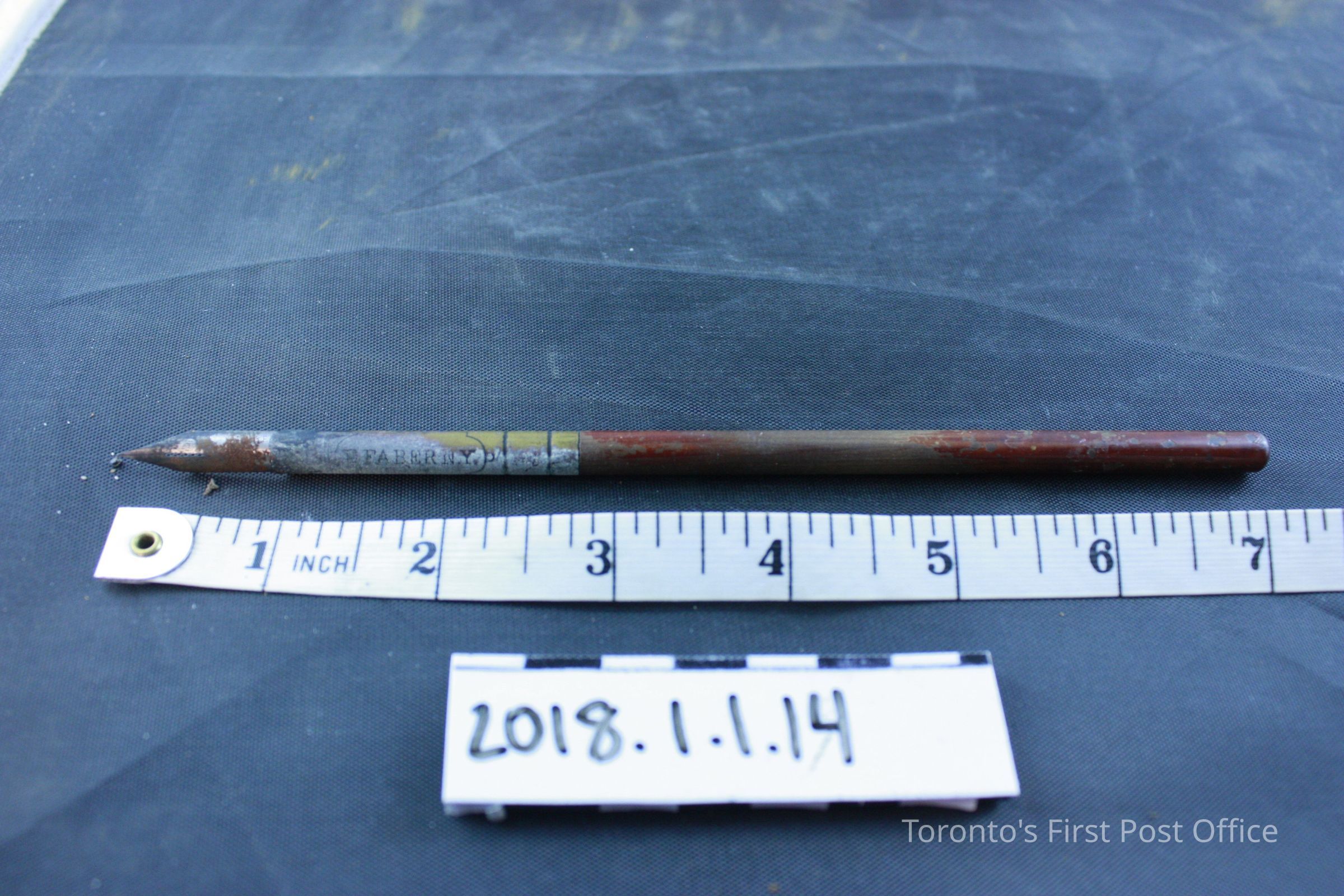 Wood and leather postal lap desk with key that opens the box. Inside the box has 4 compartments, with 2 compartments at the right side labelled "Postage Stamps" and "Pens". Contents in the box include: Used red sealing wax partially stamped "Sutton", two pieces of black sealing wax, bag of assorted clips and caps, used eraser printed "A.W Faber's Improved Artists' Rubber" on one side, stamp head with "C.G.H" stamped on front plate, two travelling inkwells, black vulcanized India rubber ruler with one side stamped "Goodyear's Patent 1849-1851 Poppenhusen & Konig", metal pen nib case that contains 6 pen nibs, box of pen nibs titled "100 Pens, A.W Faber" that contains 10 pen nibs, dark red pencil with ivory cap and brass tip with label "No. 3 * A.W Faber's Patent Aug. 13th 1861", and wooden straight pen with brass nib case stamped "Faber N.Y".Dimensions