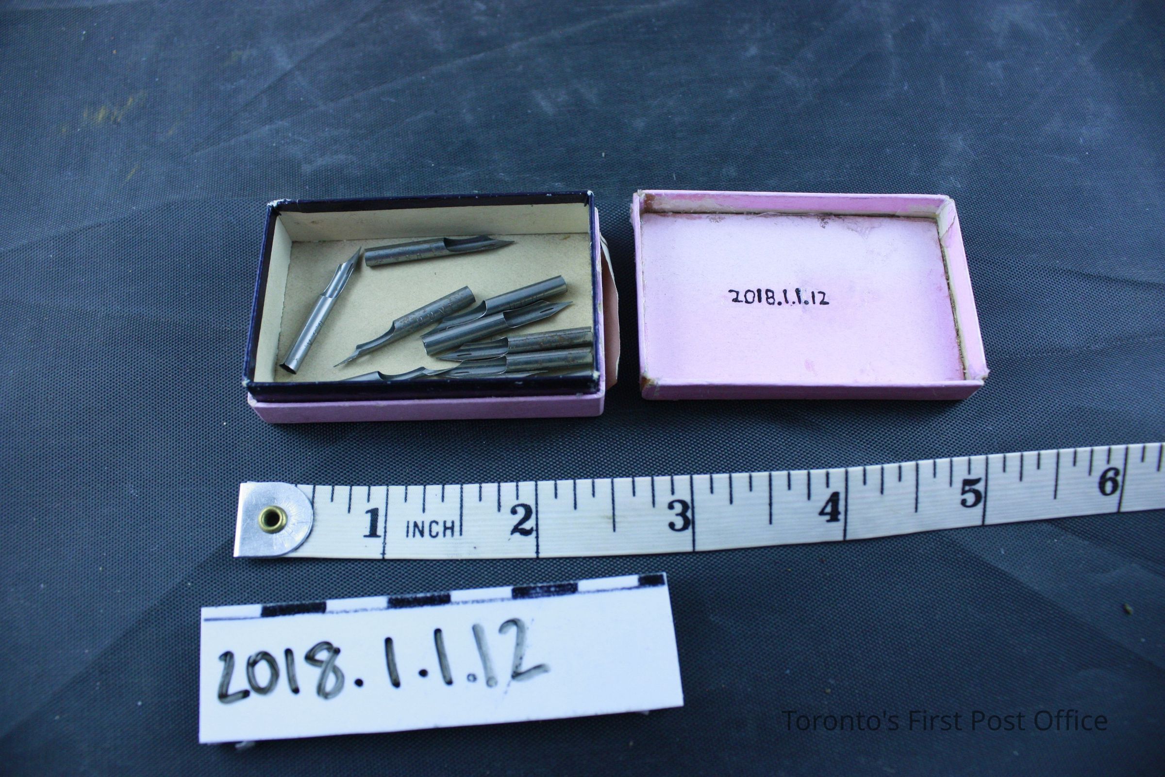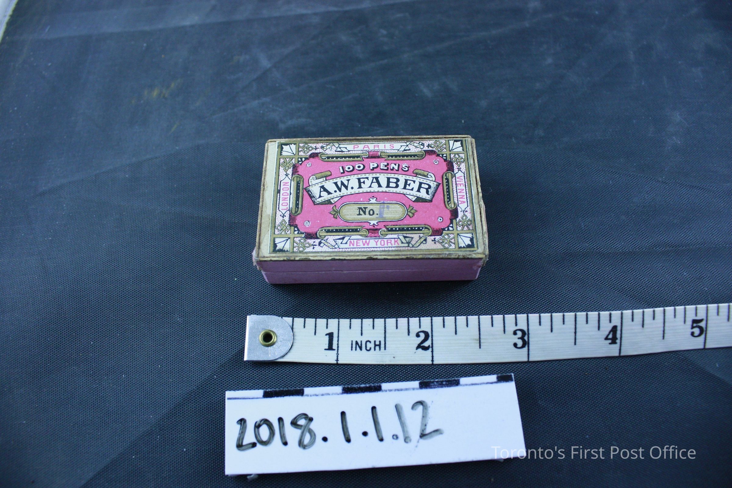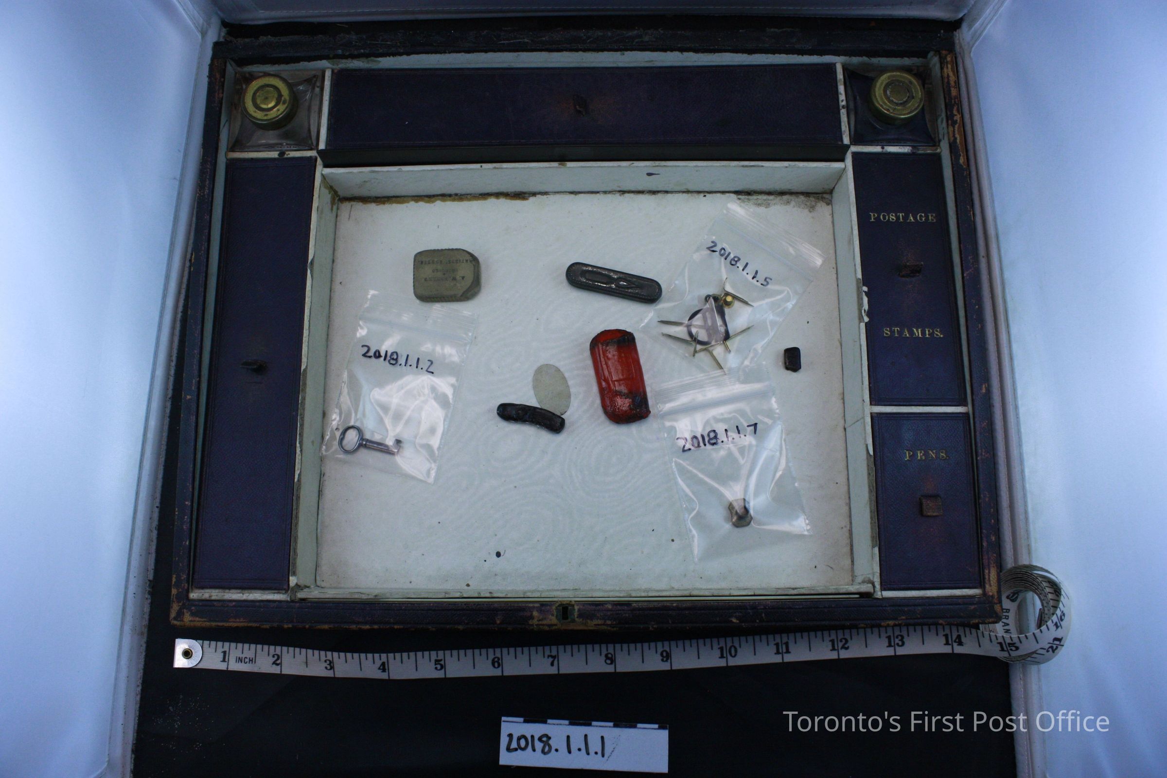 Box: 35.5 cm L, 27.1 cm W, Key: 2.7 cm, Red sealing wax: 4.3 cm, black sealing wax: 3 cm, Eraser: 3.1 cm, Stamp: 1.1 cm, Inkwells (.8 and .9): 4.2 cm L and W, 2.8 cm H, Ruler: 24.5 cm, Metal nib case: 4.5 cm, Pen nib box: 5.9 cm L, 3.7 cm W, 1.5 cm H, Pencil: 16.7 cm, Pen: 18.6 cm, Assorted Parts: 1 cm to 2.8 cmUpdate Date