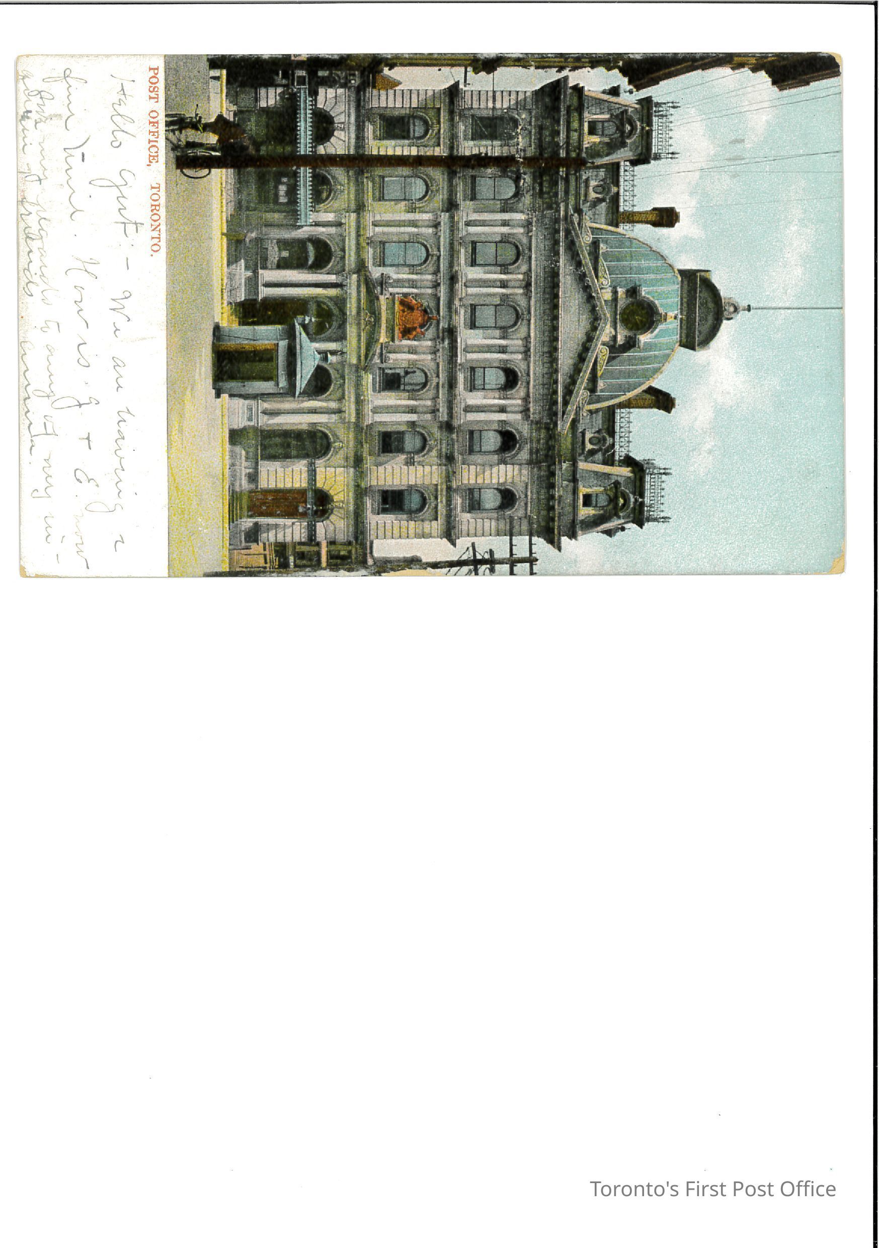 Postcard of "Post Office, Toronto"; colour-tinted; addressed on reverse to "Miss Gertrude Pierce Freeborn Ave. E. Providence R.I."; note and address in brown manuscript; stamped "TORONTO CAN. NOV 11 5-PM 1907" and cancelled in black ink; postage stamp is a green "Canada Postage One Cent" with King pictured; note inquires after friends, mentions cool weather; signed "Anna"(?).Update Date