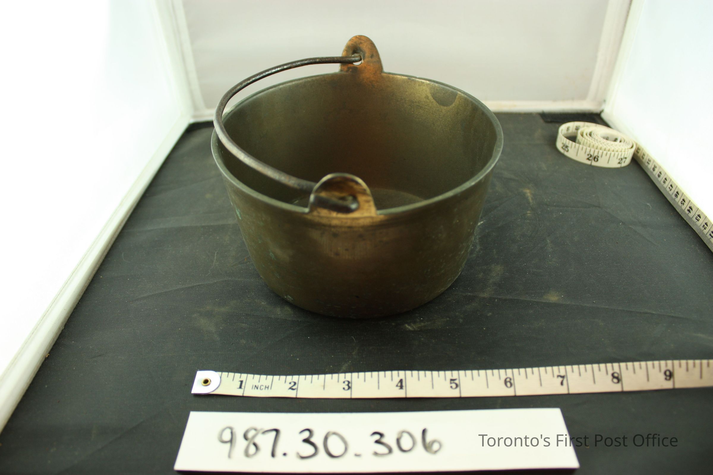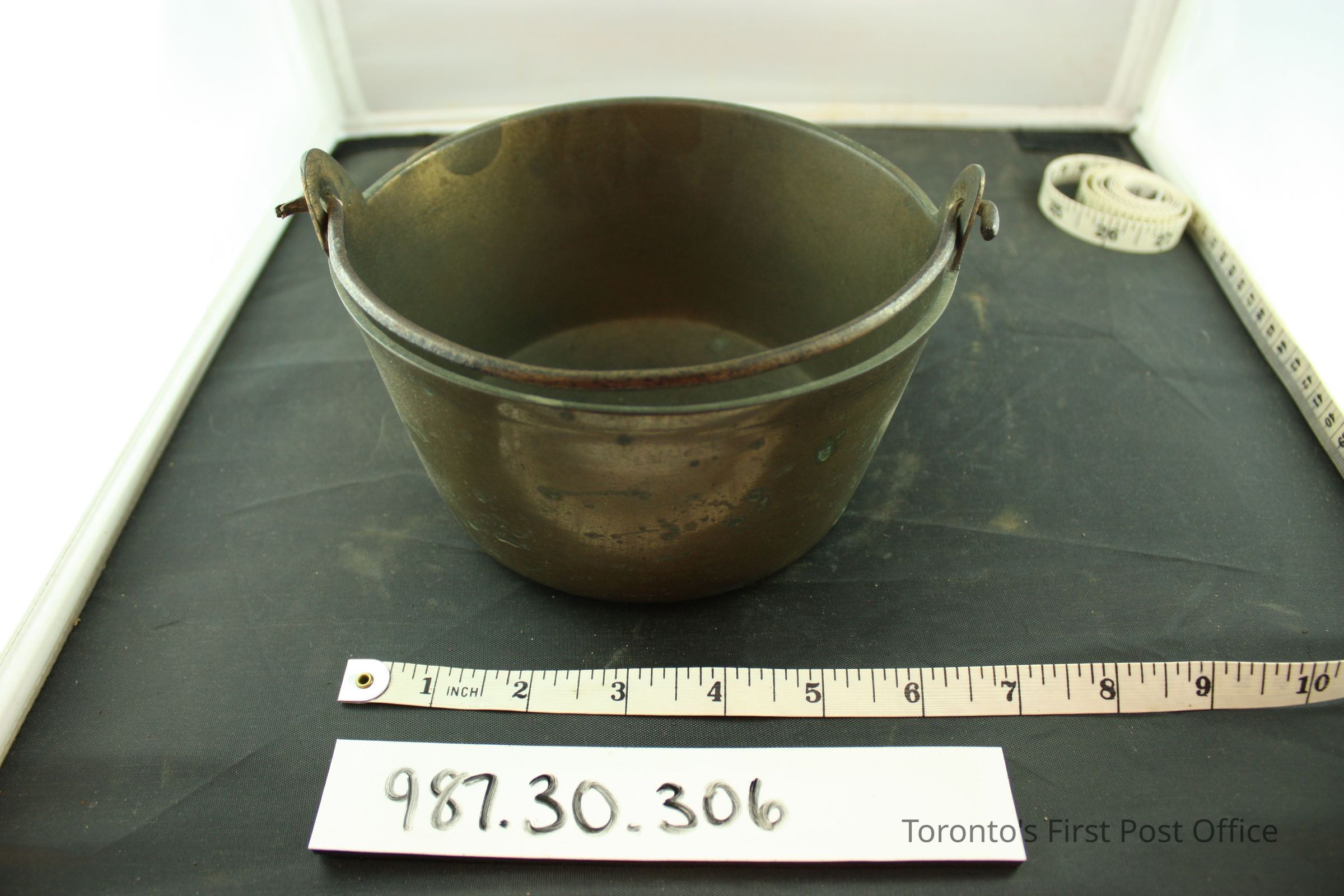 Brass pot with swing iron handle; slightly oval.Dimensions