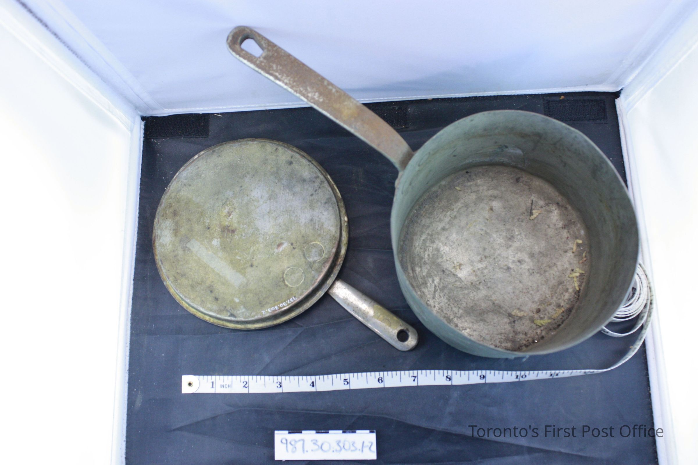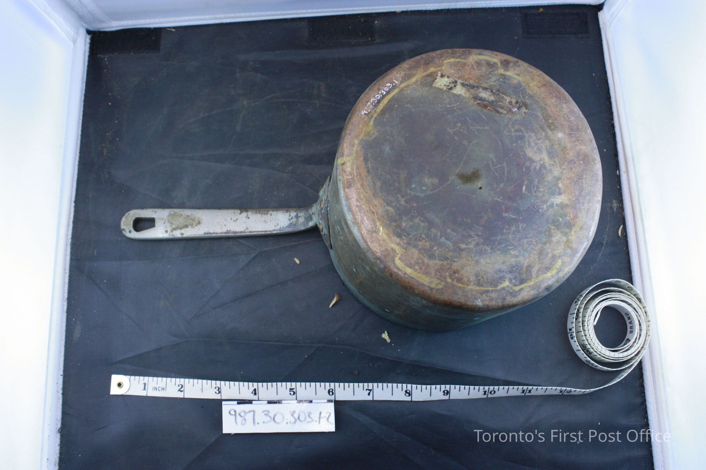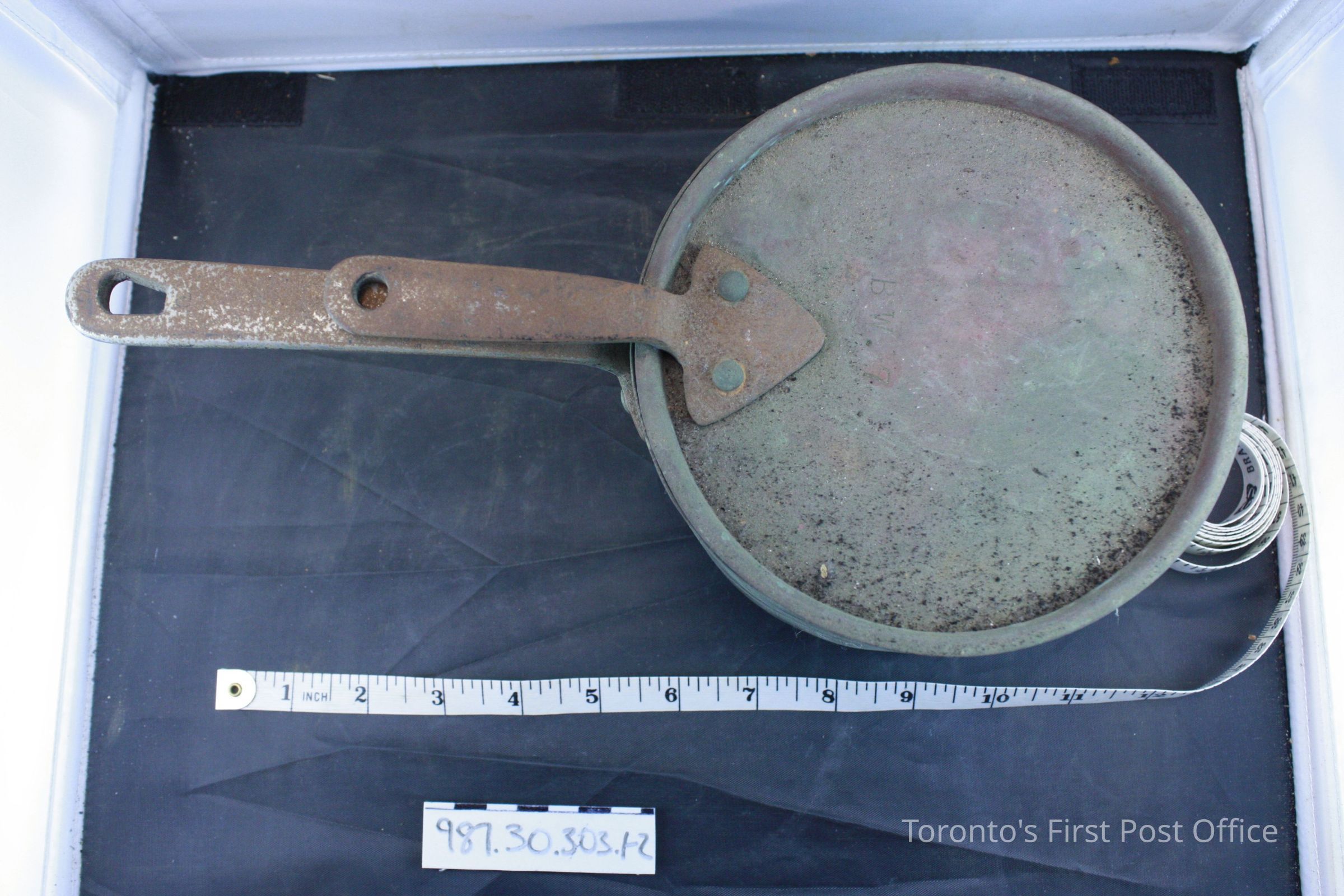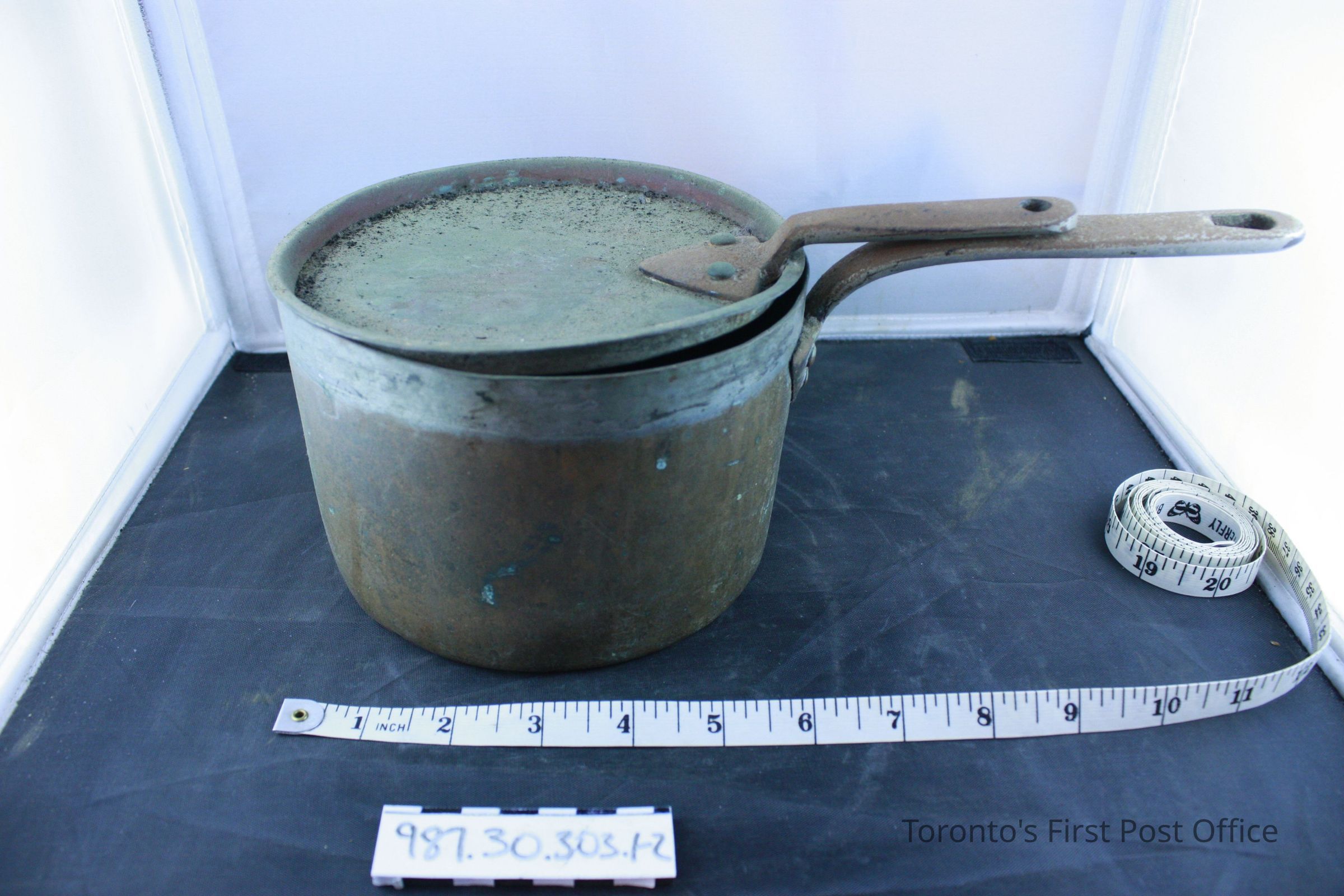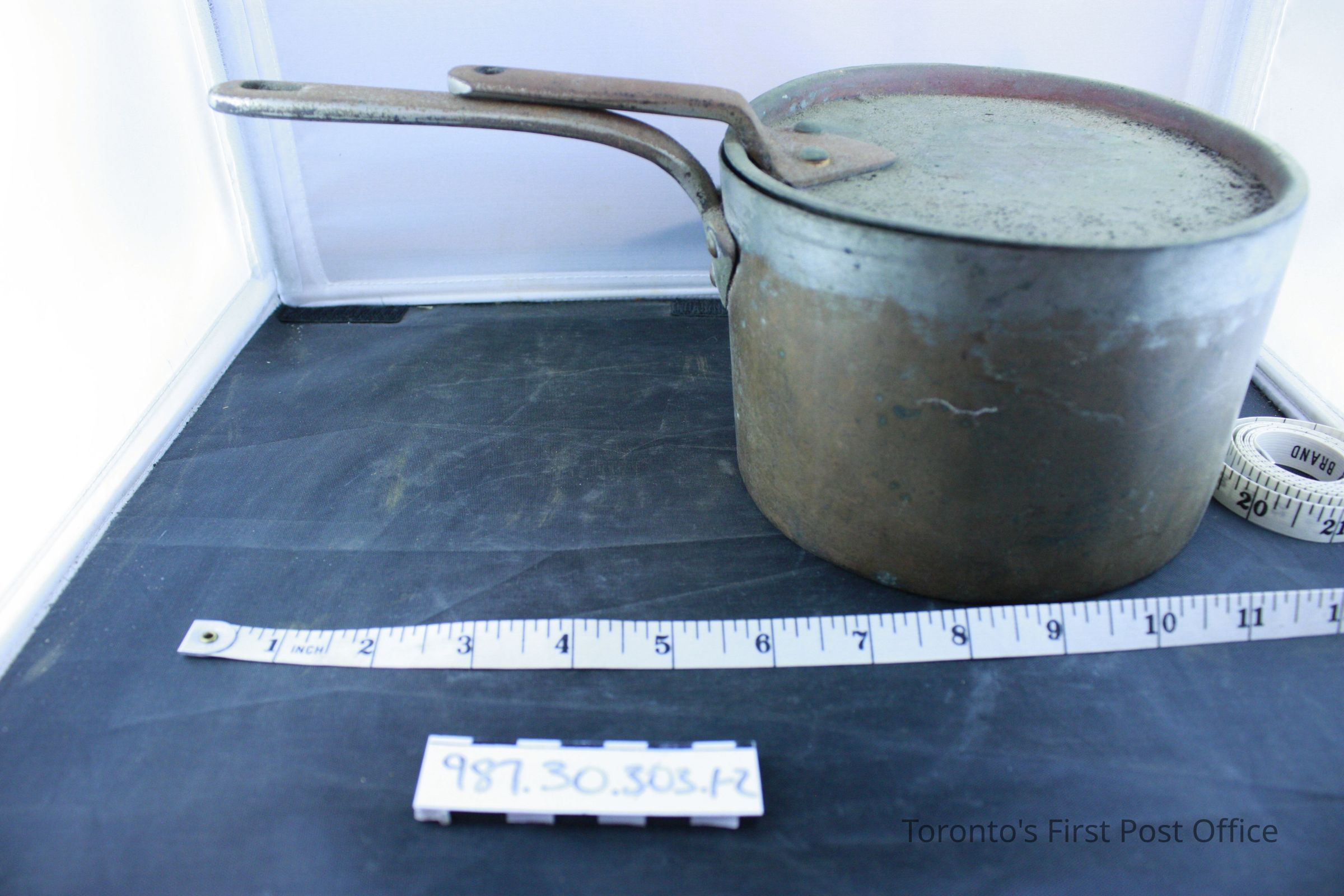 .1 = copper exterior; interior is tin lined; imprinted: "B.W.10"; with handle joined with three rivets; .2 = copper; imprinted on top: "B.W.7"; with cast iron handle with hole at end; handle attached with two rivets.Dimensions