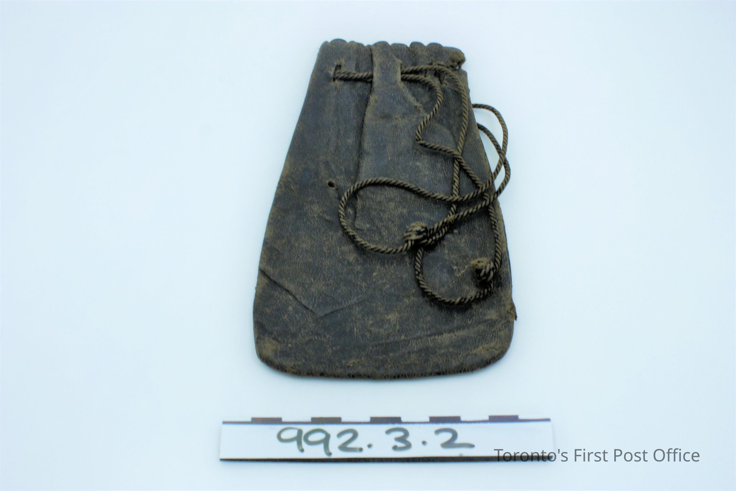 Brown leather pouch with drawstring; rectangular with scalloped upper edge.