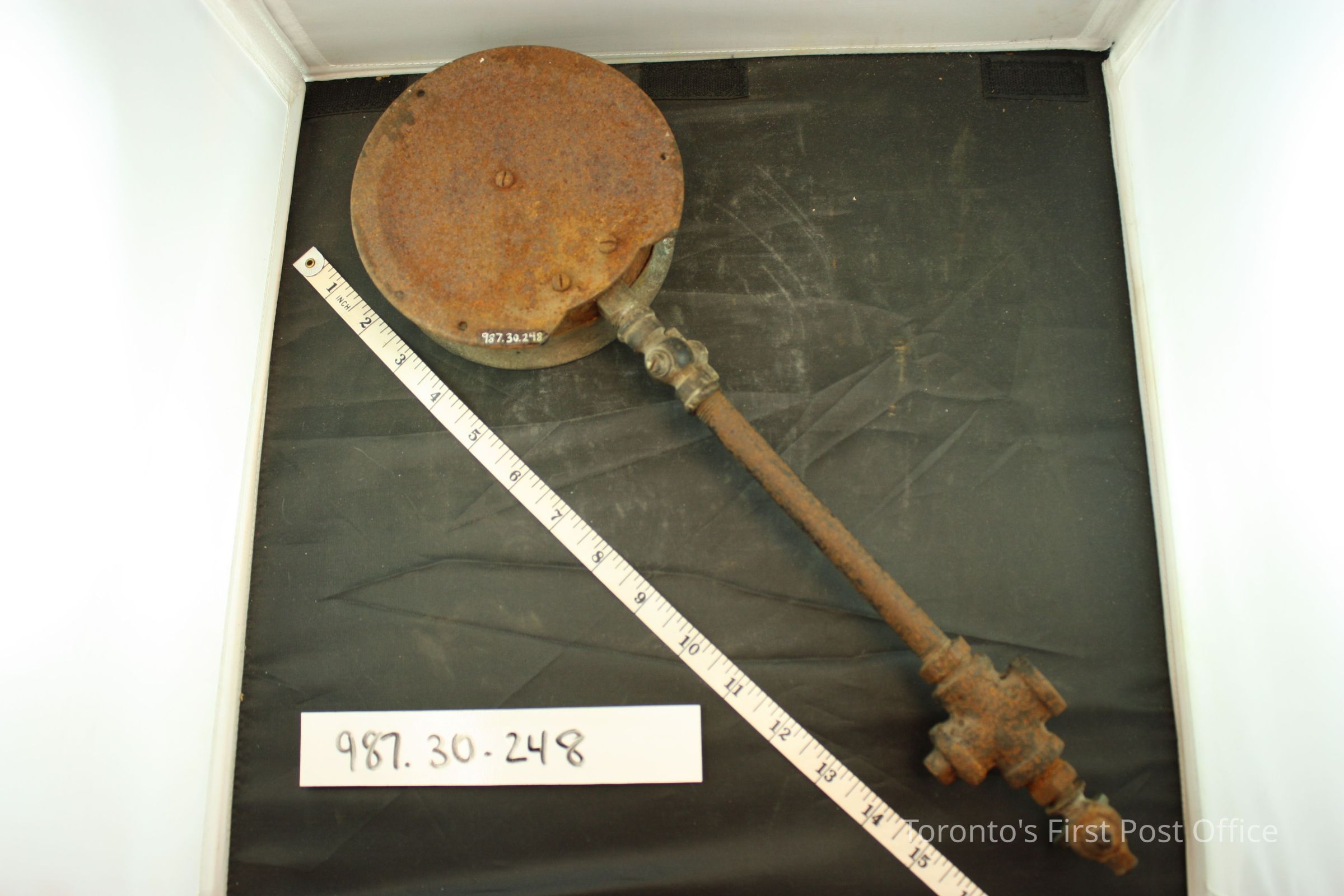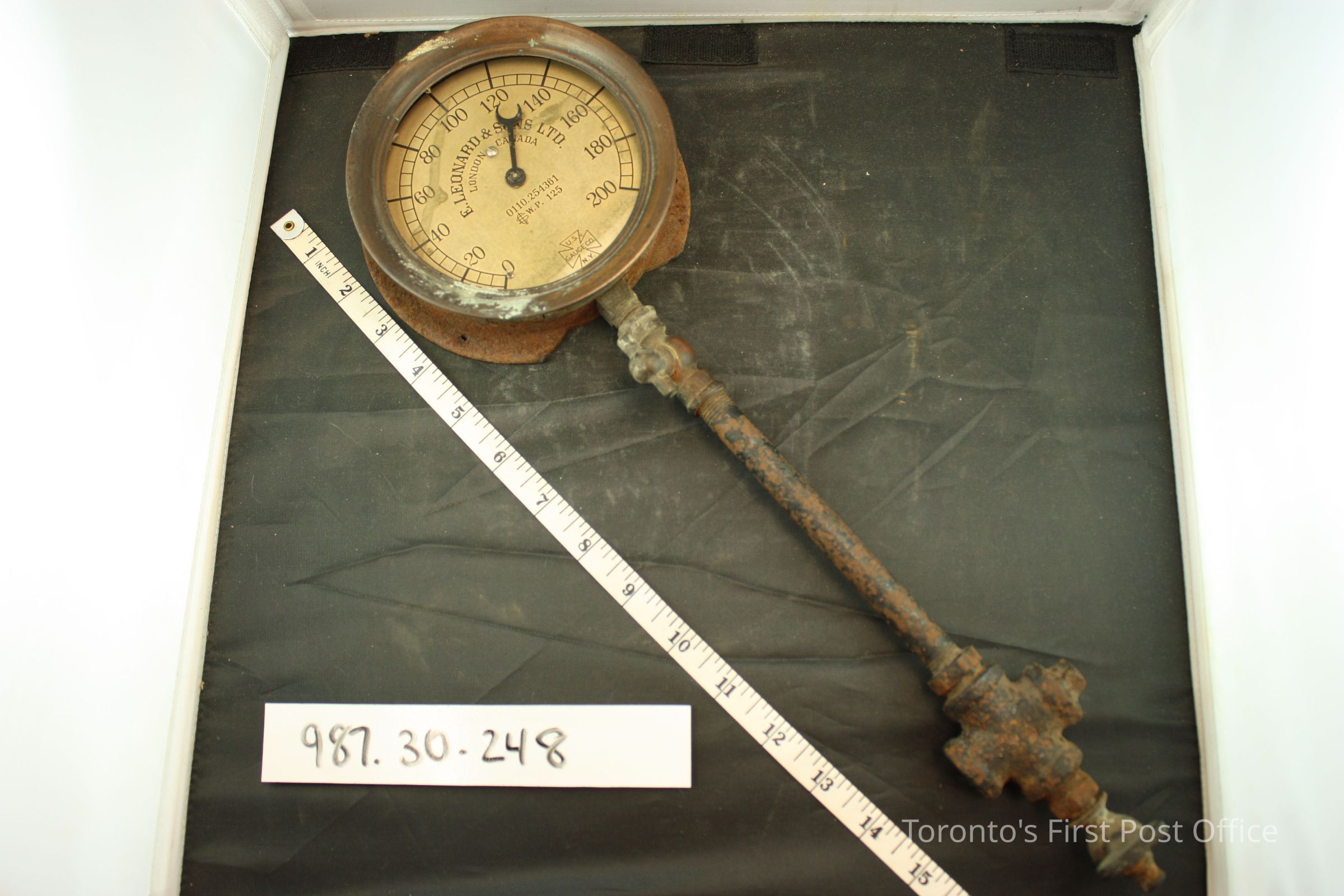 Pressure gauge; brass and iron; lettering printed in black: "E. LEONARD & SONS LTD. LONDON CANADA 0110.254361 W.P.125"; manufactured by U.S. Gauge and Co. N.Y."; removed from obsolete steam boiler in basement behind DeLaSalle, 1980; circa 1900.Dimensions