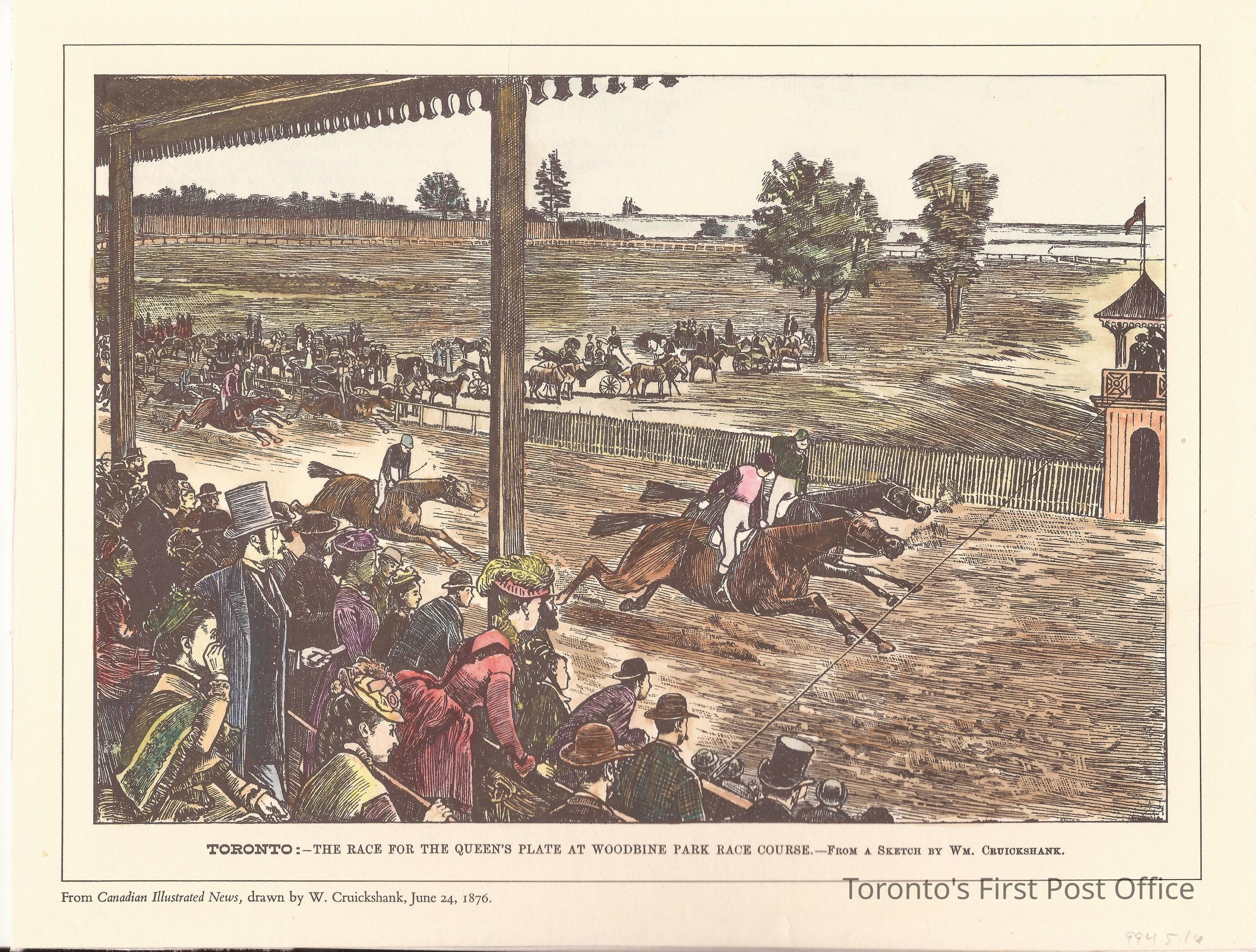 Print: "Toronto - The Race for the Queen's Plate at Woodbine Park Race Course"; from a sketch by Wm. Cruickshank; from the Canadian Illustrated News; drawn by W. Cruickshank June 24, 1876; shows: spectators watching race, Lake Ontario; hand-tinted in red, green, blue, yellow, brown, and orange.Update Date
