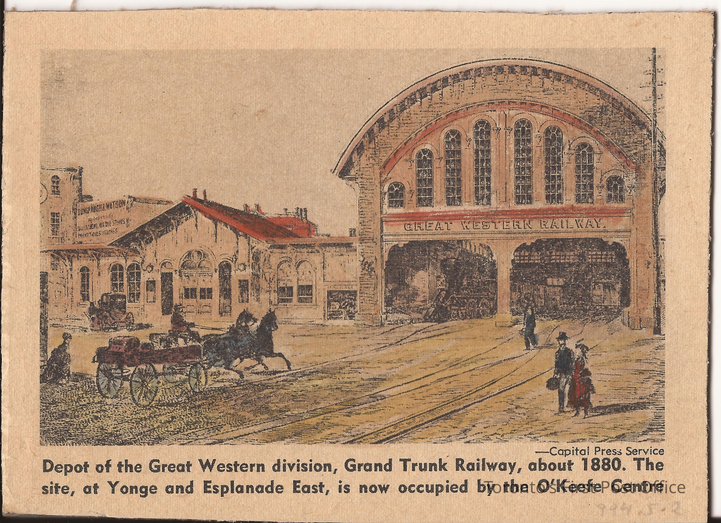 Print: "Depot of the Great Western Division, Grand Trunk Railway, about 1880. The site, at Yonge and Esplanade East, is now occupied by the O'Keefe Centre"; handcoloured; printed by Capital Press Service.Dimensions