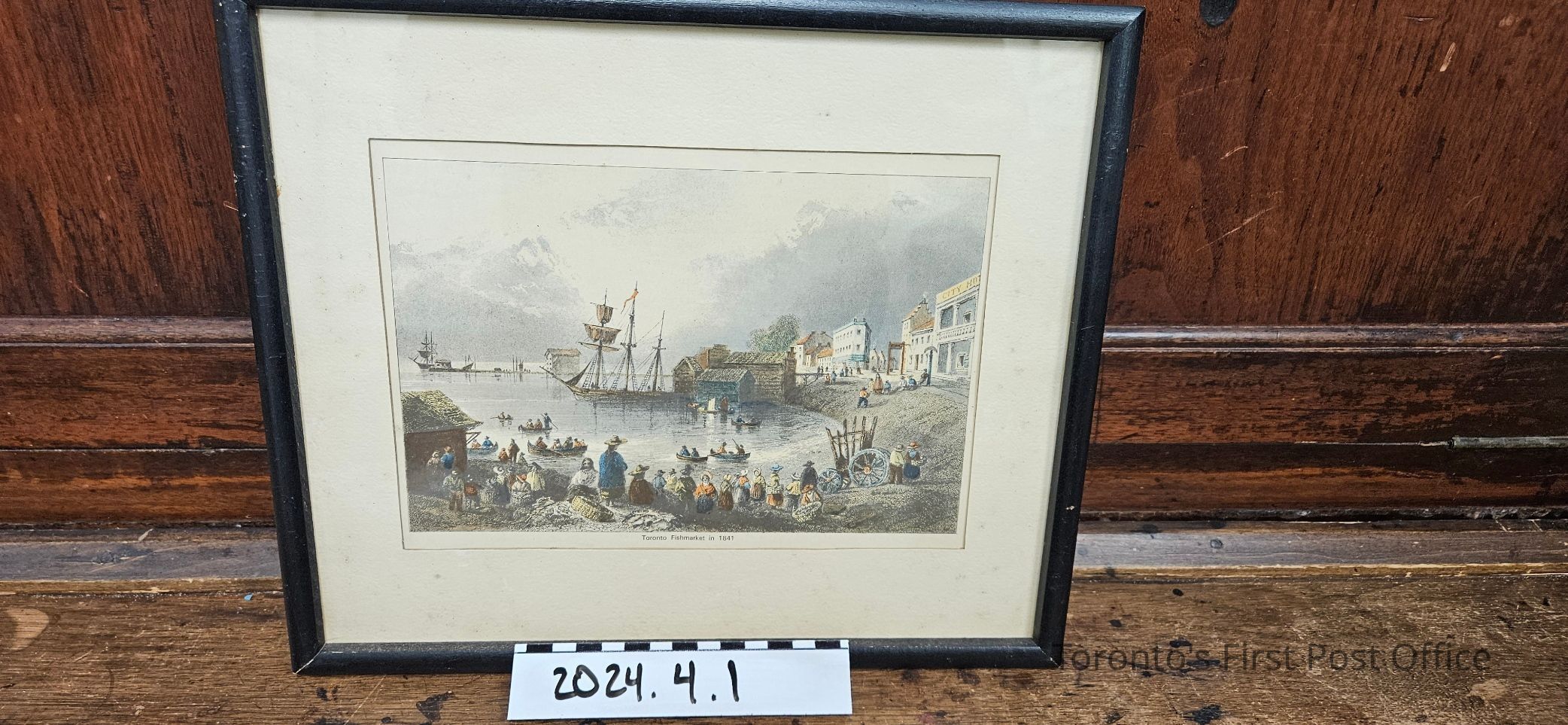A matted and framed print of the "Toronto Fishmarket in 1841". It is a coloured print depicting people hanging around a harbour, with fishermen in the water. The frame is slightly worn and the paper is a bit discoloured and dirtyDimensions