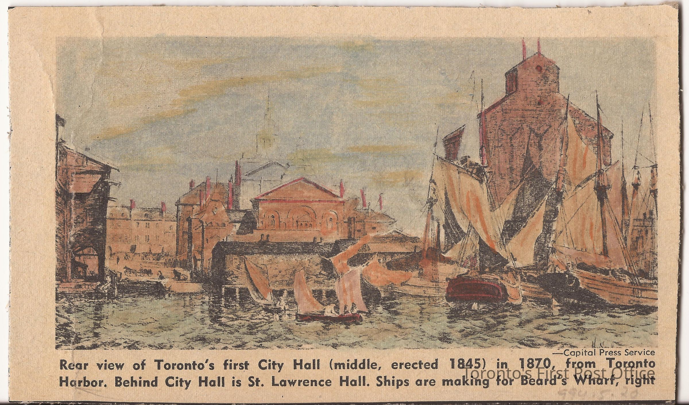 Print: "Rear View of Toronto's First City Hall in 1870"; shows City Hall, St. Lawrence Hall; ships and wharf; hand-tinted in orange, brown, red.Update Date