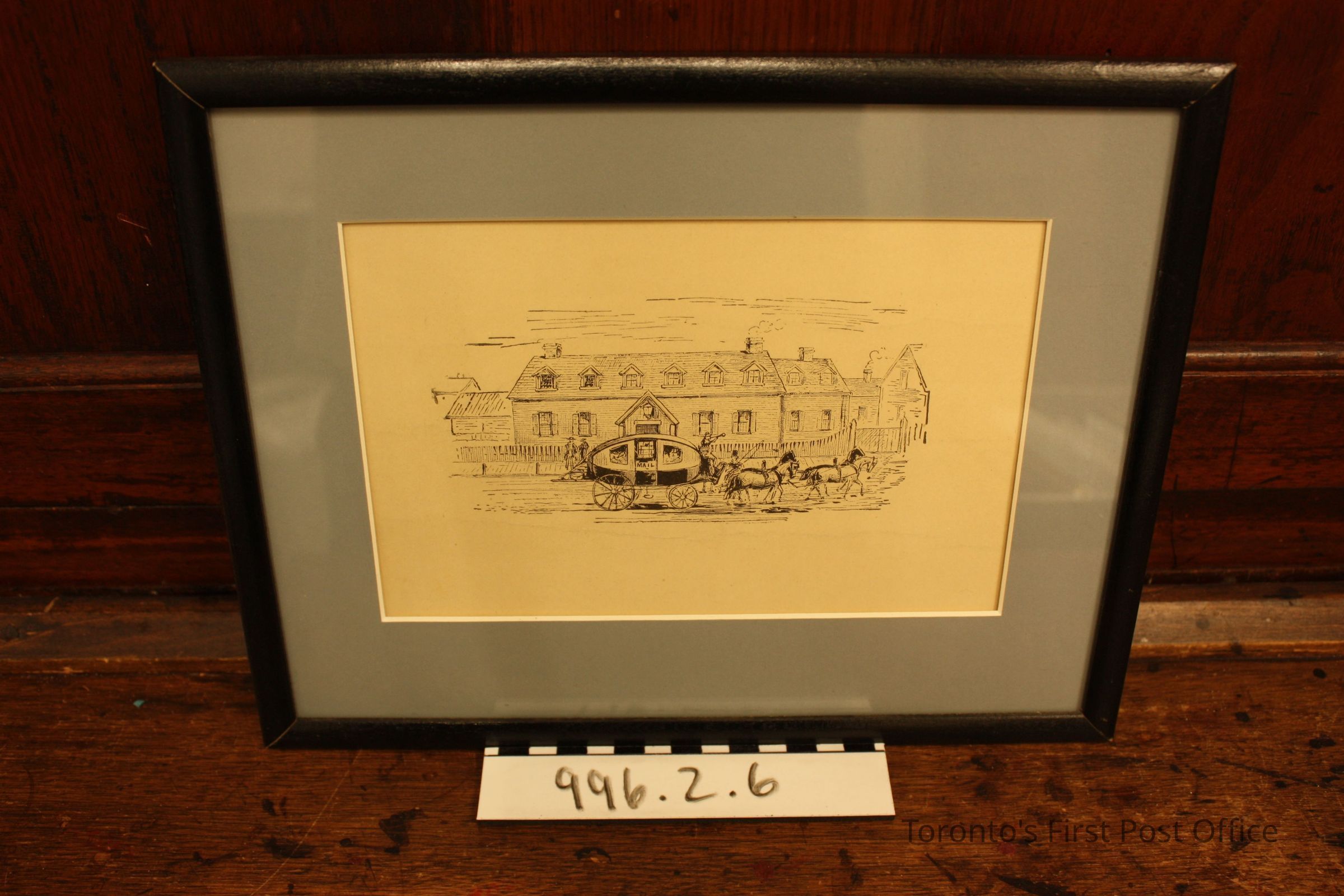 Print: "Jordan's York Hotel where Parliament met 1812-13"; unbleached cardstock; from J.R. Robertson Landmarks Vol. 1, p. 14; black line drawing.Dimensions