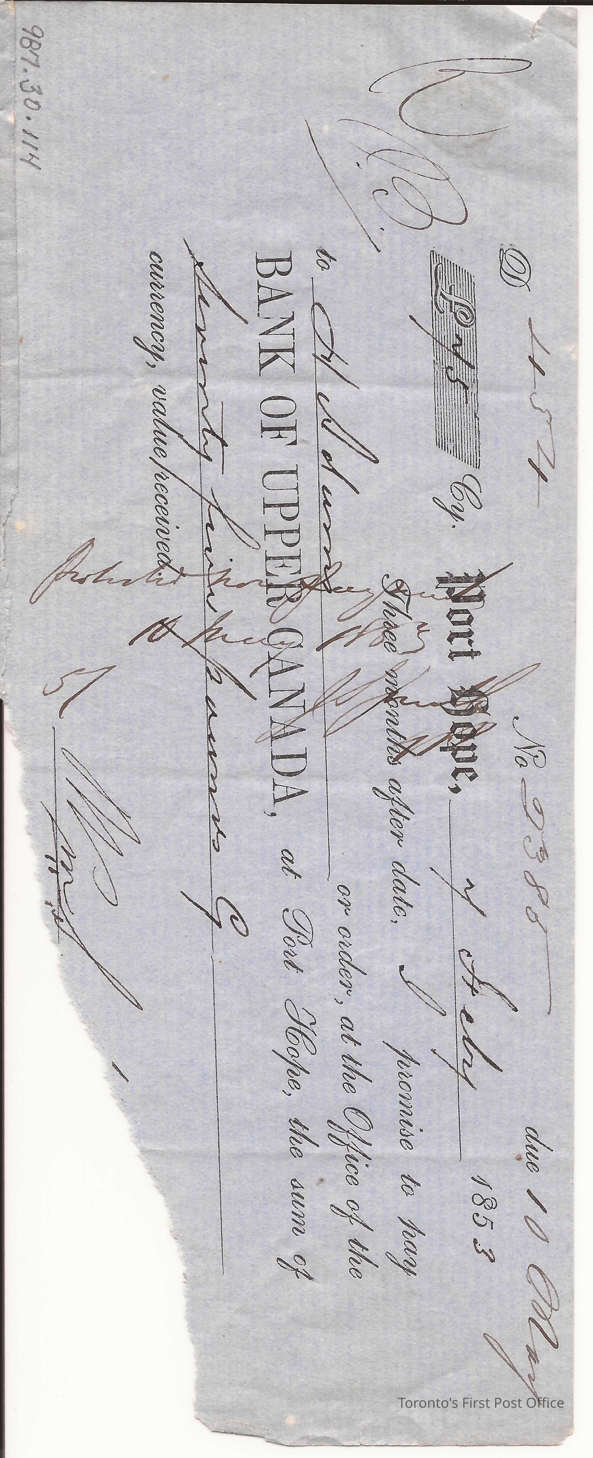 Promissory note payable to H. Adams at Bank of Upper Canada, Port Hope; signed Wm. S…; dated 7 Feby 1853; re: note #2383 for £75; light blue paper; black ink; printed and manuscript.Update Date