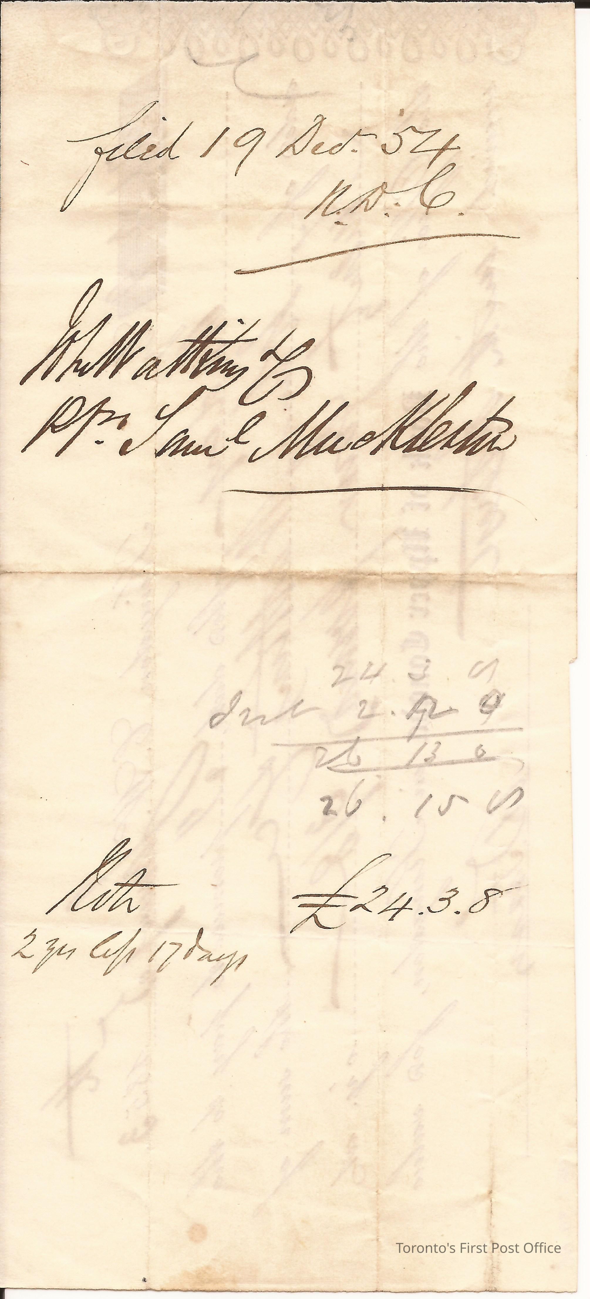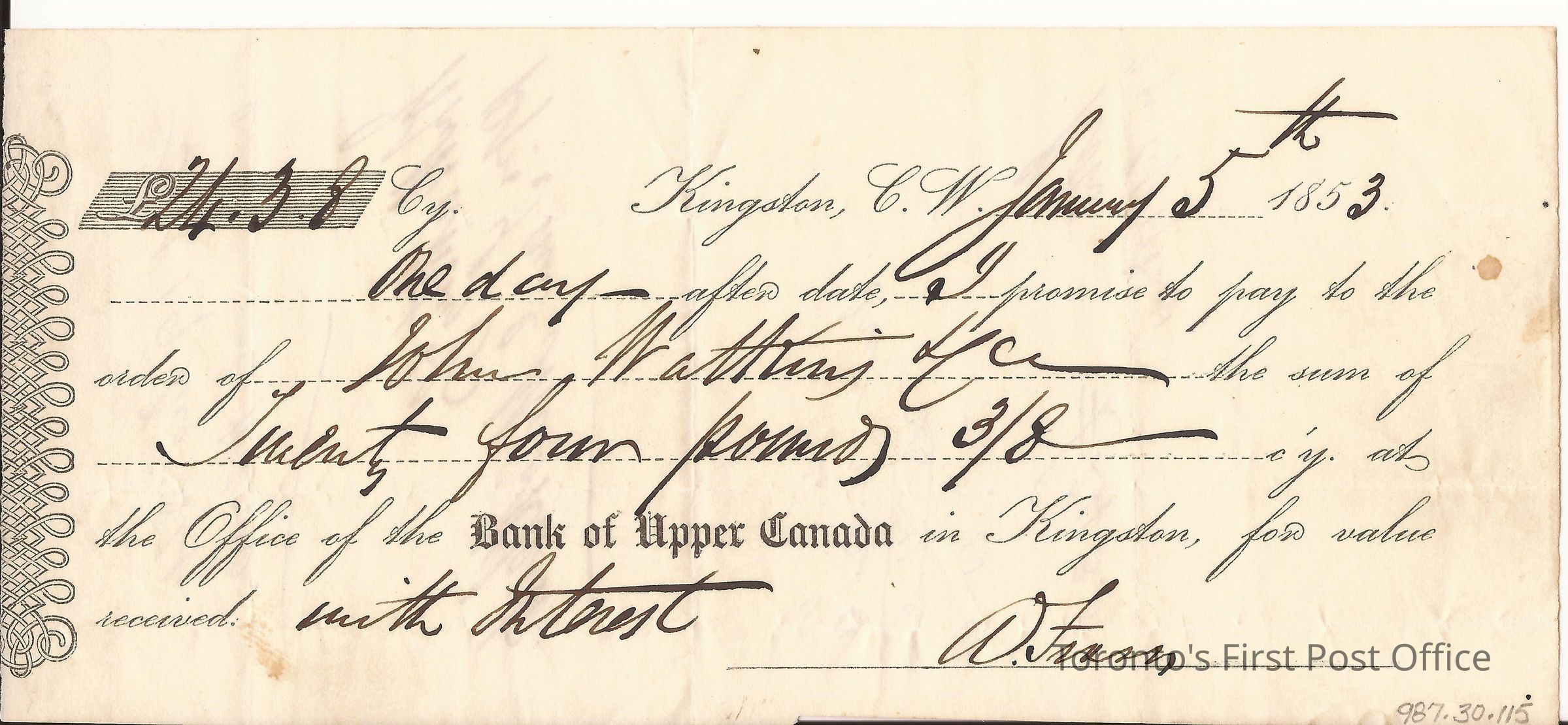 Promissory note in sum of £24.3.8 in favour of John Watkins at Bank of Upper Canada, Kingston; signed by W. Fraser; dated January 5th 1853; endorsed by John Watkins and Saml. MacKlester(?); unbleached paper; printed form letter filled in with black ink manuscript.Update Date