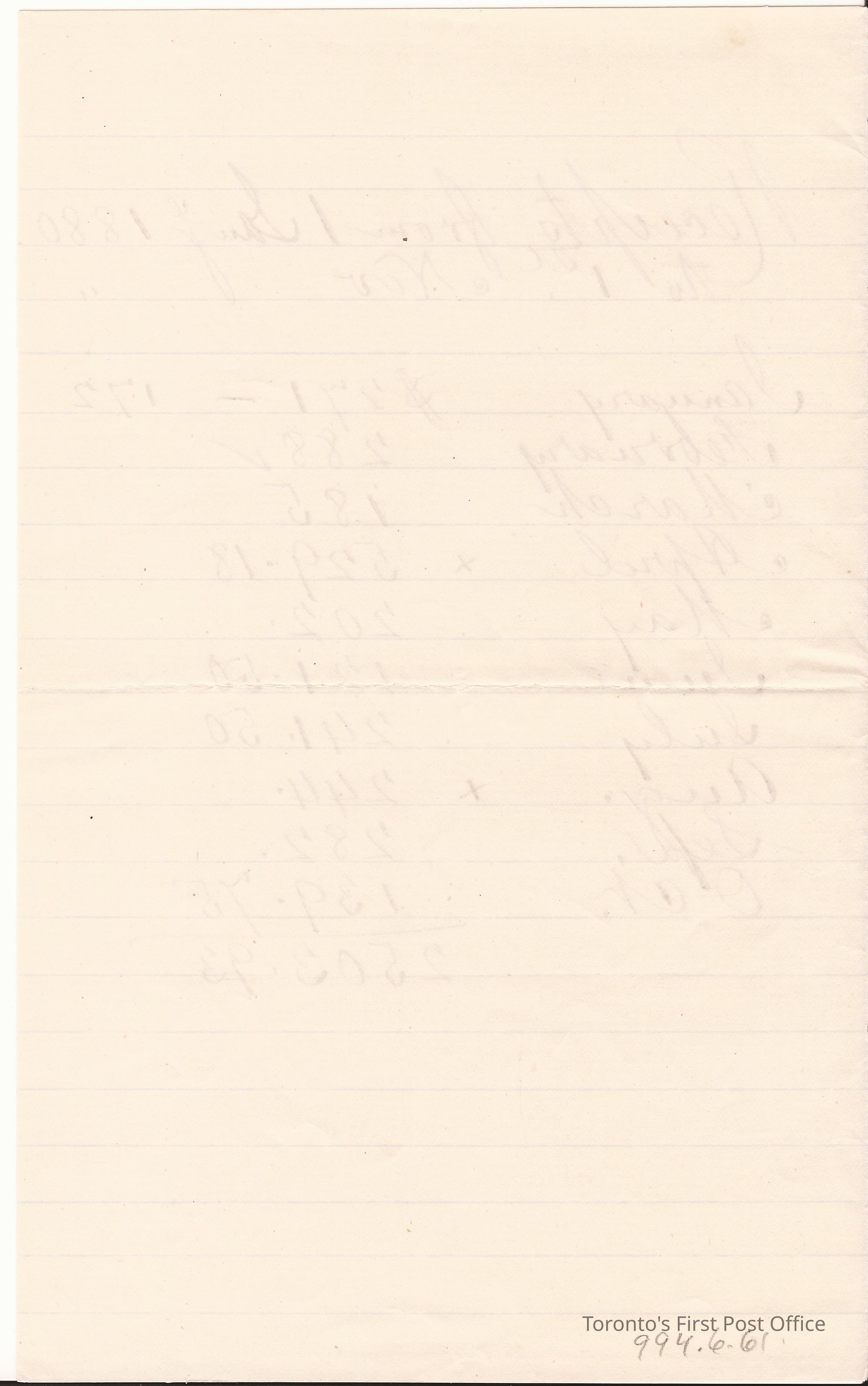 Receipt; dated from 1 Jany 1880- 1 Nov 1880; totaling $2503.93; laid paper with blue guide lines.Dimensions