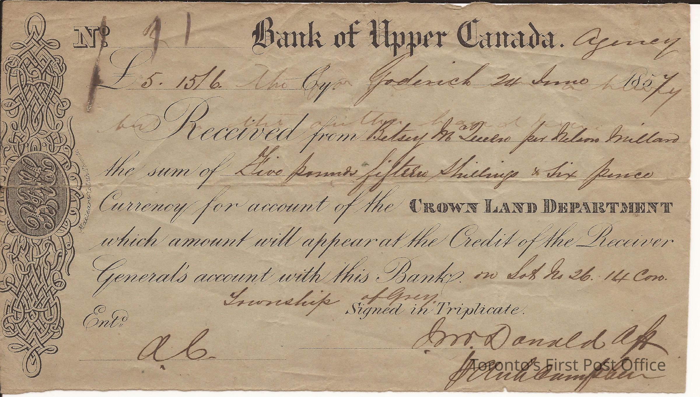 Bank of Upper Canada deposit receipt; received from Betsy McQueen for Nelso Millan the sum of 5 pound, 15 shillings, 6 pence; green paper with black printing; Bank of Upper Canada medallion and scroll design; dated: 1857.Dimensions