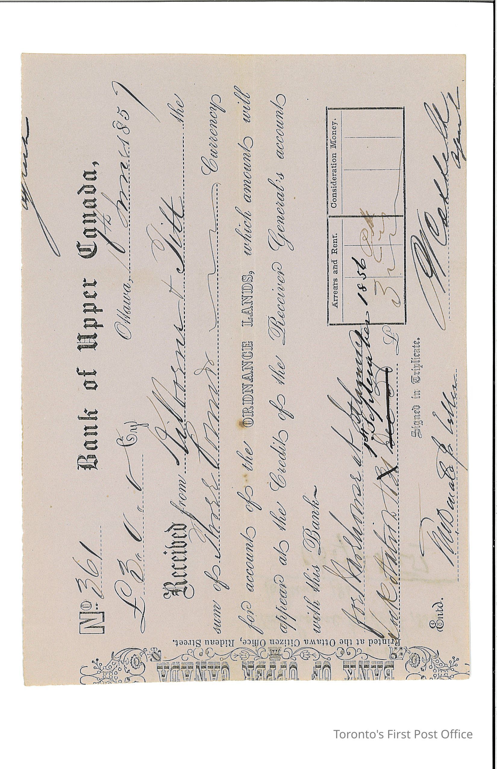 One Bank of Upper Canada receipt #361; for £3/0/0; received from Kilborns(?) and Tett, for rent of Ordinance Land; signed by a "Teller" and "Agent"; on buff paper in printed script and black ink manuscript; note on reverse; "BANK OF UPPER CANADA Printed at the Ottawa Citizen Office, Rideau Street." printed along left edge of front; dated June 16, 1857.Dimensions