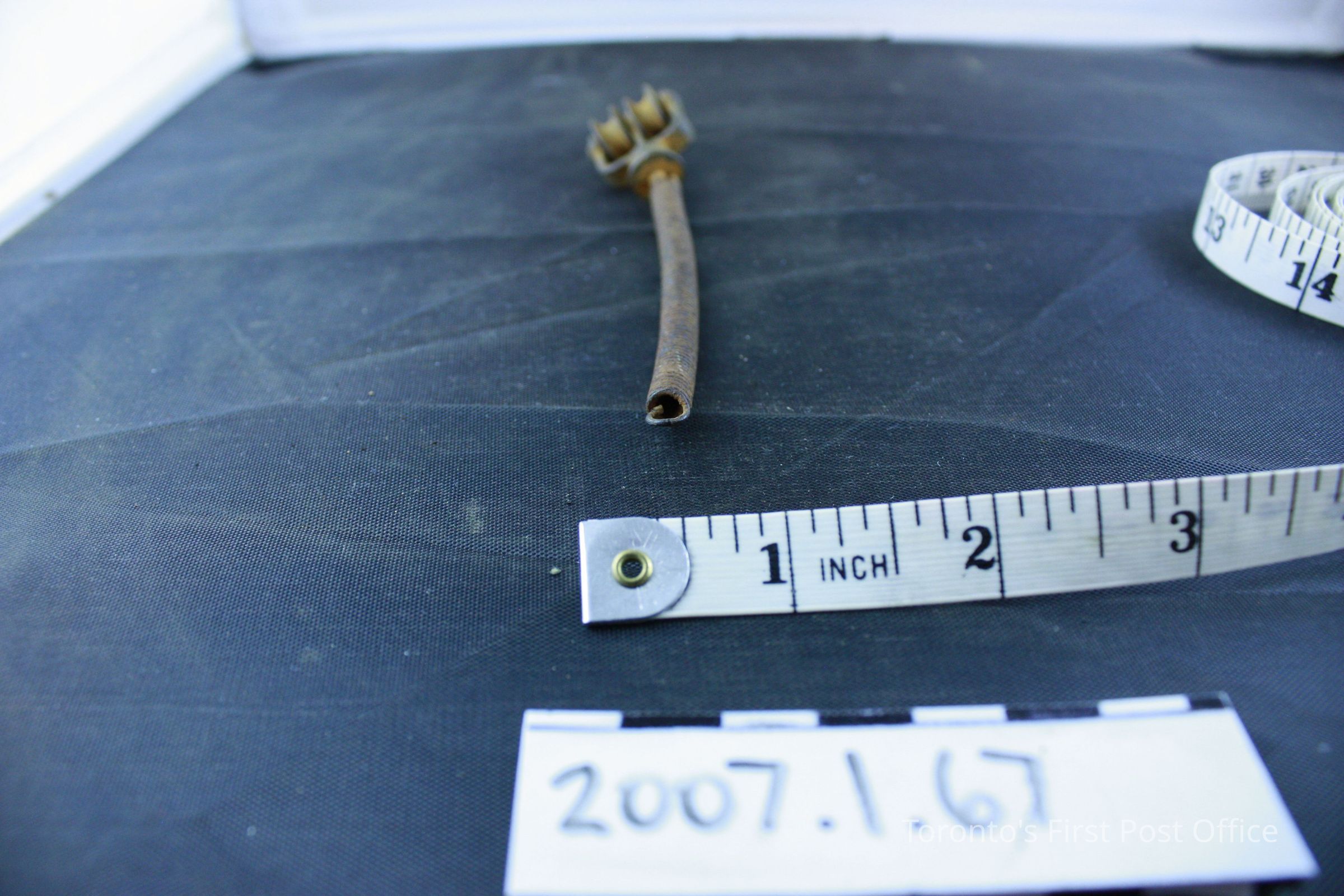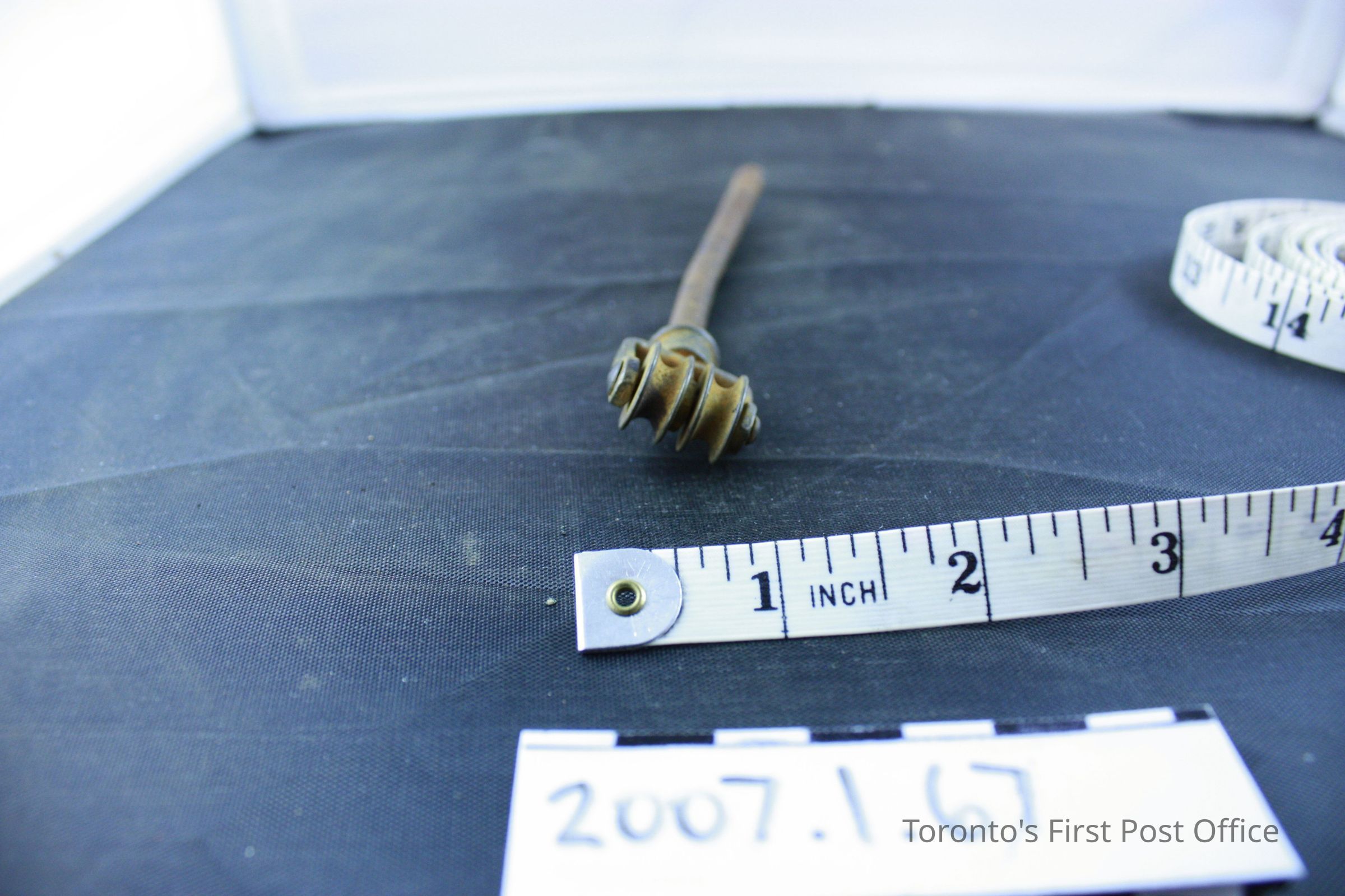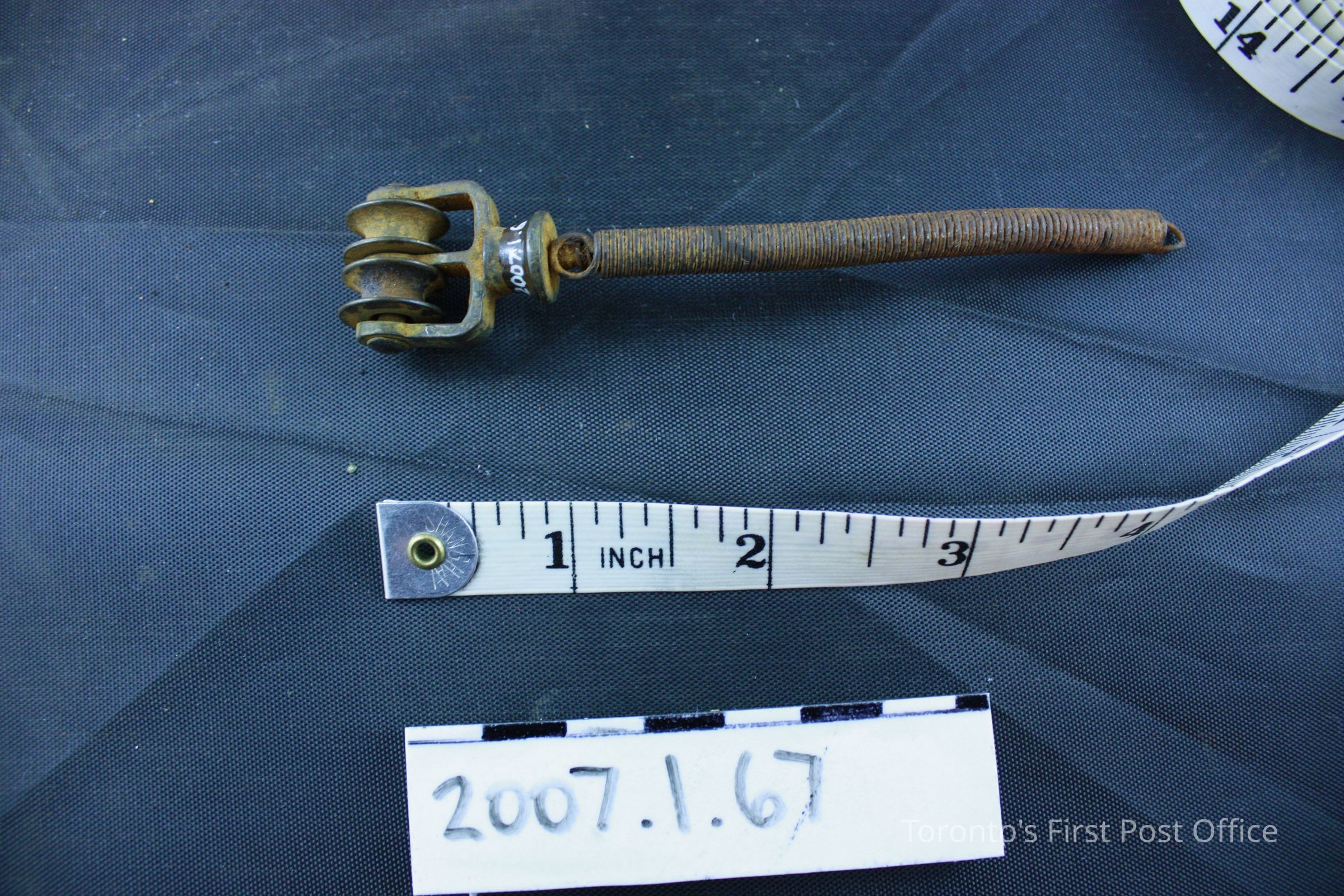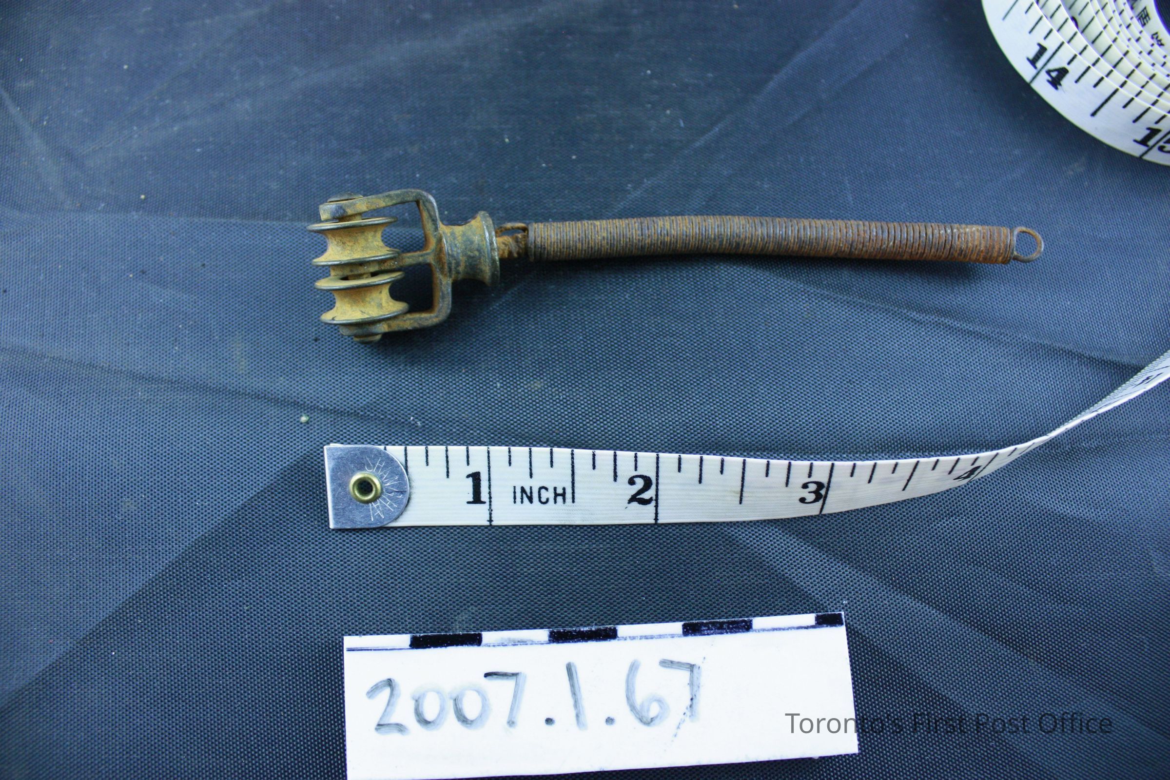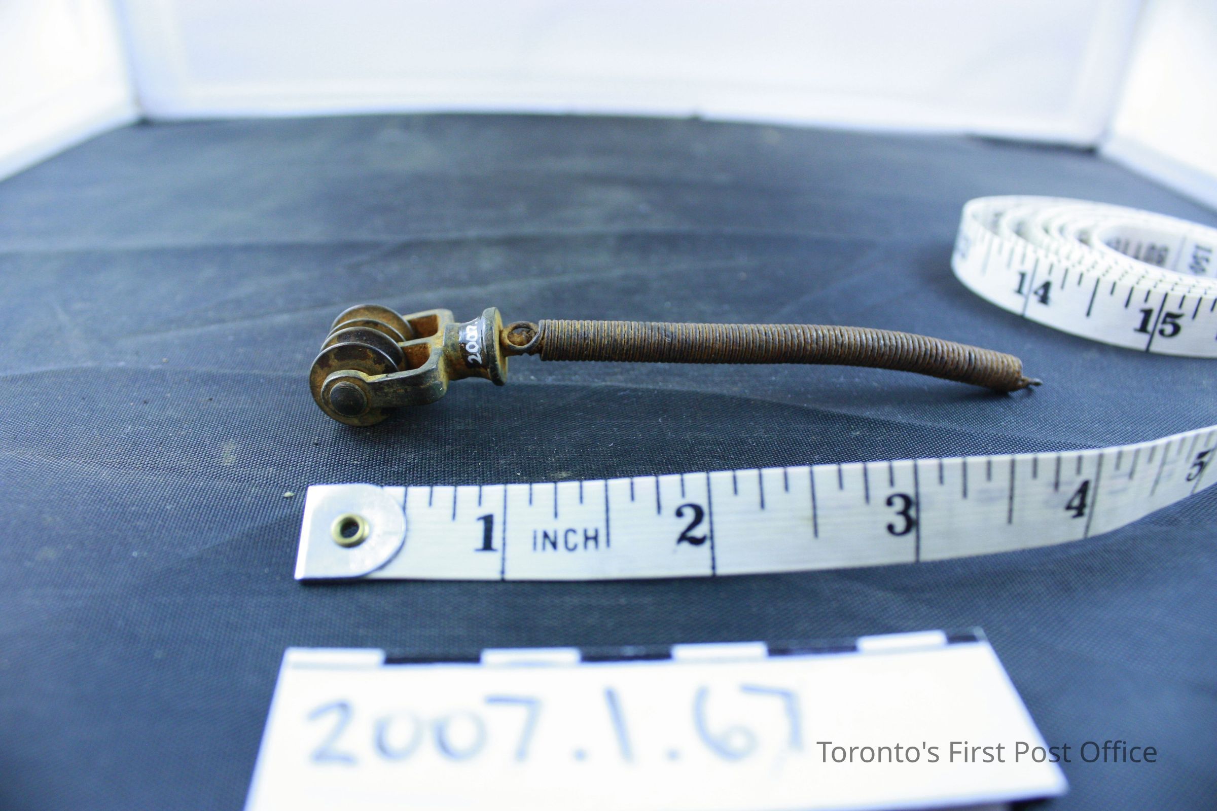One metal remnant; tight spring with loop at end; head on other end has pin with two rollers for cord or chain (possibly for curtains?); removed from Bank of Upper Canada Building during renovations; c. 19th C.Dimensions