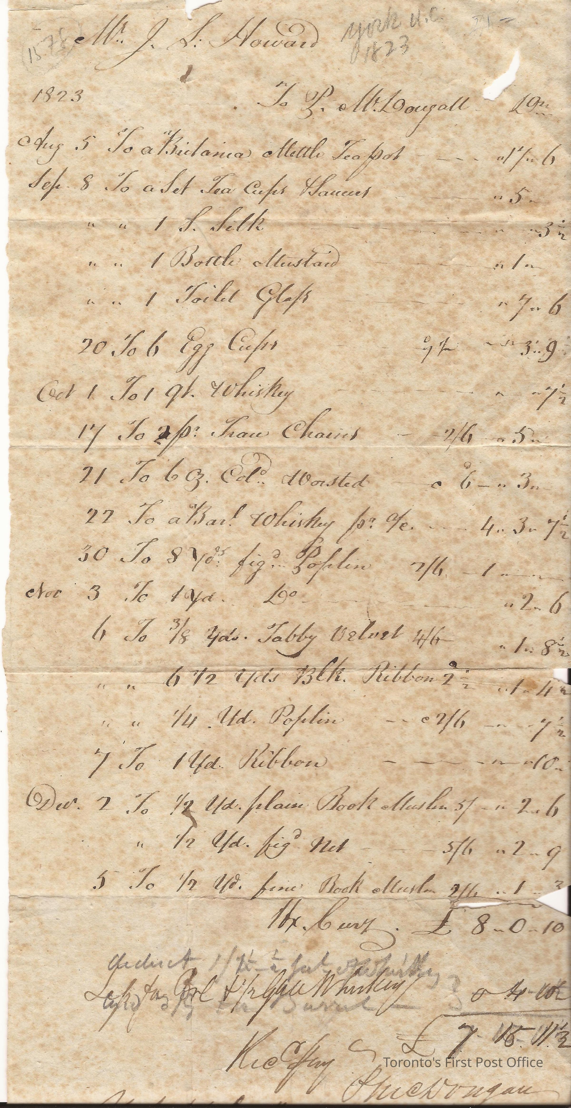 Sales bill, long thin list of sales at P. McDougall's store to J.S. Howard between August and December 1823.