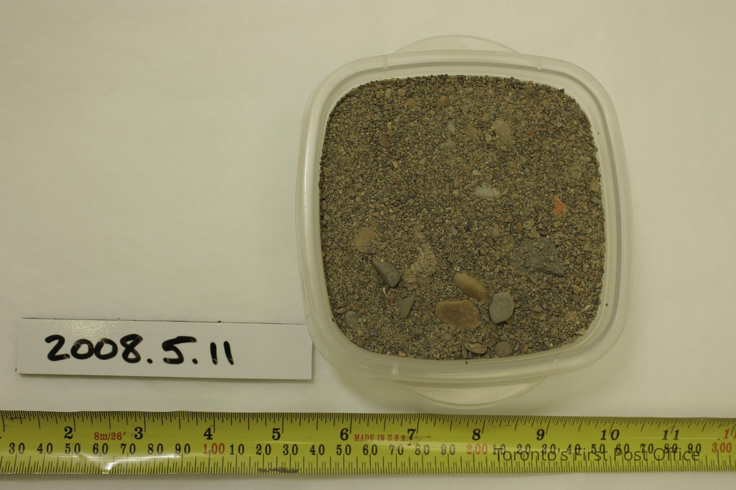 Sample of sand containing few stones, pebbles, pieces of brick. Excavated from 17" level during construction at 49 Front St. E.Update Date
